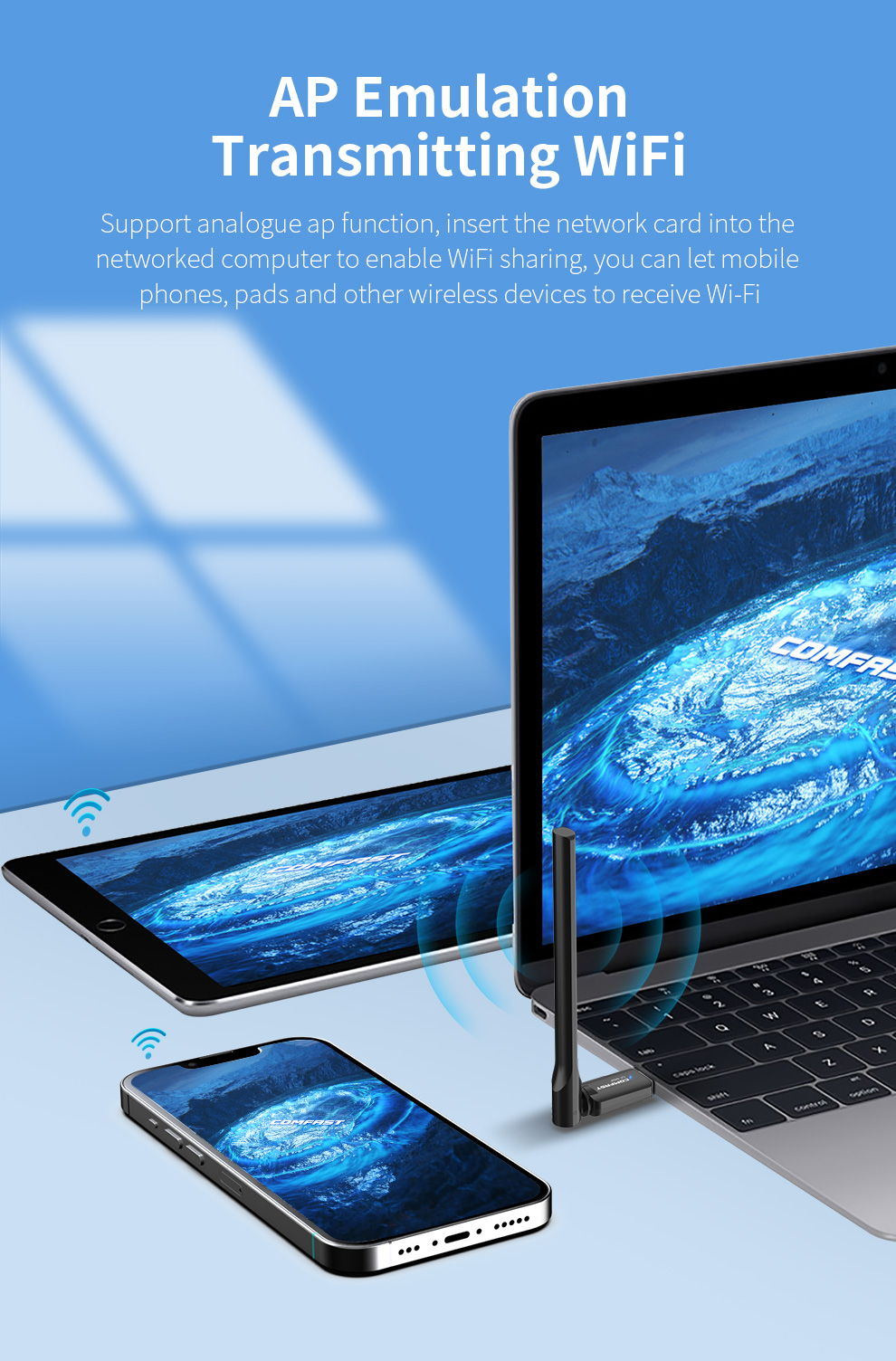 Support analogue ap function, insert the network card into the networked computer to enable WiFi sharing,