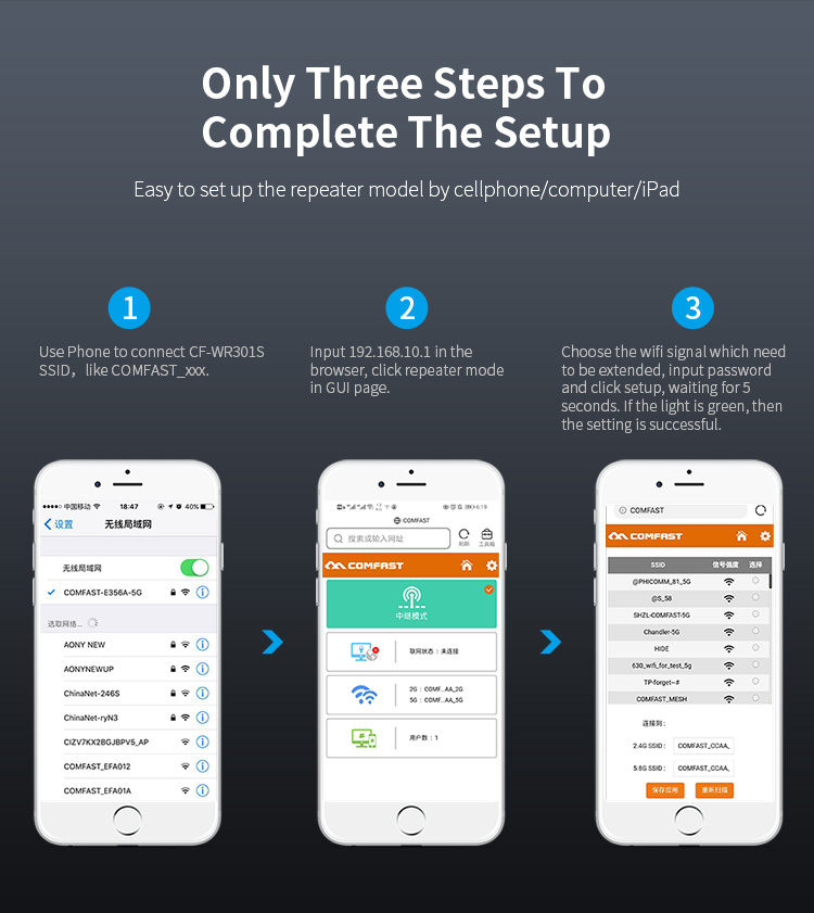 With adding COMFAST WiFi repeater, you can extend extra 80㎡ WiFi coverage, and solve your home WiFi troubles.