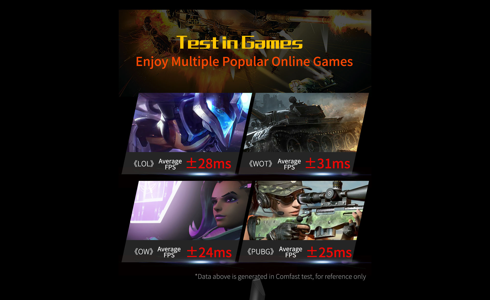 *The data on this page are theoretical values obtained from COMFAST’s internal laboratory under specific testing conditions. Actual usage may vary due to individual product differences, software versions, usage conditions, and environmental factors. Please refer to real-world usage for accurate representation.
