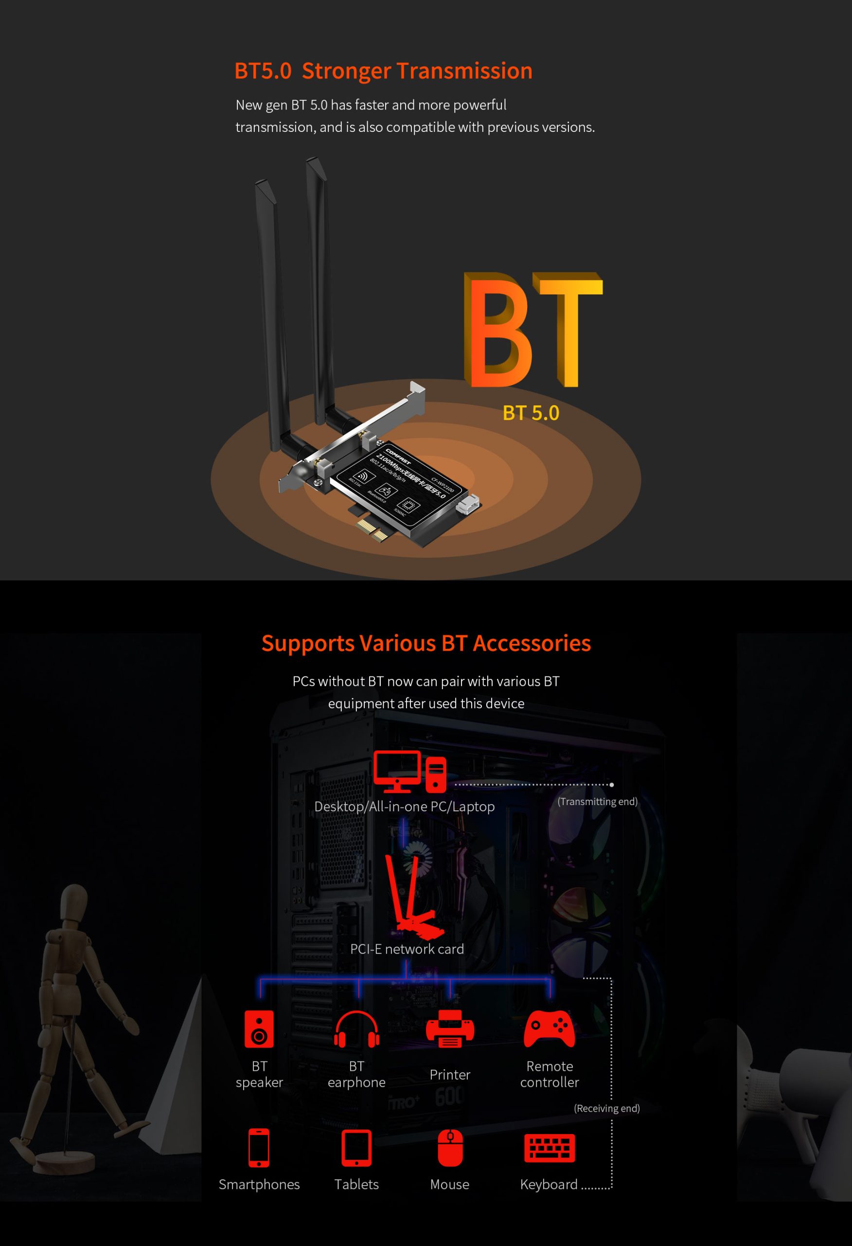 CF-WP2100 features WiFi + Bluetooth 5.0 with wireless speeds up to 2033Mbps, designed for desktop computers with stable, high-speed, and low-latency performance. It not only enhances broadband capability but also supports WiFi reception, Bluetooth device connectivity, and MU-MIMO for over three times faster internet performance.