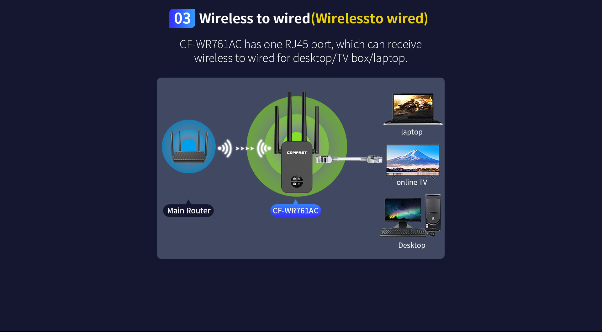 The CF-WR761AC is a dual-band Gigabit WiFi range extender featuring a smart LCD display. This intuitive screen simplifies setup and shows real-time status. With four high-gain antennas, it effectively expands coverage and penetrates walls, making it ideal for eliminating dead zones in large homes like villas and duplexes.