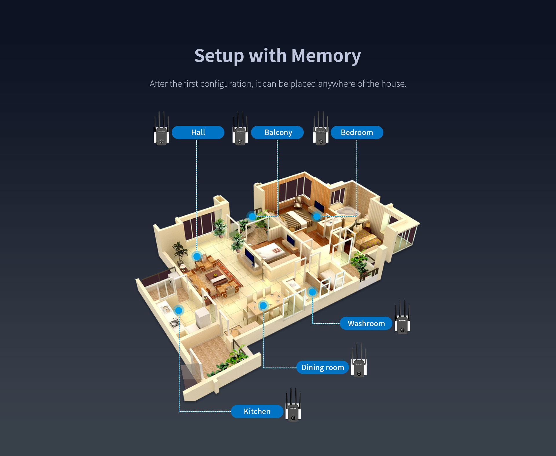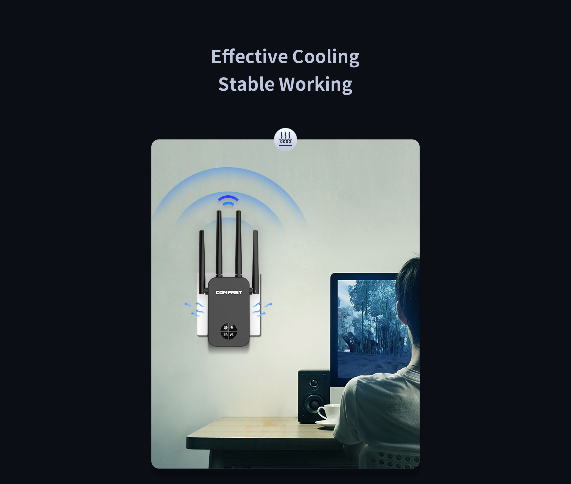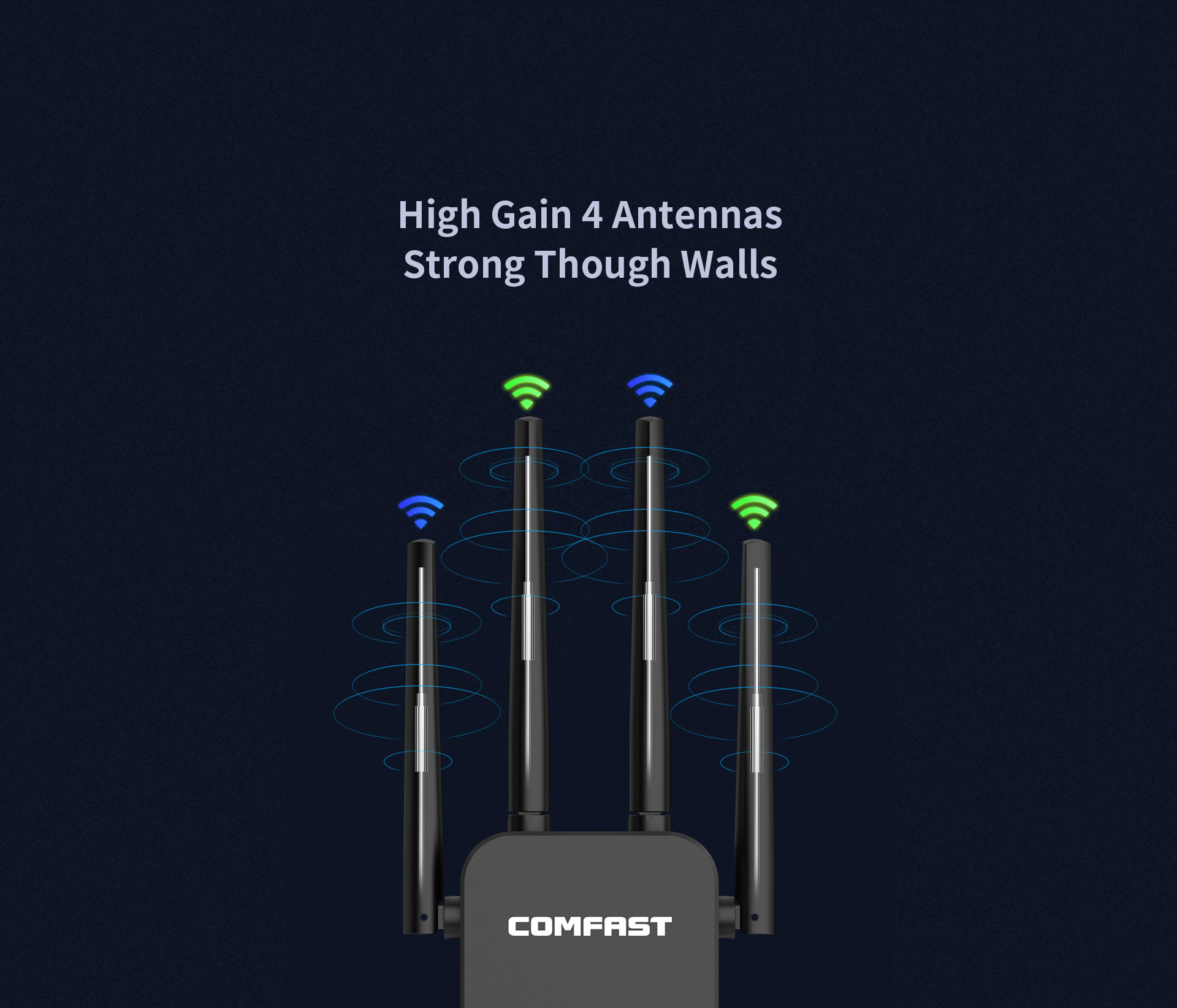 The CF-WR761AC is a dual-band Gigabit WiFi range extender featuring a smart LCD display. This intuitive screen simplifies setup and shows real-time status. With four high-gain antennas, it effectively expands coverage and penetrates walls, making it ideal for eliminating dead zones in large homes like villas and duplexes.