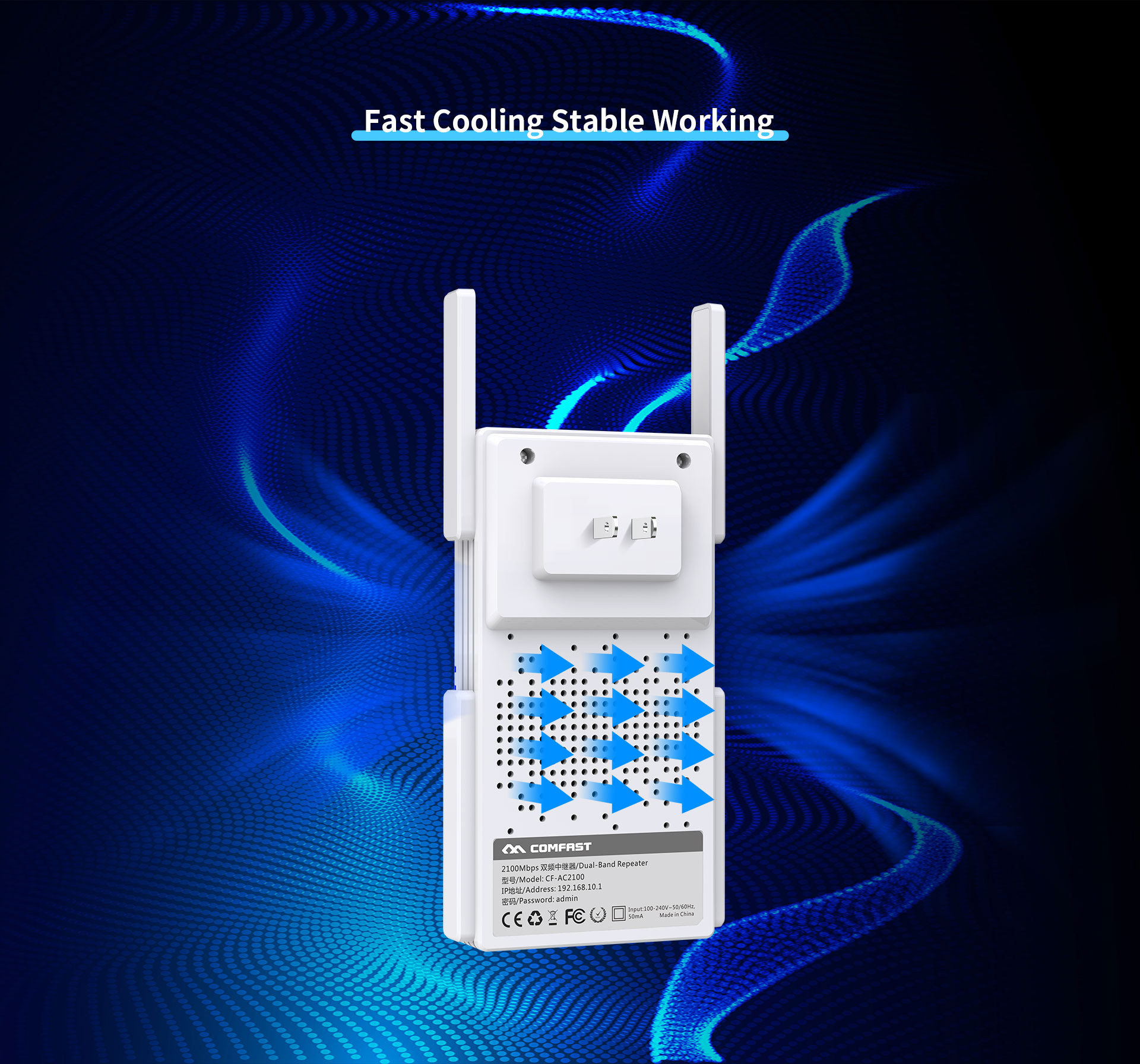 The CF-AC2100 is a high-performance 2100Mbps dual-band WiFi signal booster, designed to meet premium networking demands in large, multi-story, and complex home layouts. It extends 5G WiFi coverage via a powerful quad-antenna system and features a Gigabit port for stable wired expansion, effortlessly eliminating dead zones for lag-free streaming, gaming, and HD video.