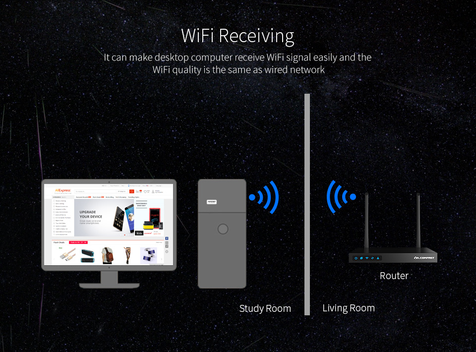 It can make desktop computer receive WiFi signal easily and the WiFi quality is the same as wired network