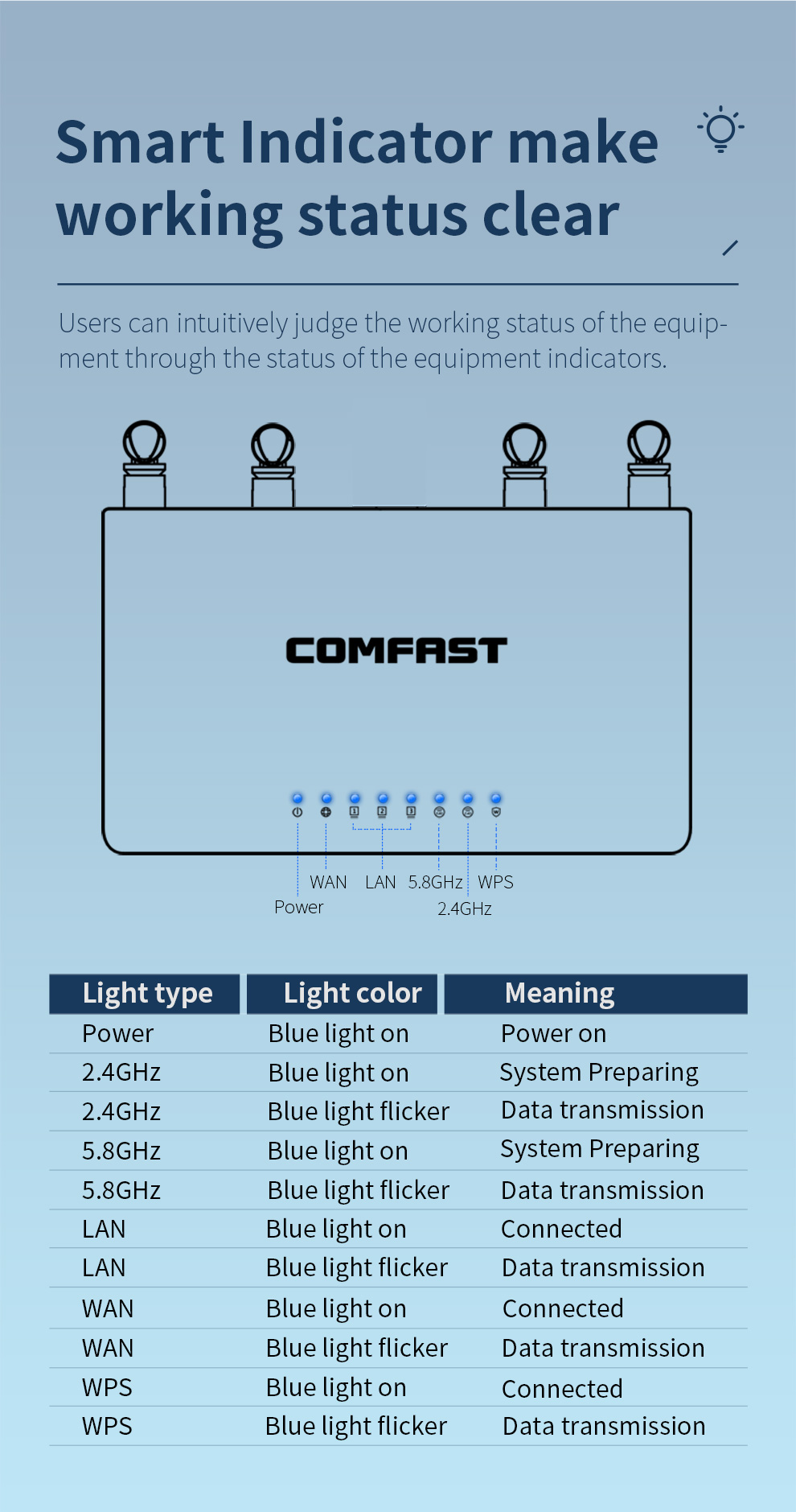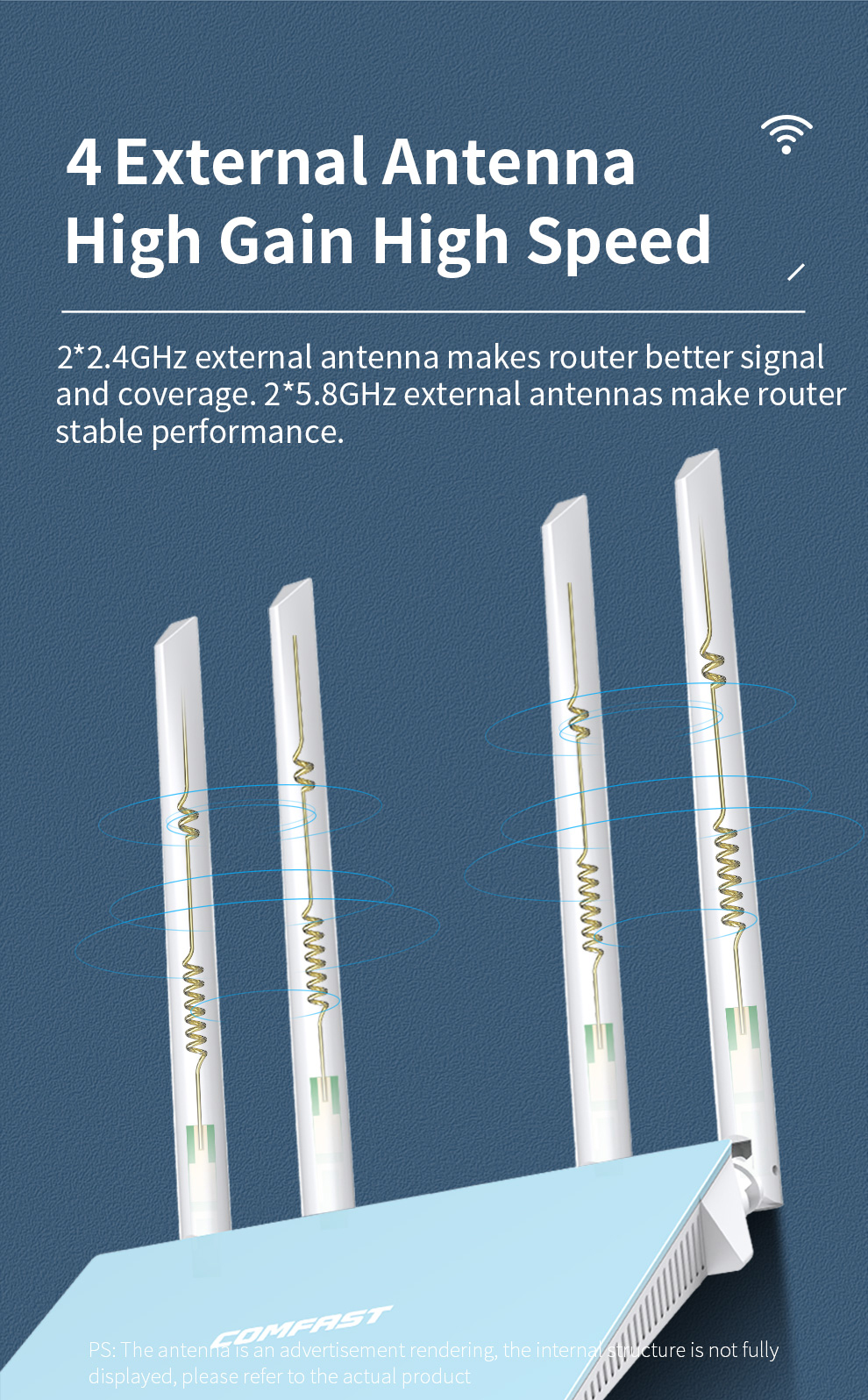 *The product images and demonstration scenarios on this page are for illustrative purposes only and may have slight differences from the actual product. Please refer to the physical product for accuracy. *The data on this page are theoretical values obtained from COMFAST’s internal laboratory under specific testing conditions. Actual usage may vary due to individual product differences, software versions, usage conditions, and environmental factors. Please refer to real-world usage for accurate representation. *To provide as accurate product information, specifications, and features as possible, COMFAST may periodically adjust and revise the text descriptions, image effects, and other content on this page to ensure alignment with actual product performance, specifications, packaging, and accessories. Should such adjustments or revisions become necessary, no prior notice will be provided.