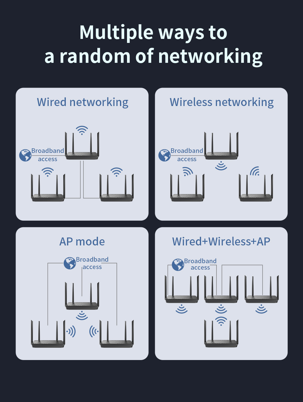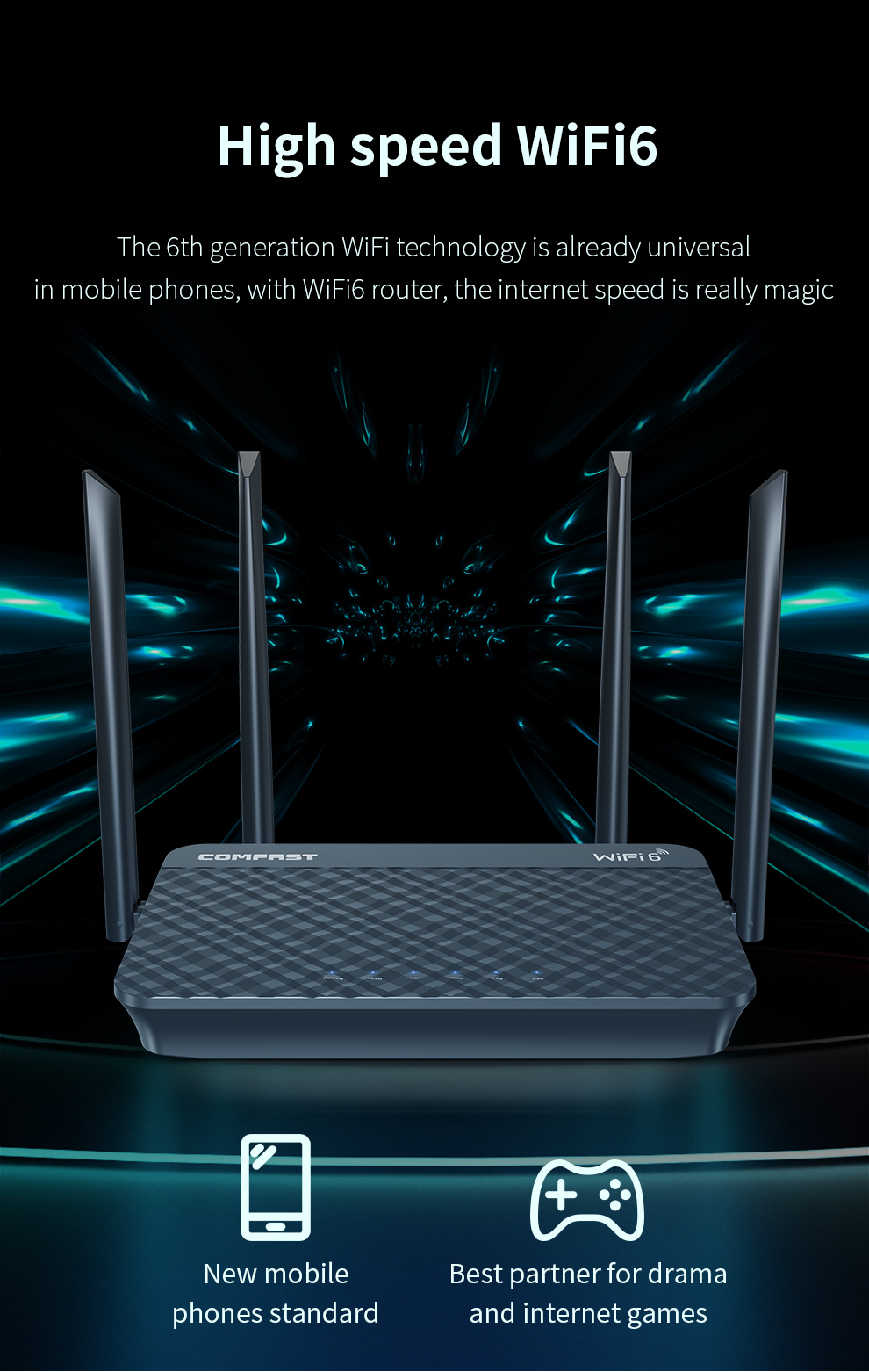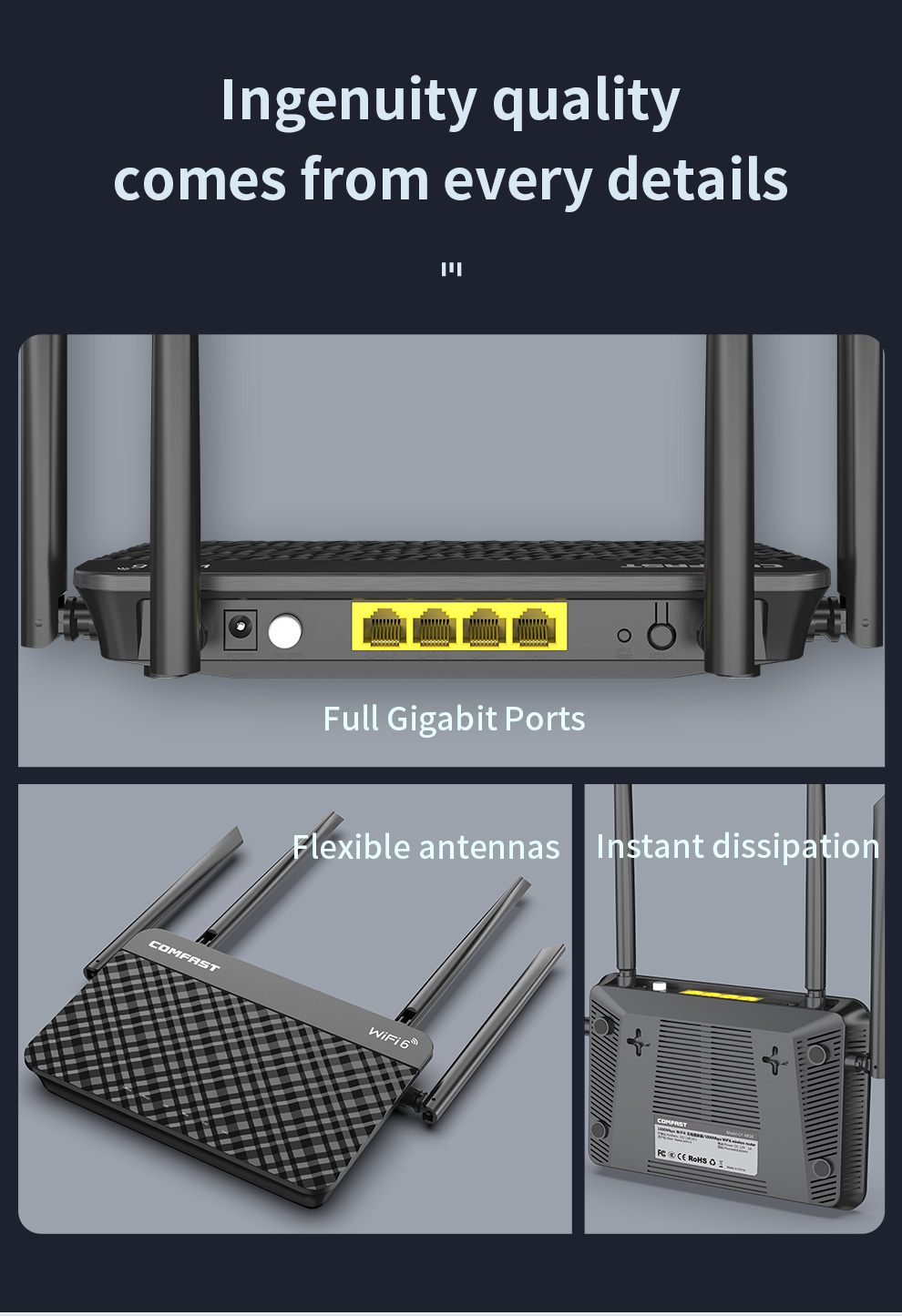 *The product images and demonstration scenarios on this page are for illustrative purposes only and may have slight differences from the actual product. Please refer to the physical product for accuracy. *The data on this page are theoretical values obtained from COMFAST’s internal laboratory under specific testing conditions. Actual usage may vary due to individual product differences, software versions, usage conditions, and environmental factors. Please refer to real-world usage for accurate representation. *To provide as accurate product information, specifications, and features as possible, COMFAST may periodically adjust and revise the text descriptions, image effects, and other content on this page to ensure alignment with actual product performance, specifications, packaging, and accessories. Should such adjustments or revisions become necessary, no prior notice will be provided.