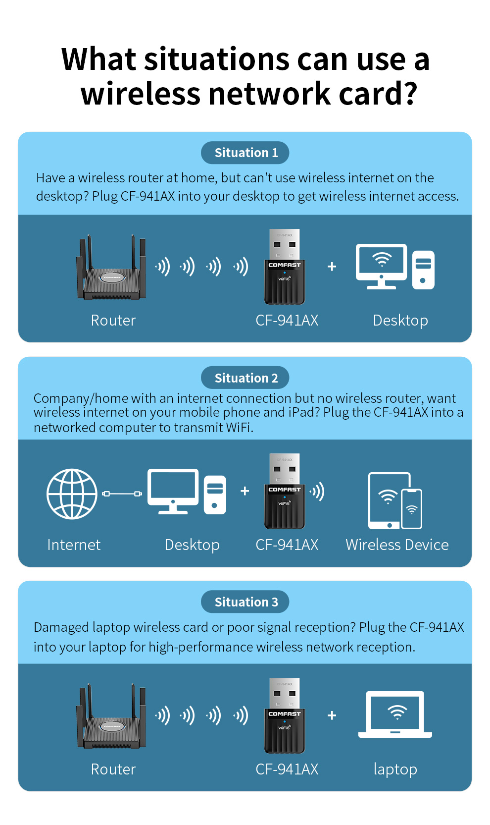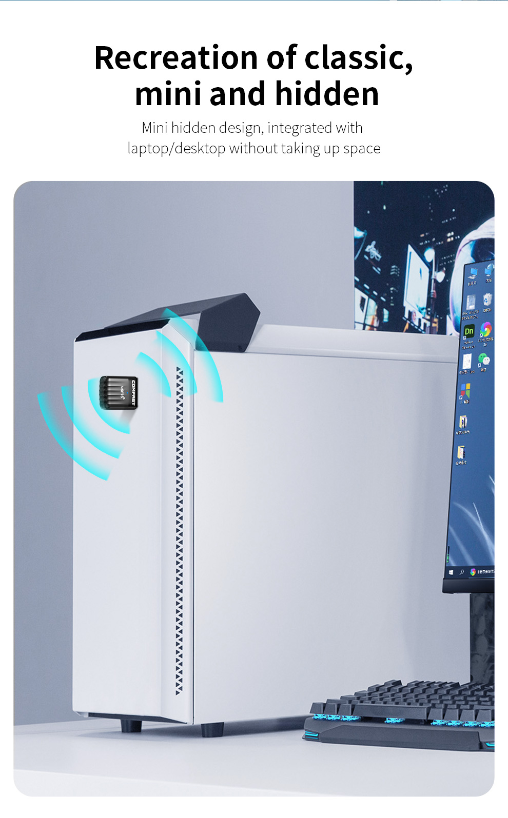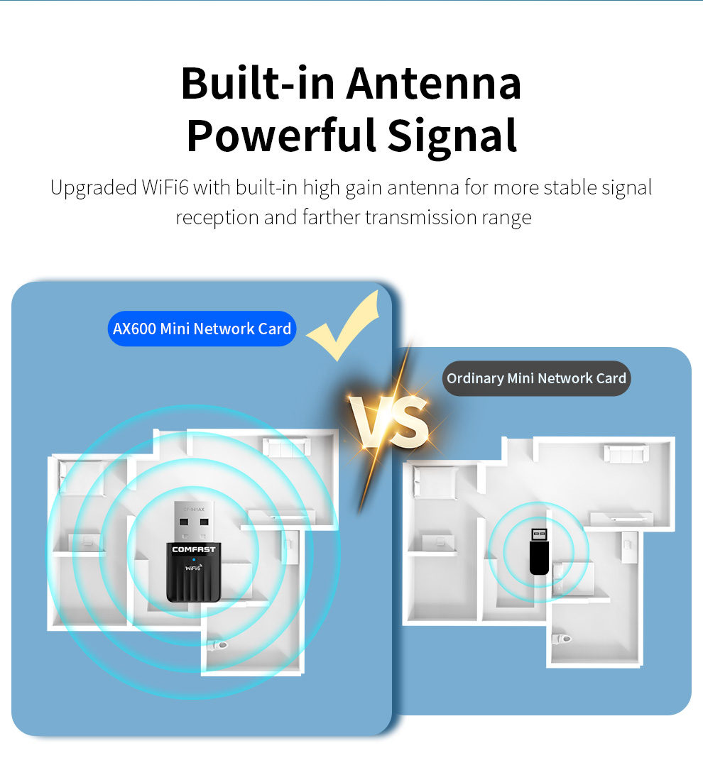 The CF-941AX is a mini, driver-free WiFi 6 USB adapter delivering dual-band speeds up to 600Mbps for faster, smoother internet. It features automatic driver installation for true plug-and-play convenience. Compact and portable, it also supports AP mode to create a WLAN, making it an ideal networking solution for desktops and laptops in homes and dorms.
