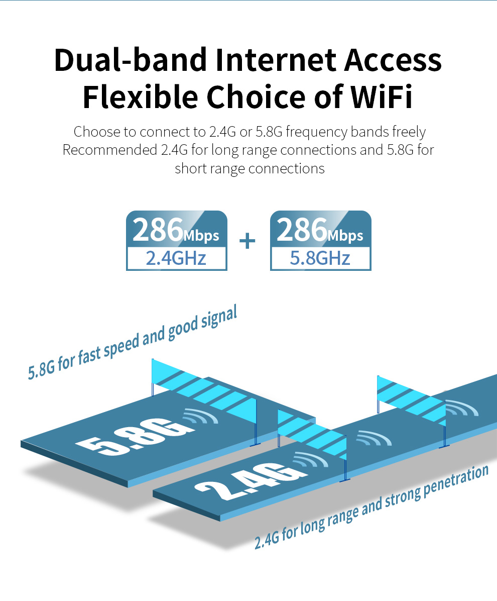 | Wireless Rate | 2.4GHz:286Mbps; 5.8GHz:286Mbps; |