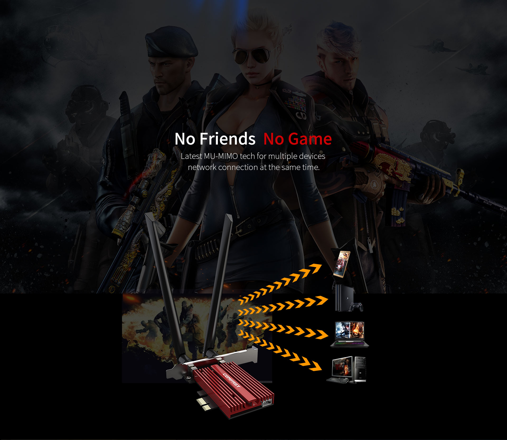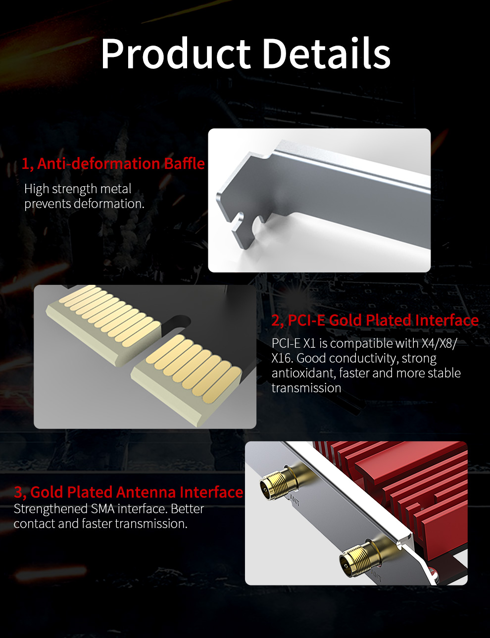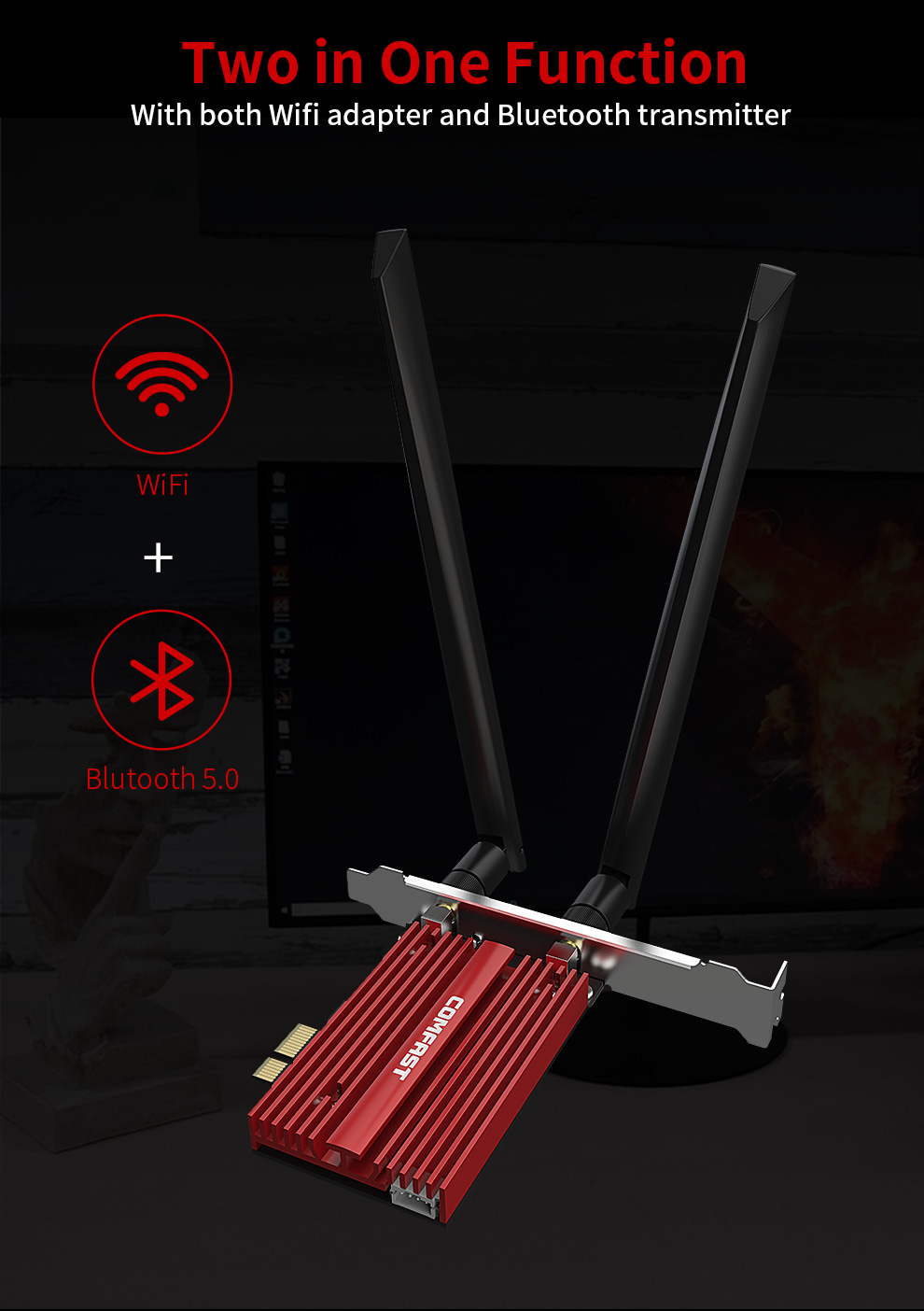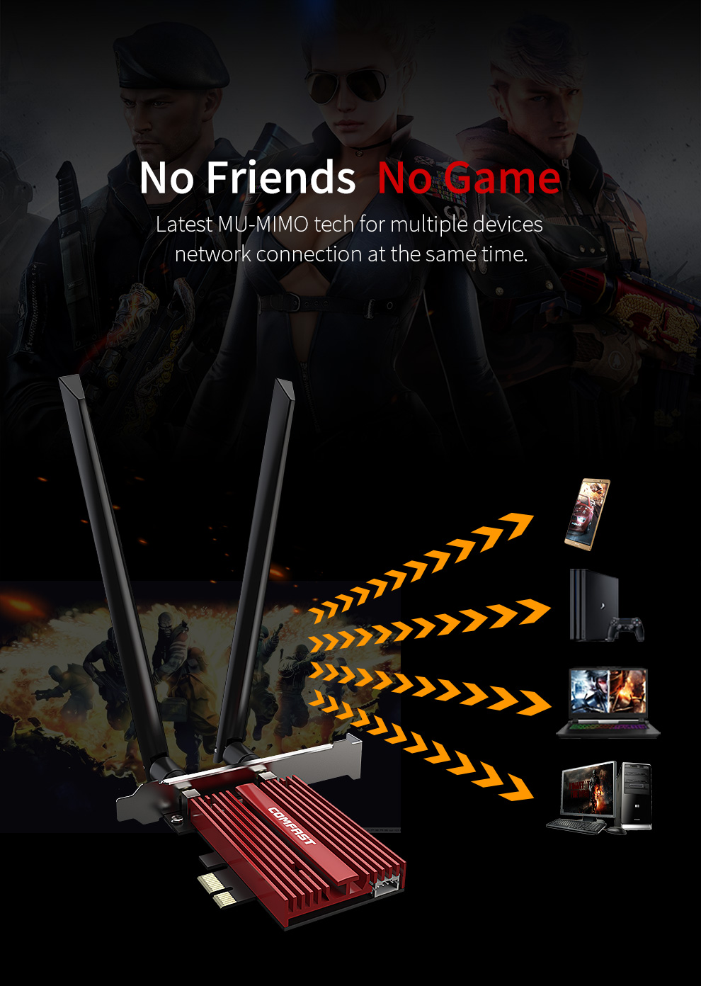 CF-WP2100 pro features WiFi + Bluetooth 5.0 with wireless speeds up to 2033Mbps, designed for desktop computers with stable, high-speed, and low-latency performance. It not only enhances broadband capability but also supports WiFi reception, Bluetooth device connectivity, and MU-MIMO for over three times faster internet performance.