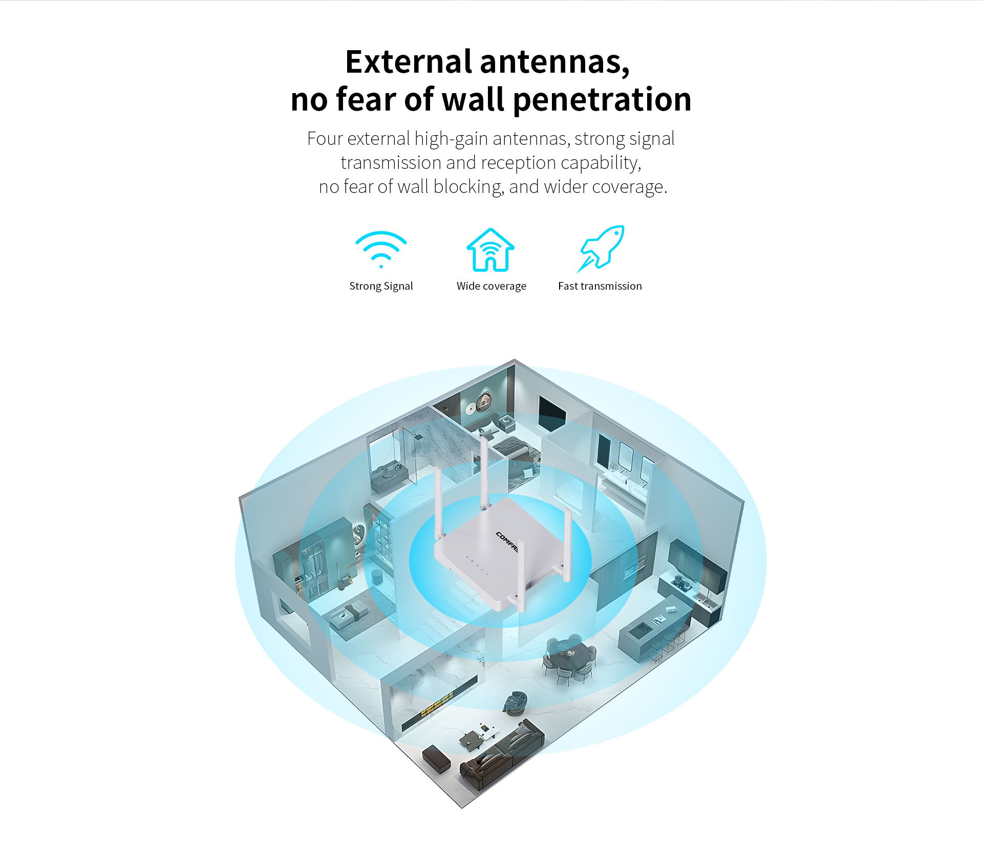 CF-N1V2 is a home router designed for small to medium-sized households. Equipped with four omnidirectional antennas, it delivers strong wall-penetrating signals and stable operation with a 300Mbps wireless speed to meet most home networking needs. With up to 64MB memory, it ensures more stable data transmission and is suitable for building local area networks in homes, dormitories, and rental apartments.