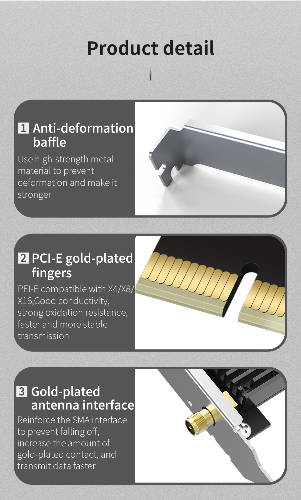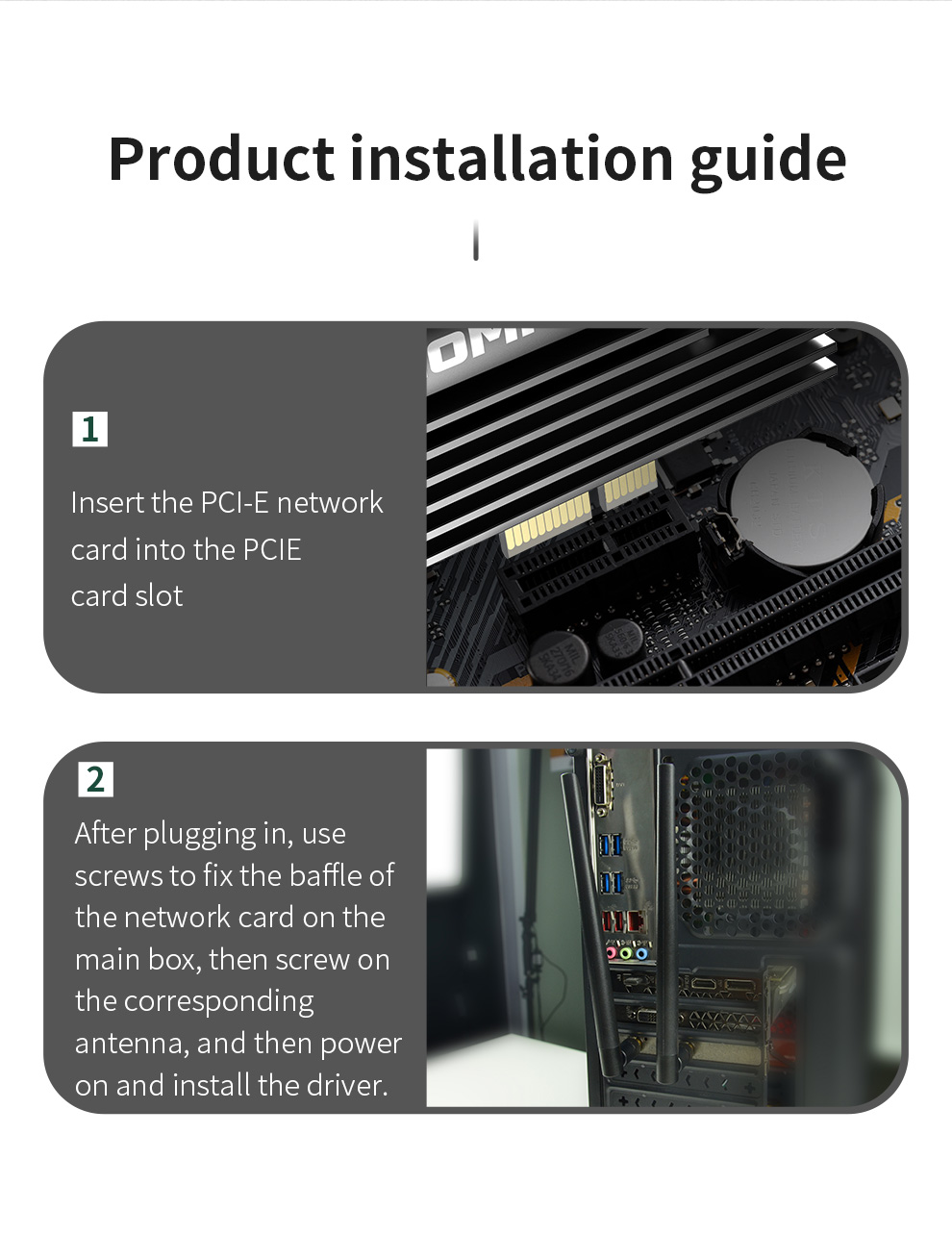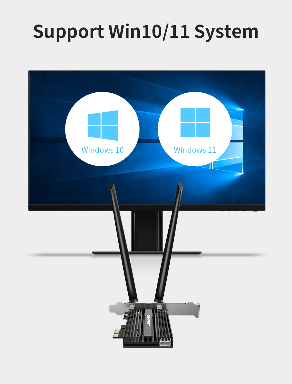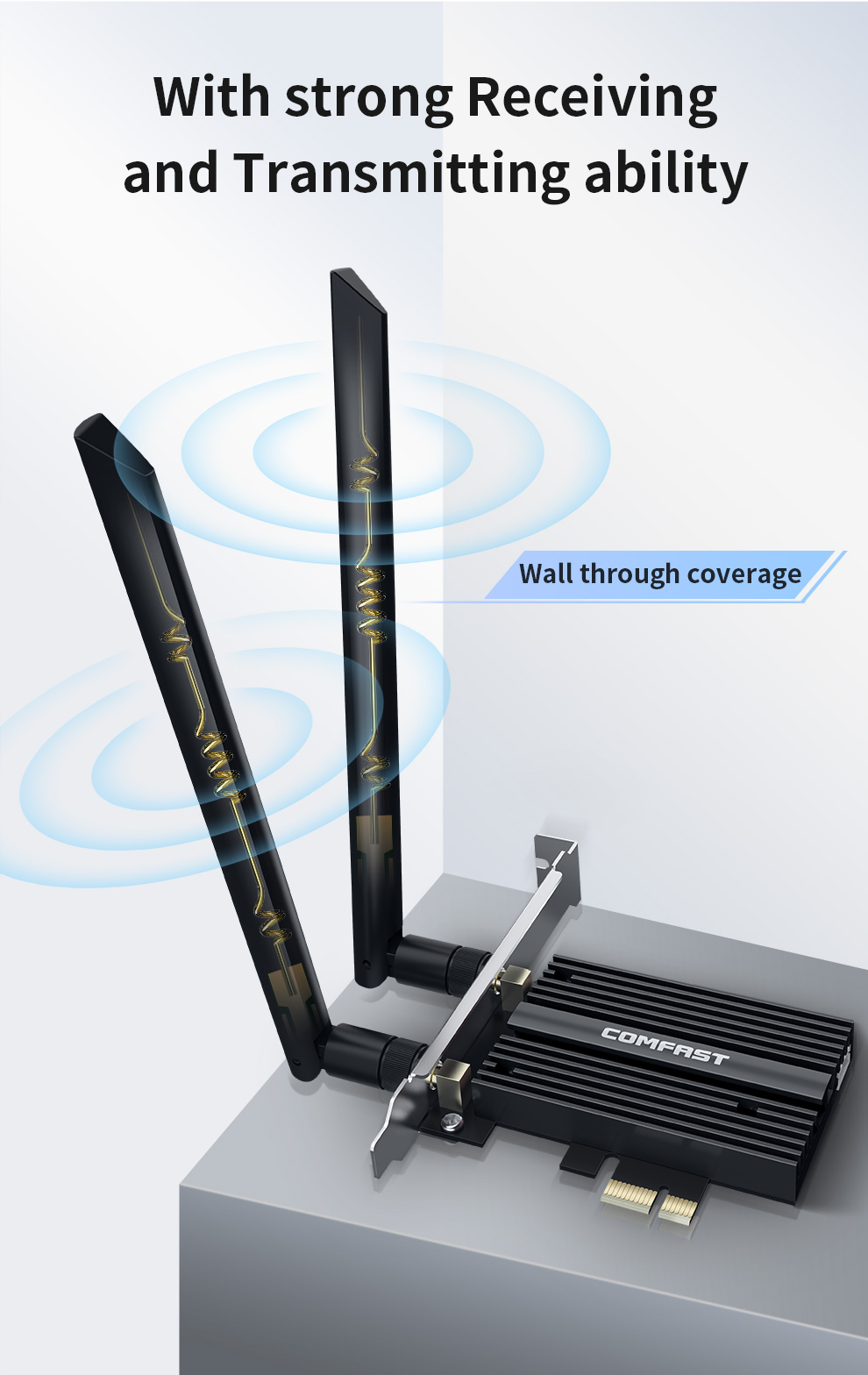 CF-AX180 PRO is a high-speed PCI-E network card supporting WiFi6 (802.11ax), offering 1800Mbps dual-band speed and Bluetooth 5.2. Equipped with 2*5dBi high-gain antennas, it enhances signal penetration and coverage, supporting both 2.4GHz and 5.8GHz frequencies. Perfect for large online gaming and HD streaming, MU-MIMO technology ensures smooth and fast wireless performance.