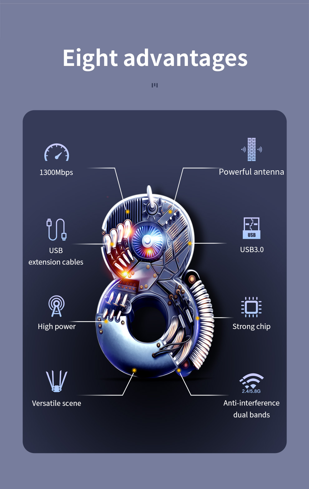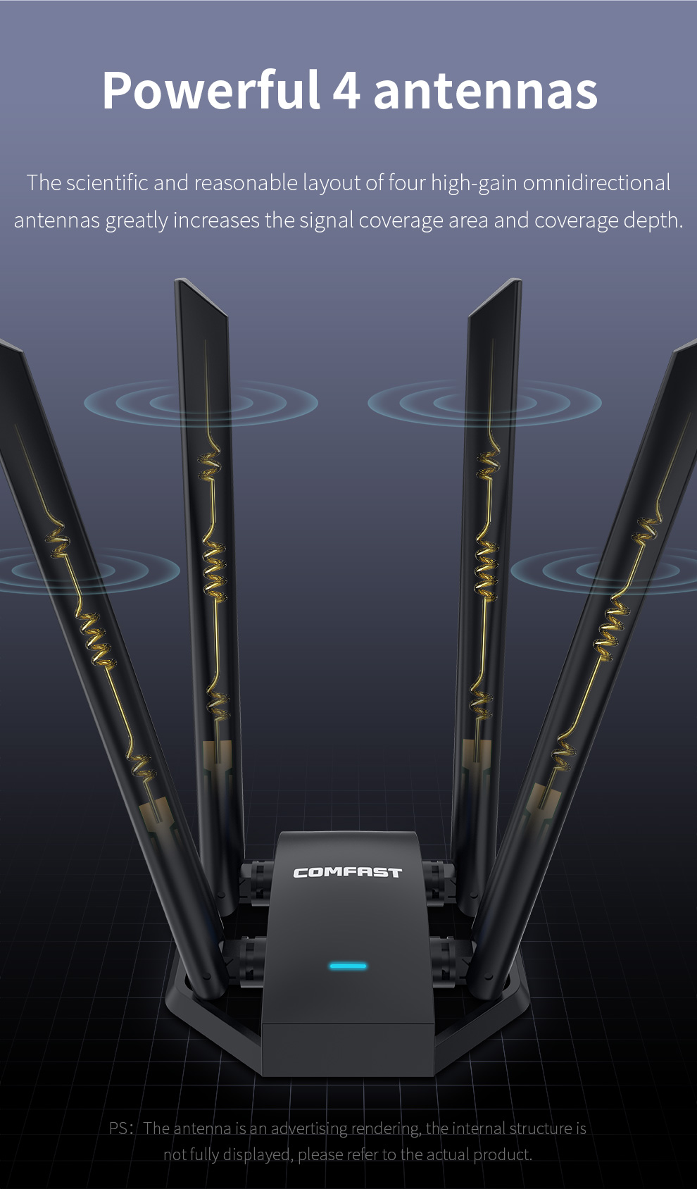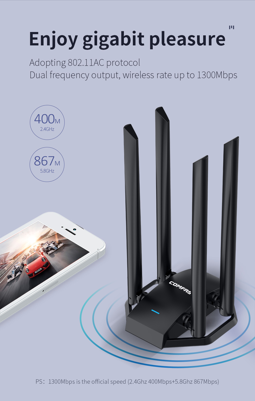 Adopting 802.11AC protocol Dual frequency output, wireless rate up to 1300Mbps