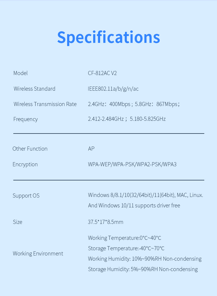 CF-812AC V2は、1300Mbpsデュアルバンド・ドライバ不要ワイヤレスアダプタです。ドライバ不要の設計により、自動インストールが可能で、より簡単に使用できます。2.4GHzと5.8GHzの周波数帯域をサポートし、強力な干渉防止機能、強力な信号性能、広いカバレッジを提供し、オフィス、家庭、寮、ホテルなど様々なシーンに最適です。.