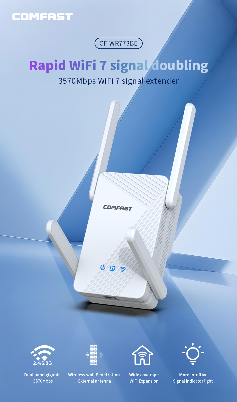 The CF-WR773BE is a WiFi 7 wireless repeater delivering dual-band speeds up to 3570Mbps for seamless whole-home coverage. Featuring four rotatable high-gain antennas for flexible signal adjustment and enhanced wall penetration, it effectively eliminates dead zones in large homes, villas, and duplexes, ensuring stable and high-performance network extension.