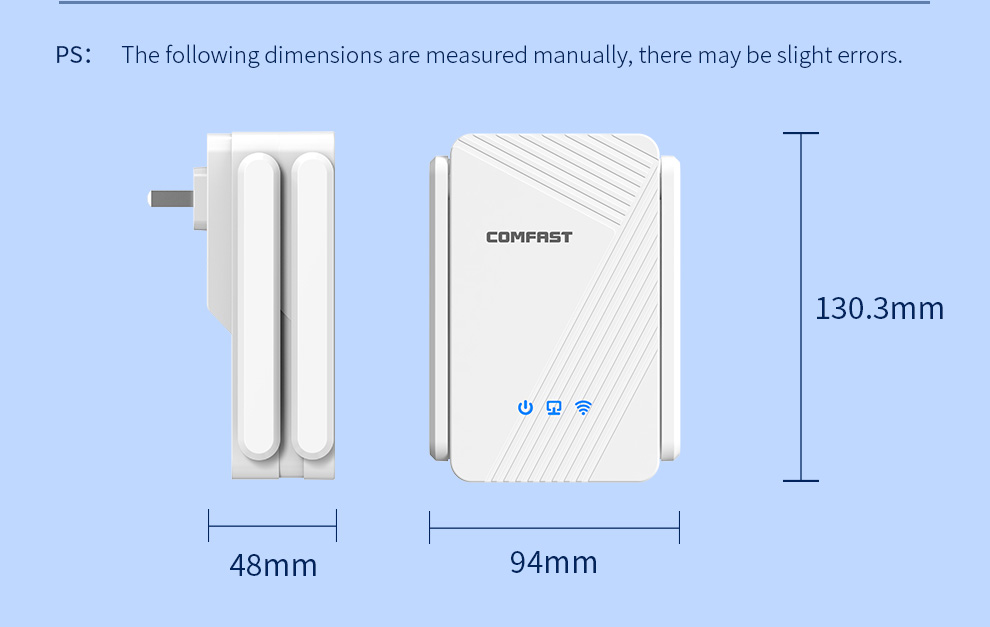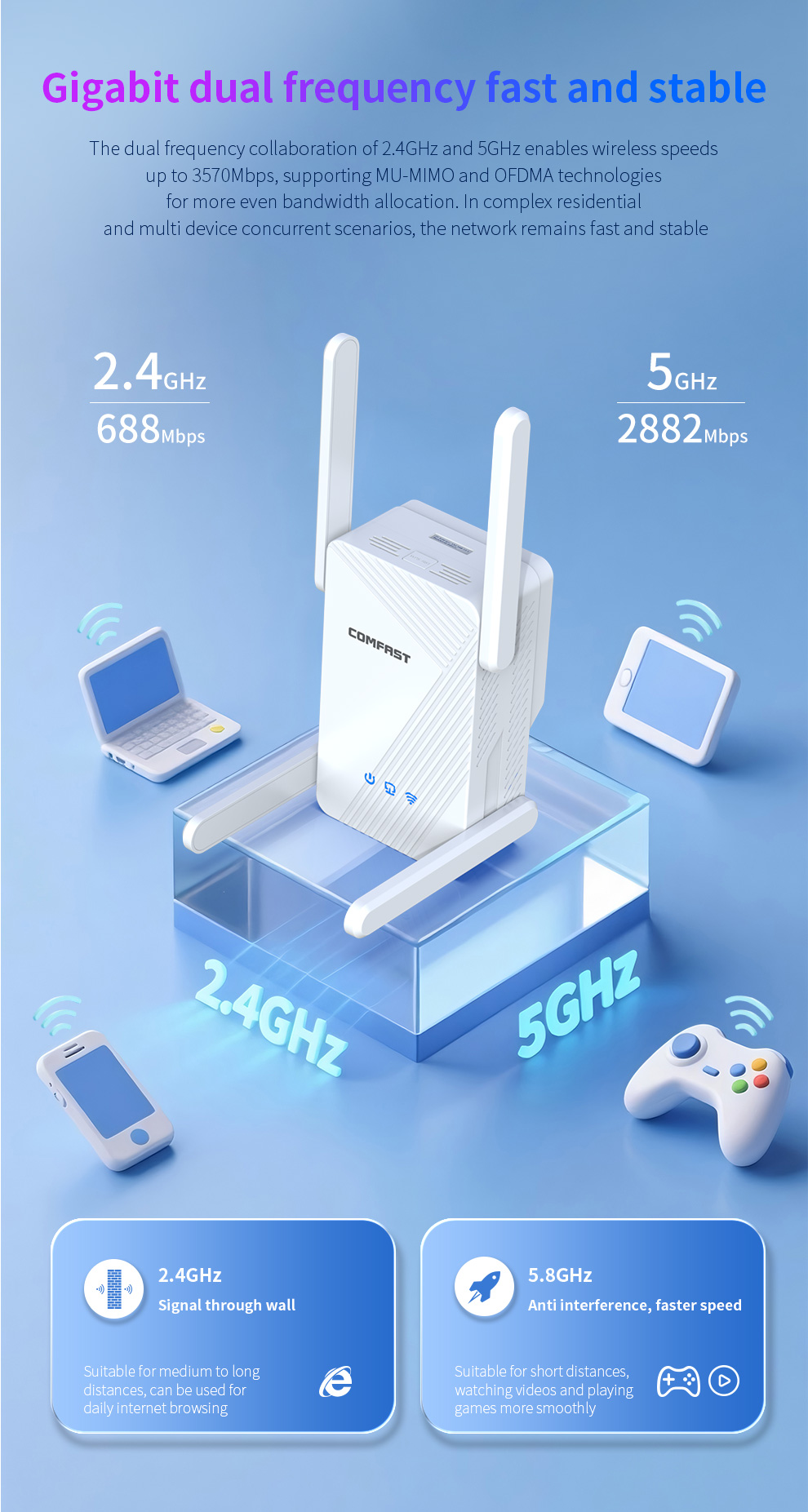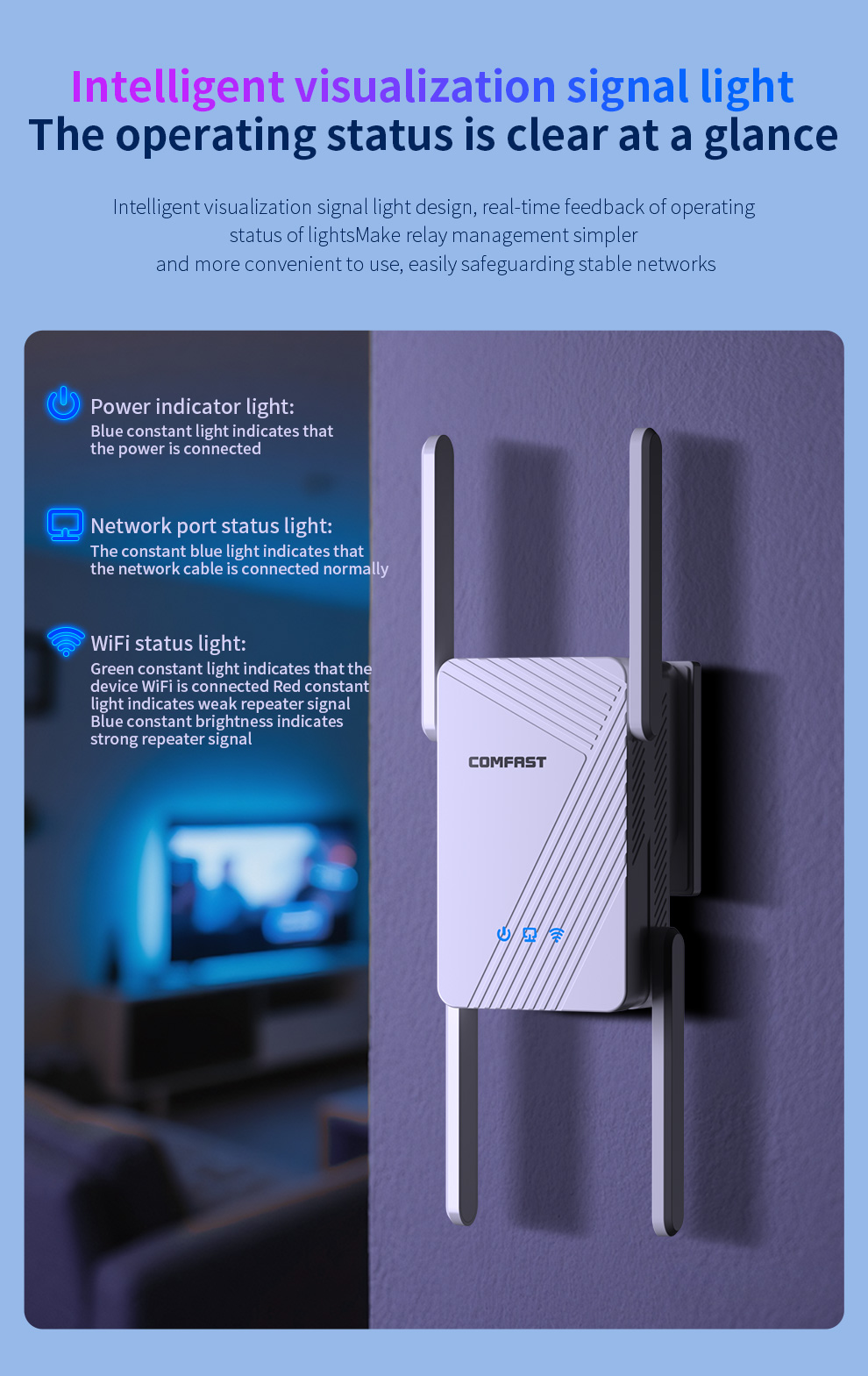 *The product images and demonstration scenarios on this page are for illustrative purposes only and may have slight differences from the actual product. Please refer to the physical product for accuracy. *The data on this page are theoretical values obtained from COMFAST’s internal laboratory under specific testing conditions. Actual usage may vary due to individual product differences, software versions, usage conditions, and environmental factors. Please refer to real-world usage for accurate representation. *To provide as accurate product information, specifications, and features as possible, COMFAST may periodically adjust and revise the text descriptions, image effects, and other content on this page to ensure alignment with actual product performance, specifications, packaging, and accessories. Should such adjustments or revisions become necessary, no prior notice will be provided.