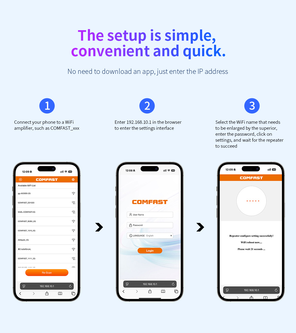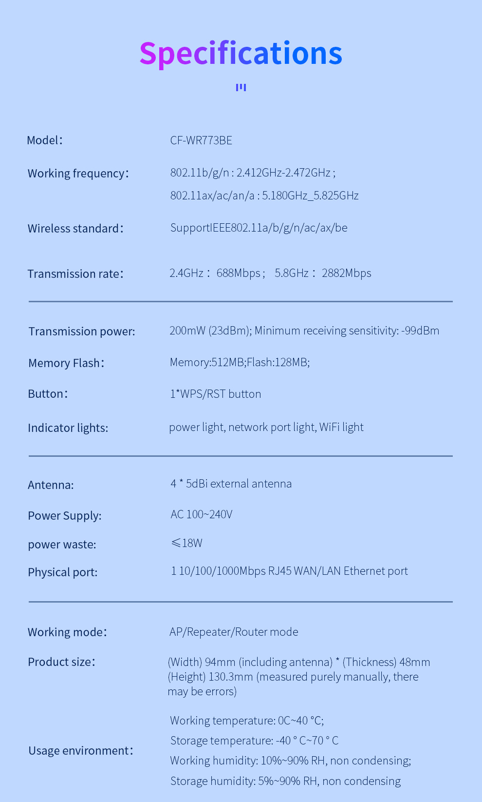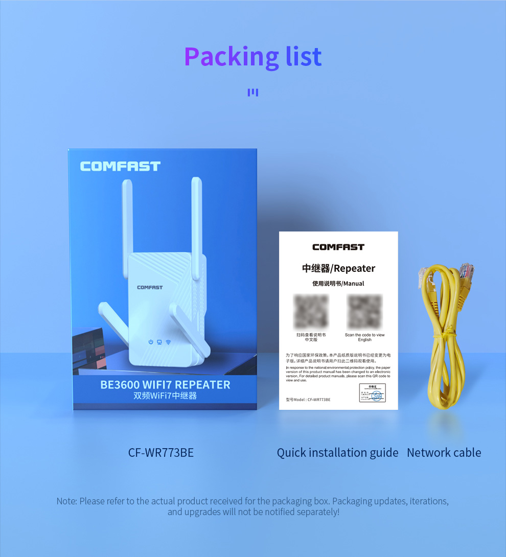 *The product images and demonstration scenarios on this page are for illustrative purposes only and may have slight differences from the actual product. Please refer to the physical product for accuracy. *The data on this page are theoretical values obtained from COMFAST’s internal laboratory under specific testing conditions. Actual usage may vary due to individual product differences, software versions, usage conditions, and environmental factors. Please refer to real-world usage for accurate representation. *To provide as accurate product information, specifications, and features as possible, COMFAST may periodically adjust and revise the text descriptions, image effects, and other content on this page to ensure alignment with actual product performance, specifications, packaging, and accessories. Should such adjustments or revisions become necessary, no prior notice will be provided.