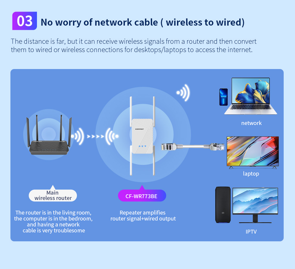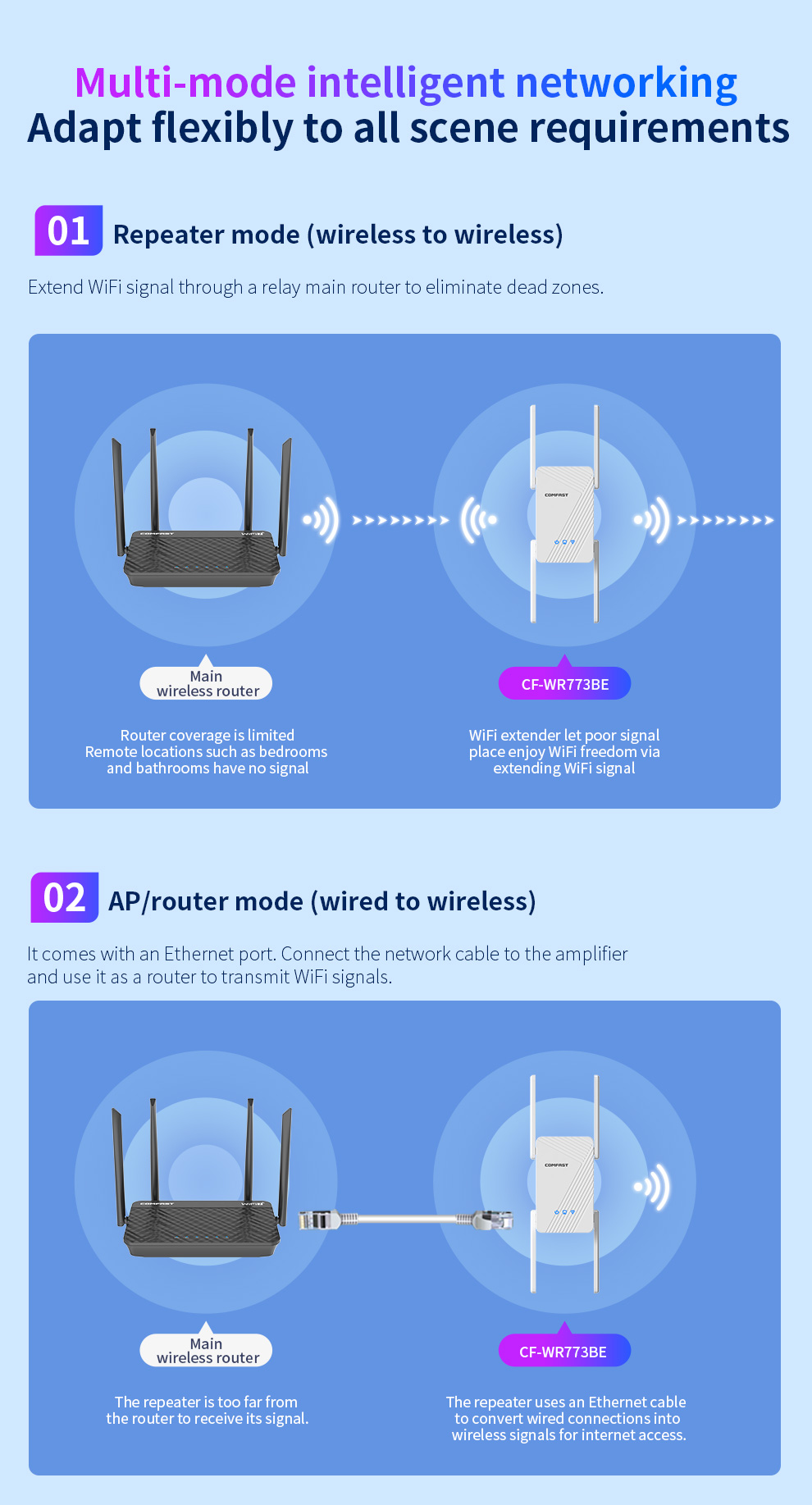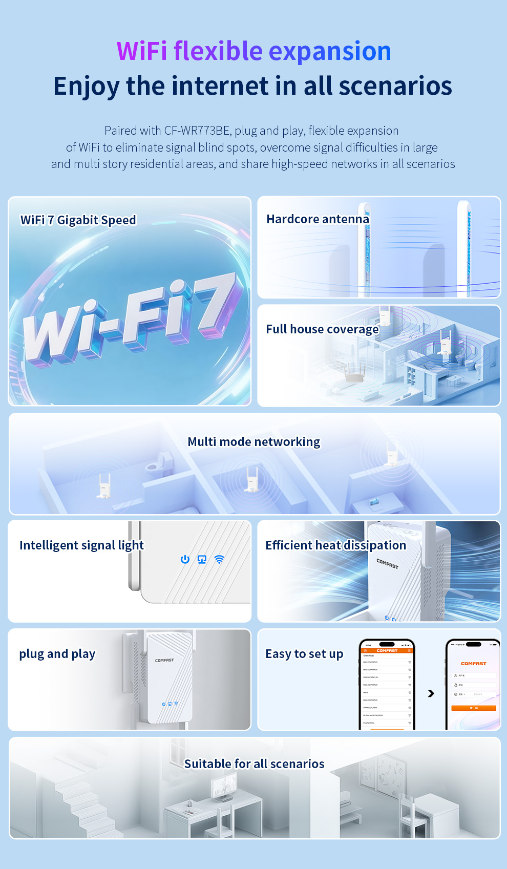 Paired with CF-WR773BE, plug and play, flexible expansion of WiFi to eliminate signal blind spots,