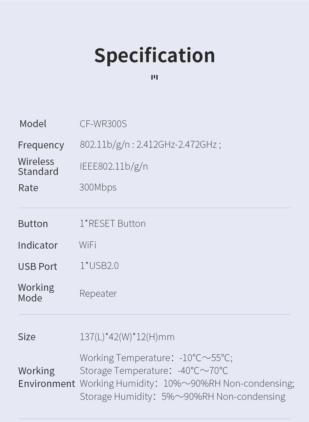 The CF-WR300S is a USB-powered signal extender with dual antennas, enhancing Wi-Fi coverage and supporting memory transfer for easy extension to any location.