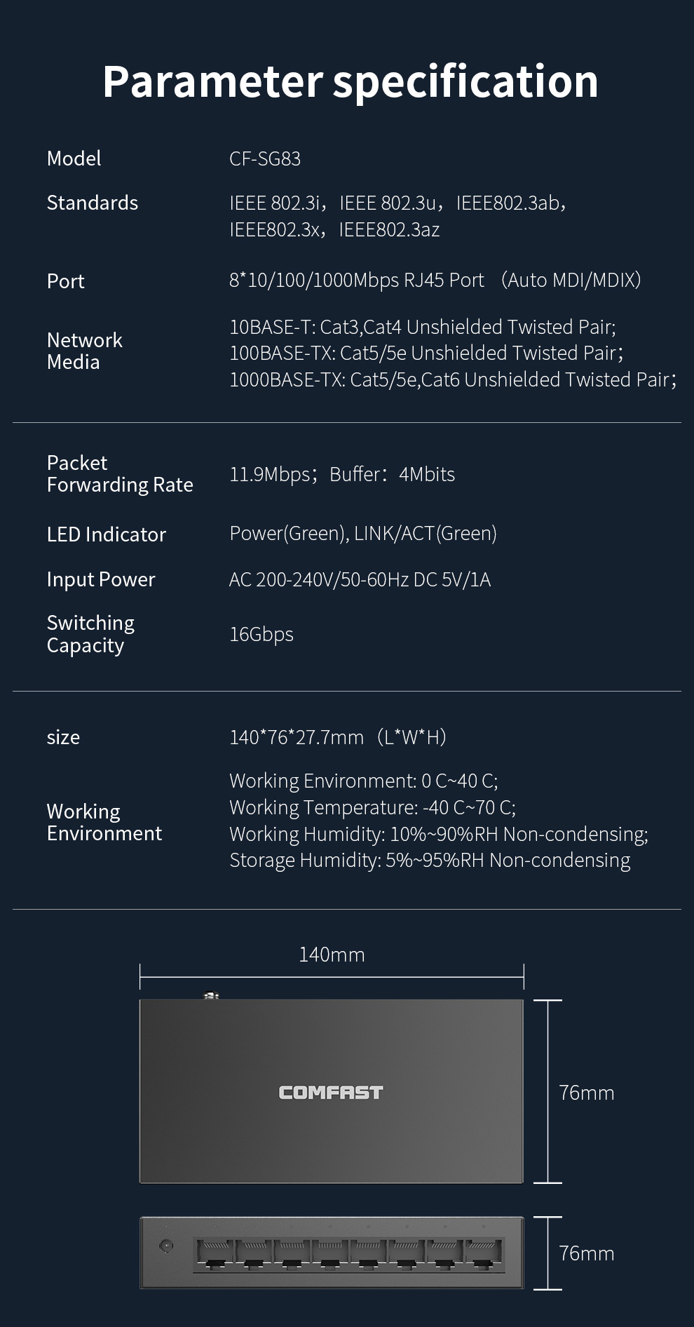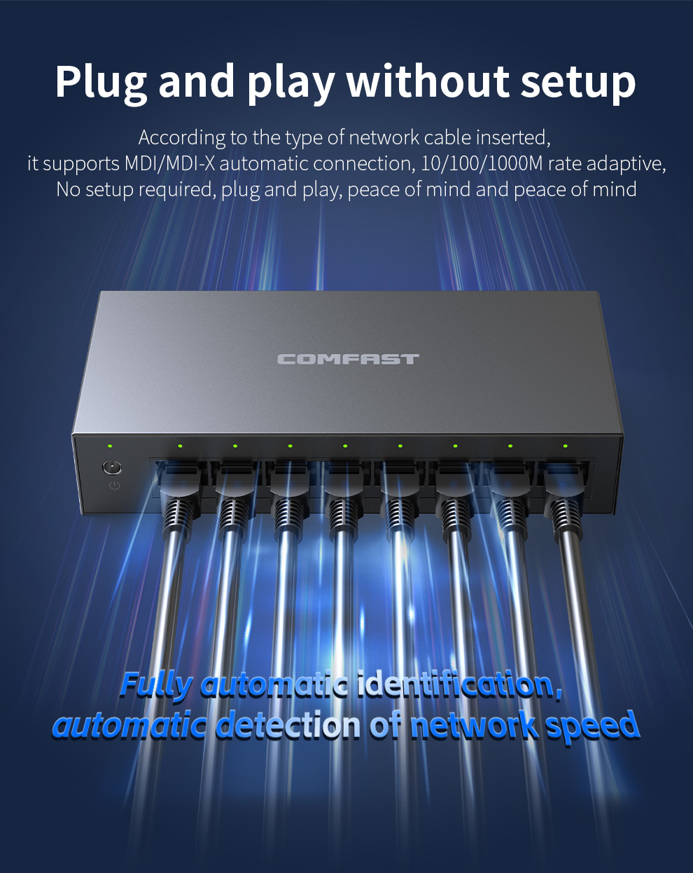 10/100/1000M rate adaptive, No setup required, plug and play, peace of mind and peace of mind