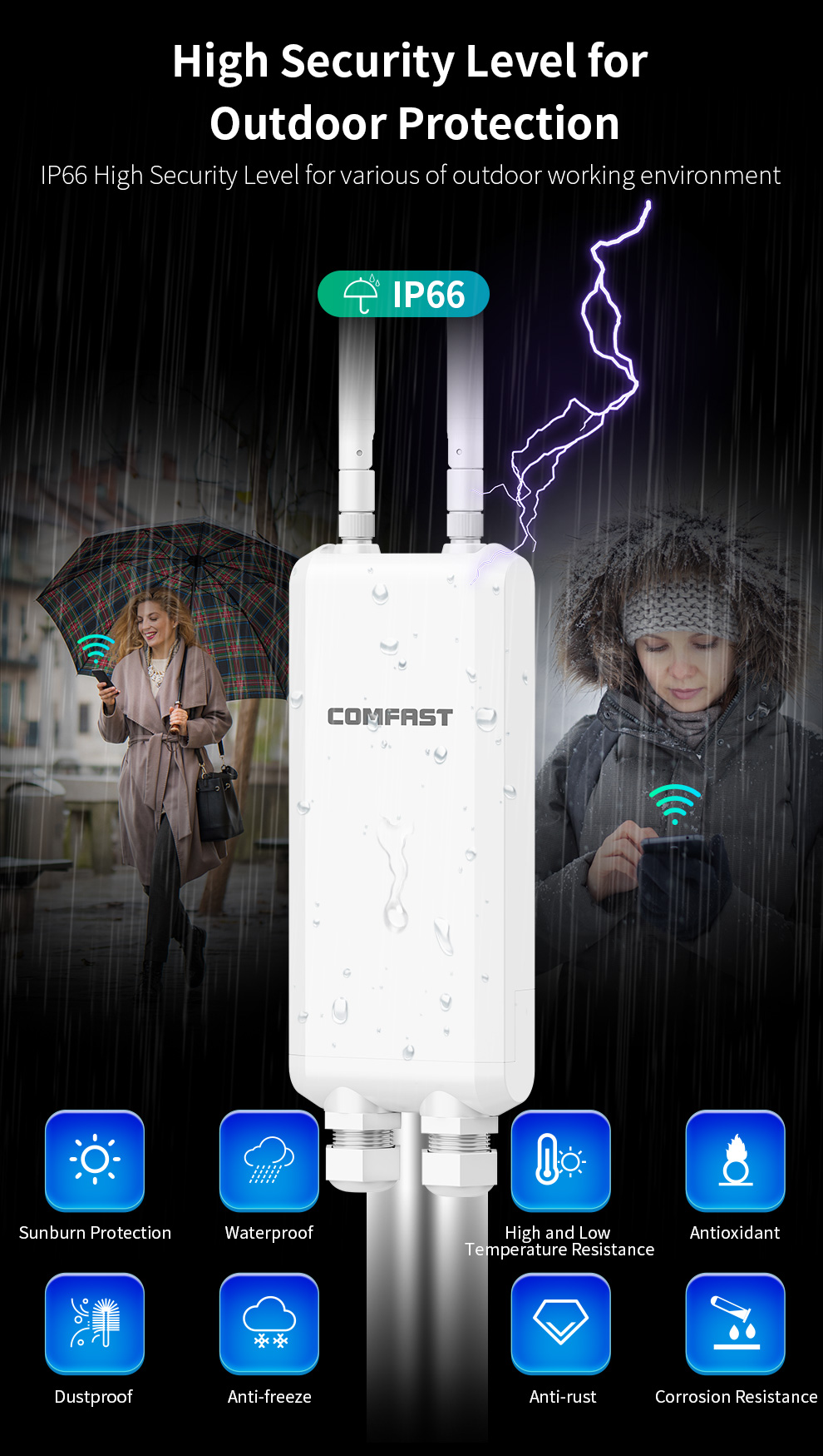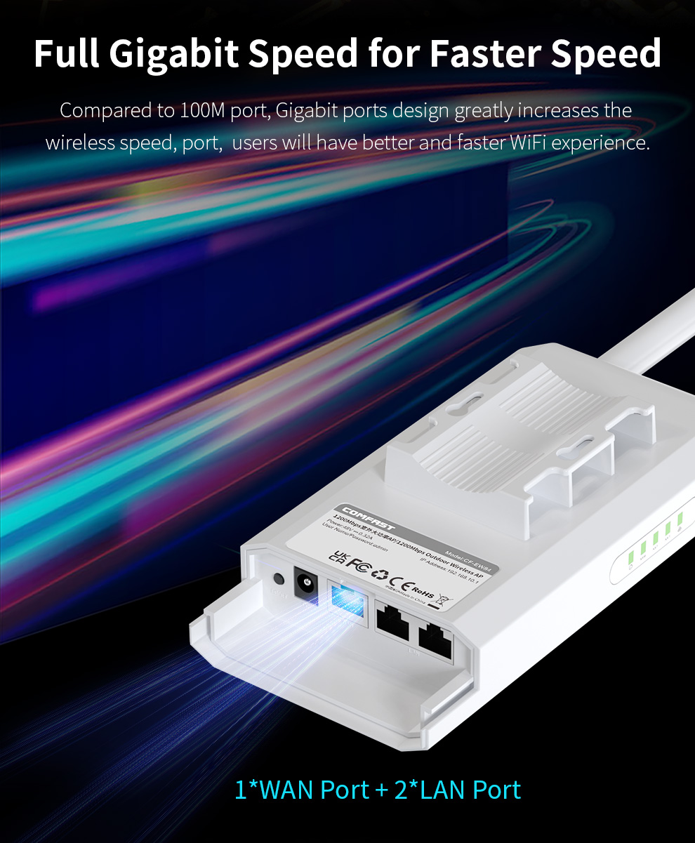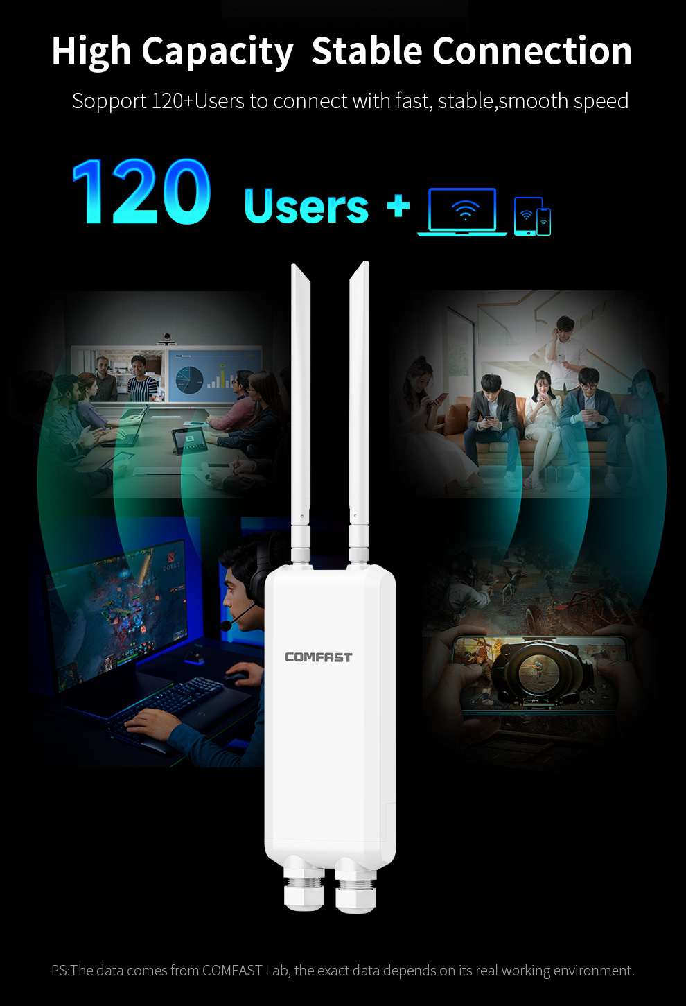 *The product images and demonstration scenarios on this page are for illustrative purposes only and may have slight differences from the actual product. Please refer to the physical product for accuracy. *The data on this page are theoretical values obtained from COMFAST’s internal laboratory under specific testing conditions. Actual usage may vary due to individual product differences, software versions, usage conditions, and environmental factors. Please refer to real-world usage for accurate representation. *To provide as accurate product information, specifications, and features as possible, COMFAST may periodically adjust and revise the text descriptions, image effects, and other content on this page to ensure alignment with actual product performance, specifications, packaging, and accessories. Should such adjustments or revisions become necessary, no prior notice will be provided.