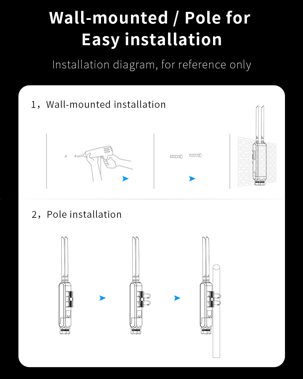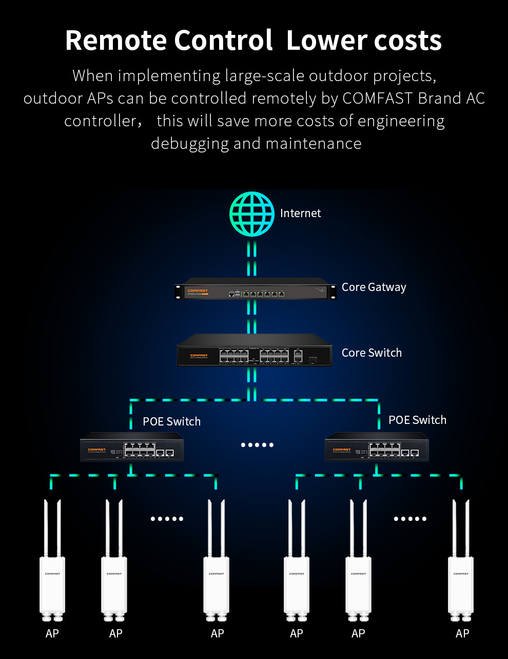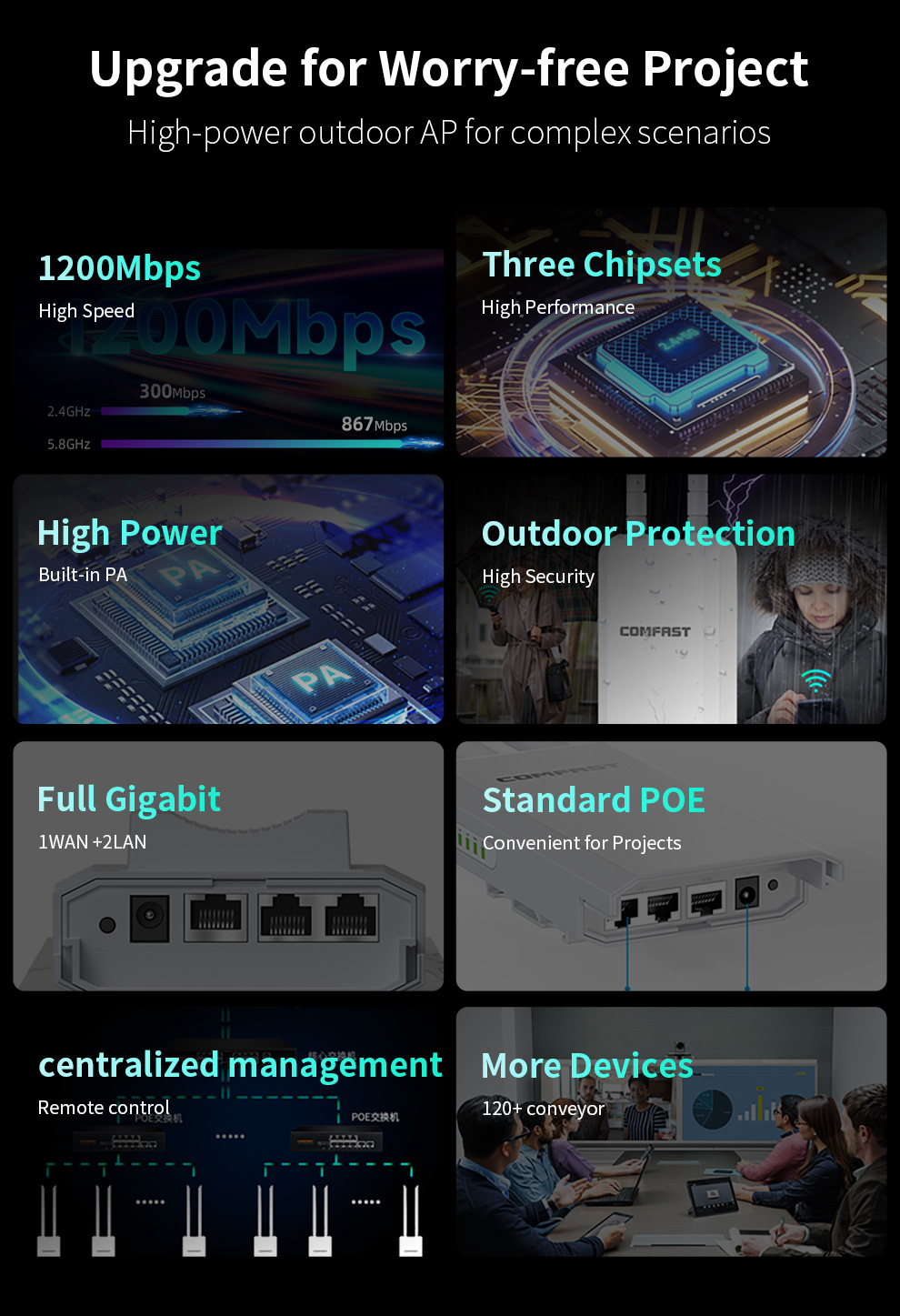 *The product images and demonstration scenarios on this page are for illustrative purposes only and may have slight differences from the actual product. Please refer to the physical product for accuracy. *The data on this page are theoretical values obtained from COMFAST’s internal laboratory under specific testing conditions. Actual usage may vary due to individual product differences, software versions, usage conditions, and environmental factors. Please refer to real-world usage for accurate representation. *To provide as accurate product information, specifications, and features as possible, COMFAST may periodically adjust and revise the text descriptions, image effects, and other content on this page to ensure alignment with actual product performance, specifications, packaging, and accessories. Should such adjustments or revisions become necessary, no prior notice will be provided.