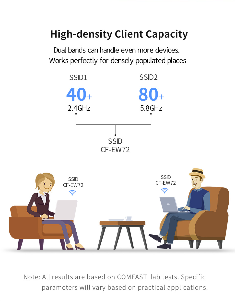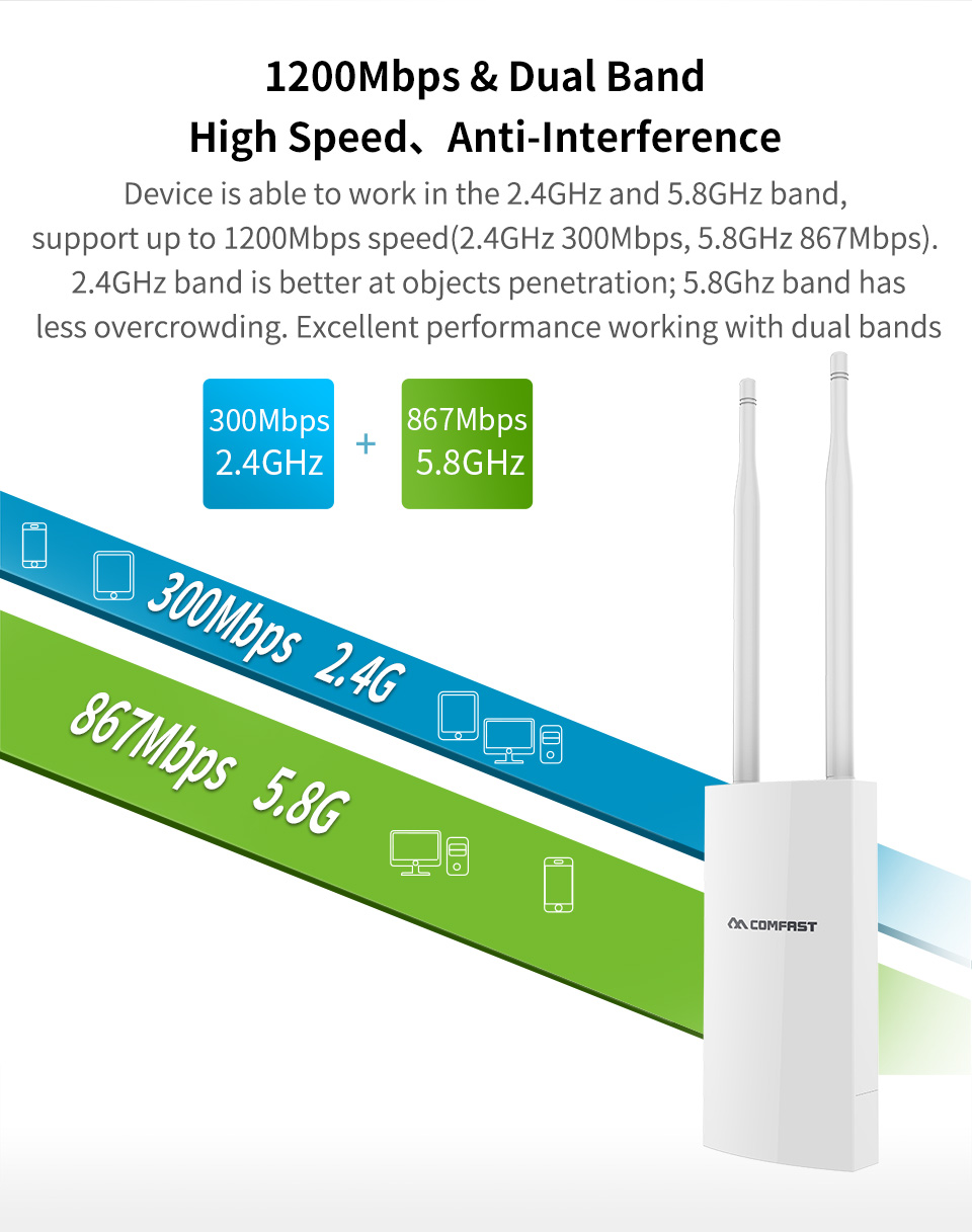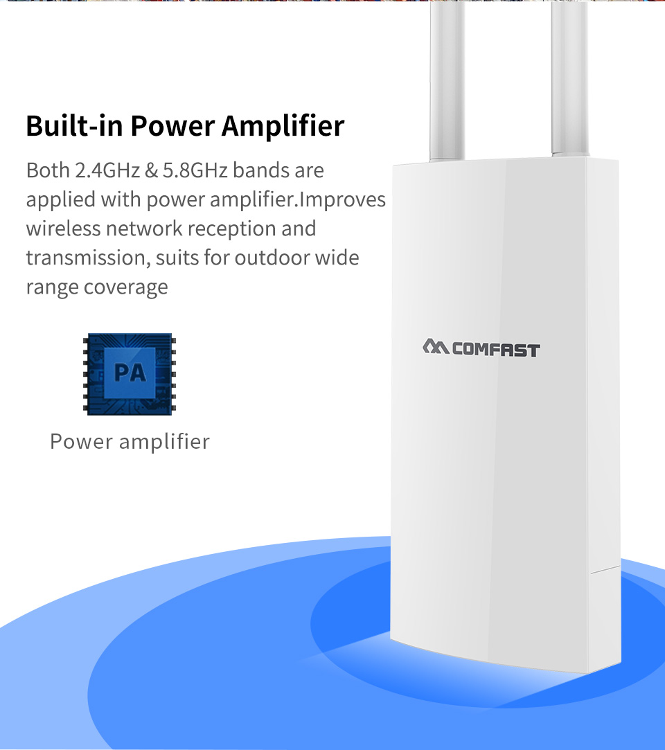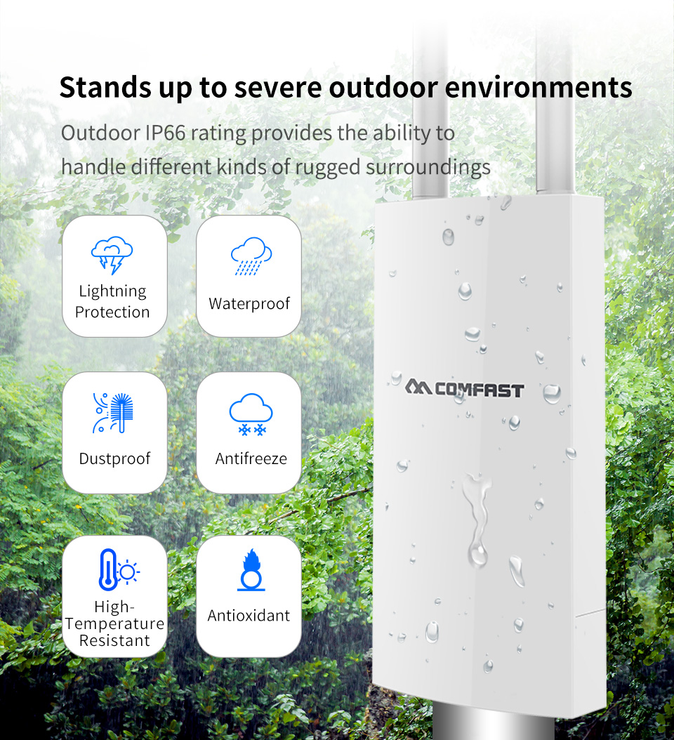 *The product images and demonstration scenarios on this page are for illustrative purposes only and may have slight differences from the actual product. Please refer to the physical product for accuracy. *The data on this page are theoretical values obtained from COMFAST’s internal laboratory under specific testing conditions. Actual usage may vary due to individual product differences, software versions, usage conditions, and environmental factors. Please refer to real-world usage for accurate representation. *To provide as accurate product information, specifications, and features as possible, COMFAST may periodically adjust and revise the text descriptions, image effects, and other content on this page to ensure alignment with actual product performance, specifications, packaging, and accessories. Should such adjustments or revisions become necessary, no prior notice will be provided.