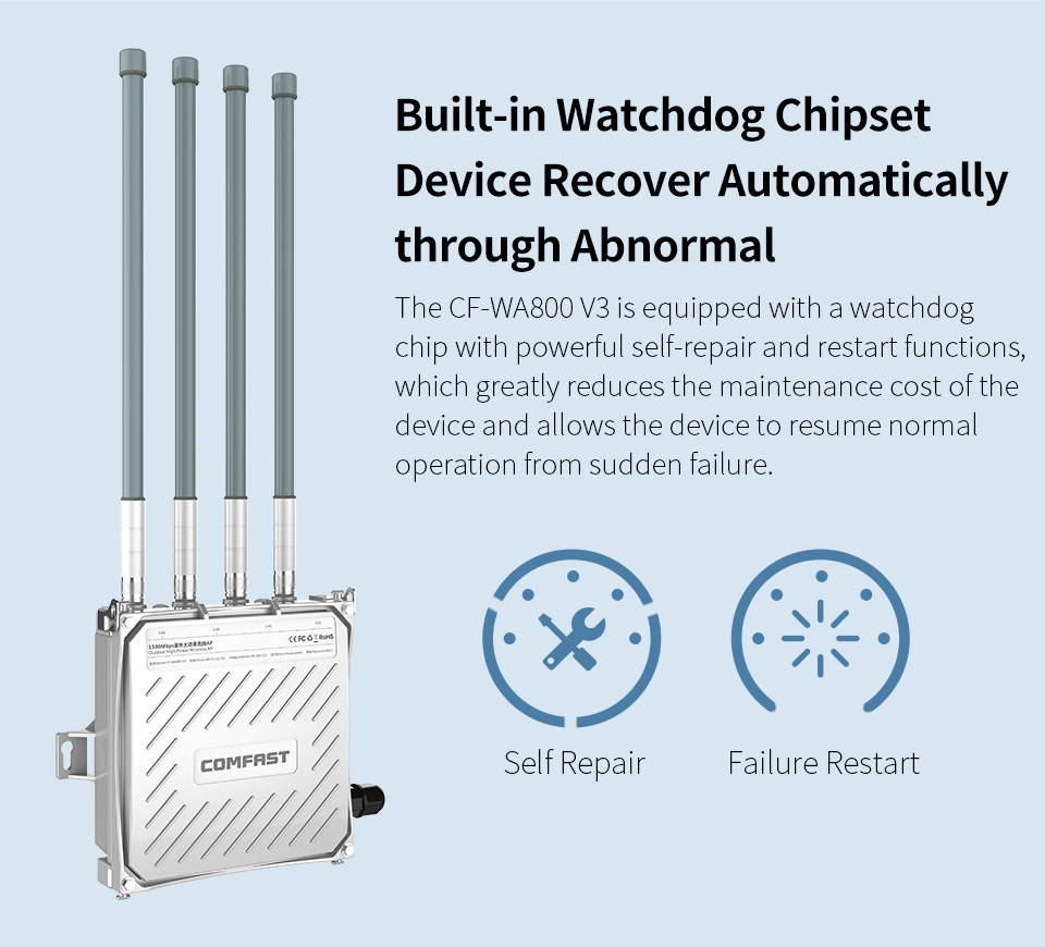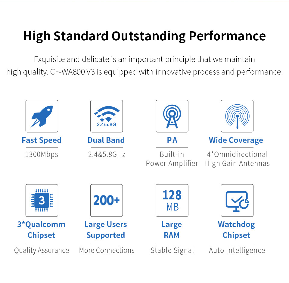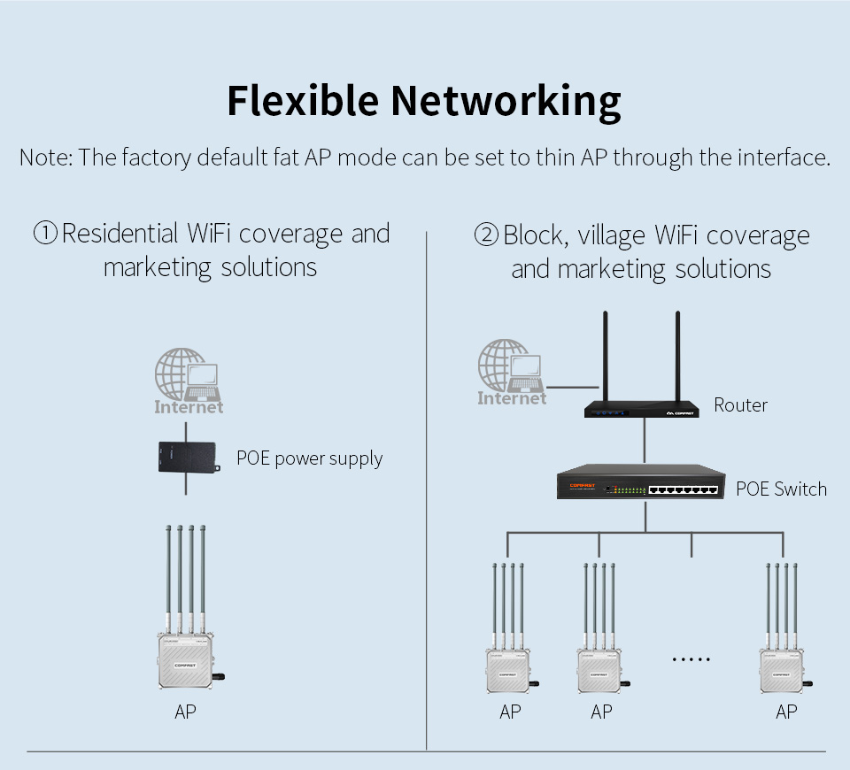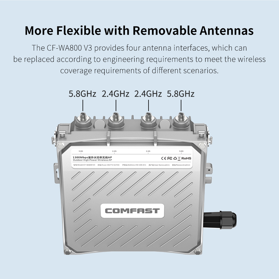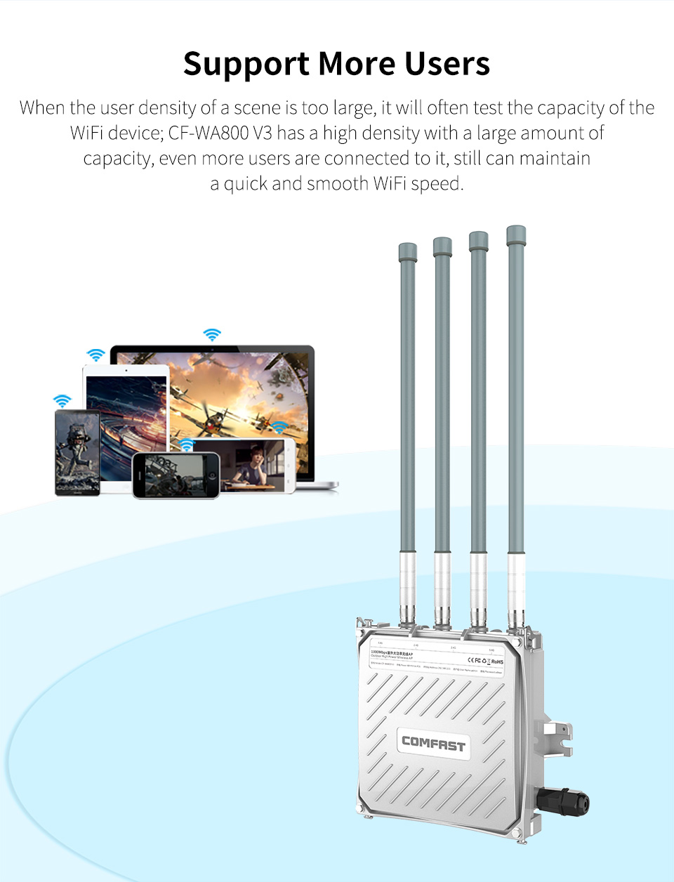 *The product images and demonstration scenarios on this page are for illustrative purposes only and may have slight differences from the actual product. Please refer to the physical product for accuracy. *The data on this page are theoretical values obtained from COMFAST’s internal laboratory under specific testing conditions. Actual usage may vary due to individual product differences, software versions, usage conditions, and environmental factors. Please refer to real-world usage for accurate representation. *To provide as accurate product information, specifications, and features as possible, COMFAST may periodically adjust and revise the text descriptions, image effects, and other content on this page to ensure alignment with actual product performance, specifications, packaging, and accessories. Should such adjustments or revisions become necessary, no prior notice will be provided.