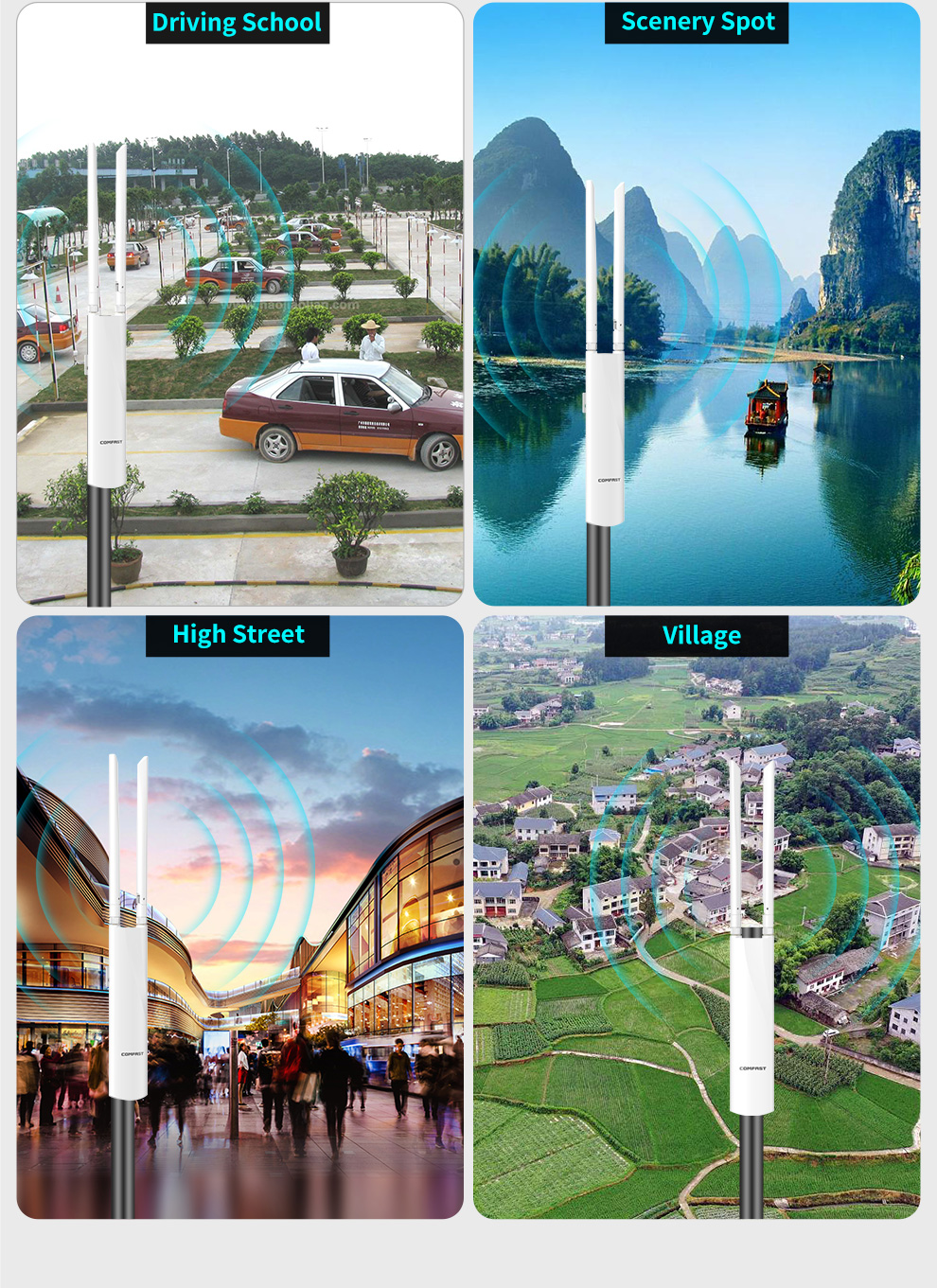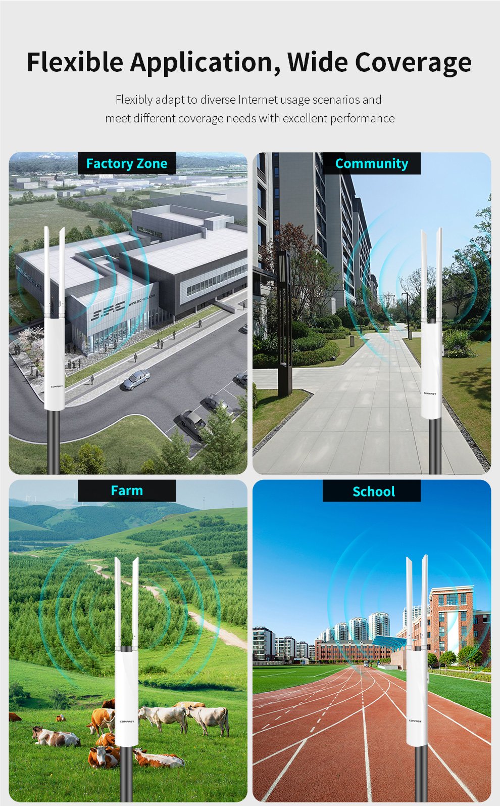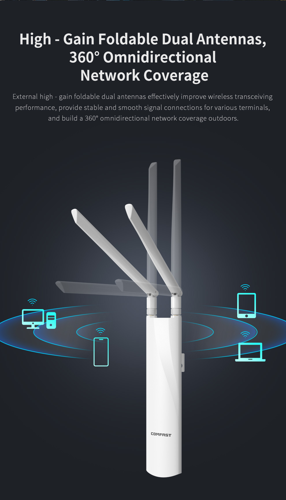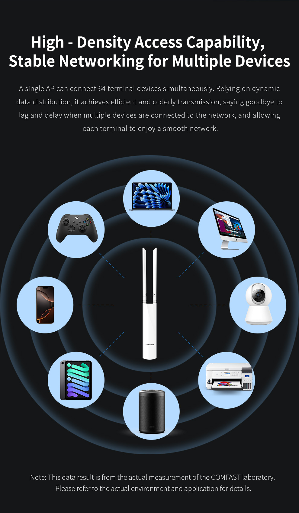 *The product images and demonstration scenarios on this page are for illustrative purposes only and may have slight differences from the actual product. Please refer to the physical product for accuracy. *The data on this page are theoretical values obtained from COMFAST’s internal laboratory under specific testing conditions. Actual usage may vary due to individual product differences, software versions, usage conditions, and environmental factors. Please refer to real-world usage for accurate representation. *To provide as accurate product information, specifications, and features as possible, COMFAST may periodically adjust and revise the text descriptions, image effects, and other content on this page to ensure alignment with actual product performance, specifications, packaging, and accessories. Should such adjustments or revisions become necessary, no prior notice will be provided.