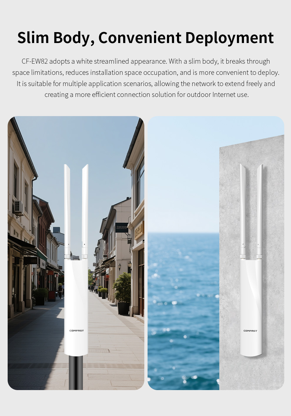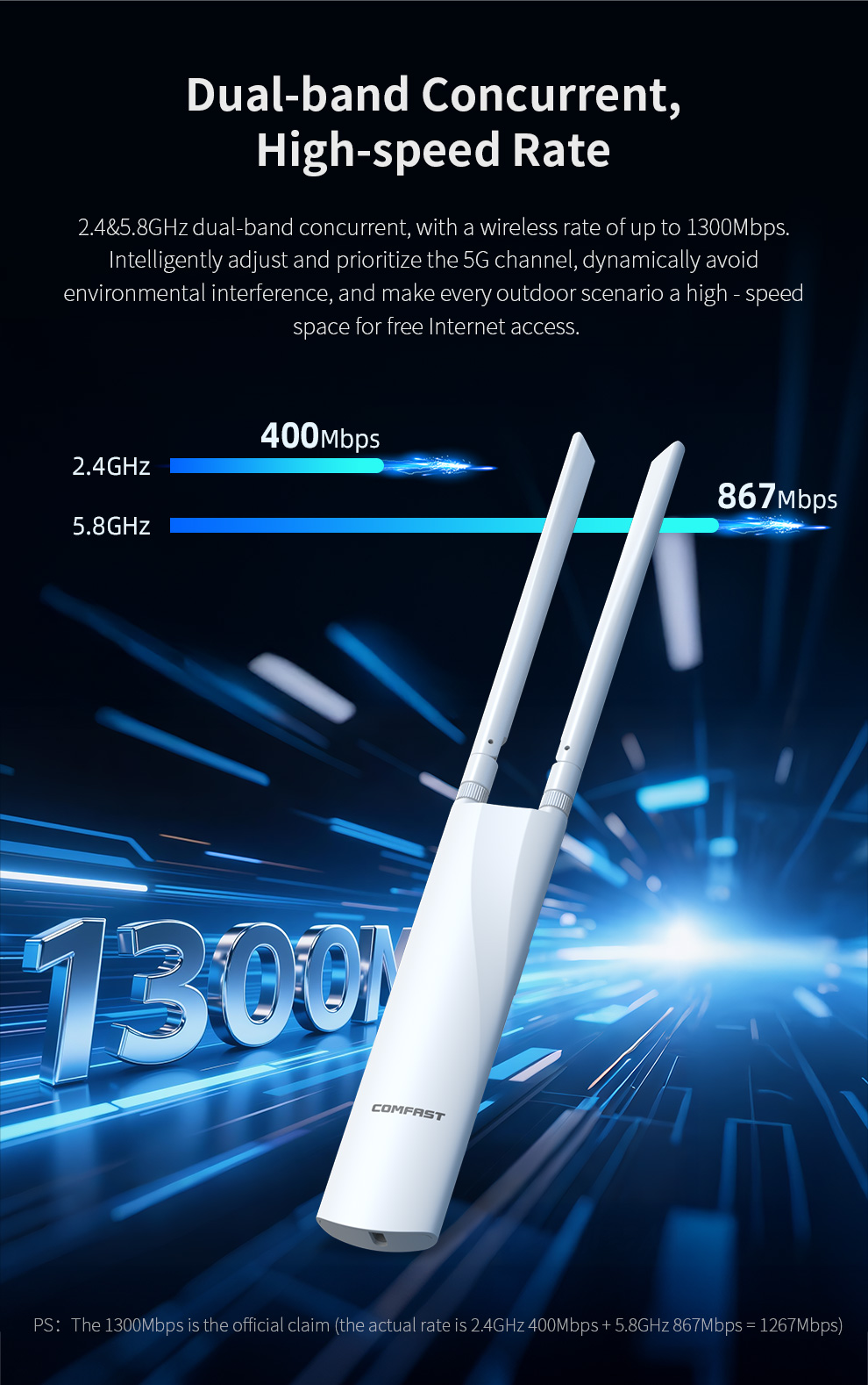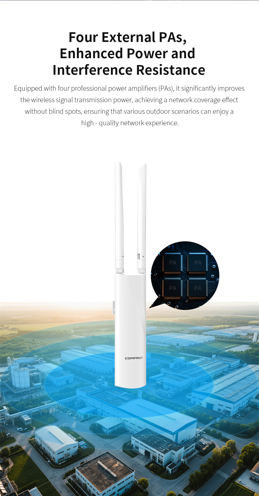 *The product images and demonstration scenarios on this page are for illustrative purposes only and may have slight differences from the actual product. Please refer to the physical product for accuracy. *The data on this page are theoretical values obtained from COMFAST’s internal laboratory under specific testing conditions. Actual usage may vary due to individual product differences, software versions, usage conditions, and environmental factors. Please refer to real-world usage for accurate representation. *To provide as accurate product information, specifications, and features as possible, COMFAST may periodically adjust and revise the text descriptions, image effects, and other content on this page to ensure alignment with actual product performance, specifications, packaging, and accessories. Should such adjustments or revisions become necessary, no prior notice will be provided.
