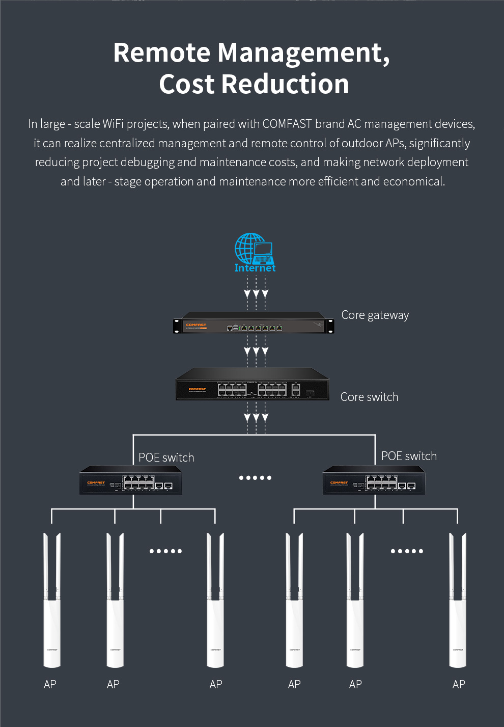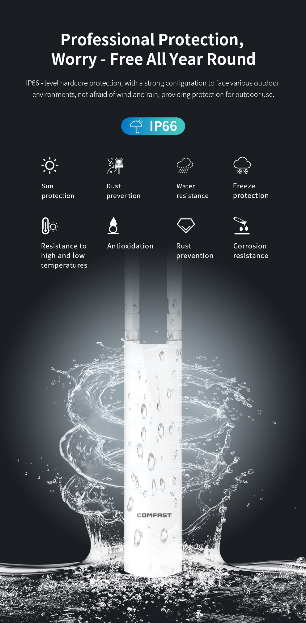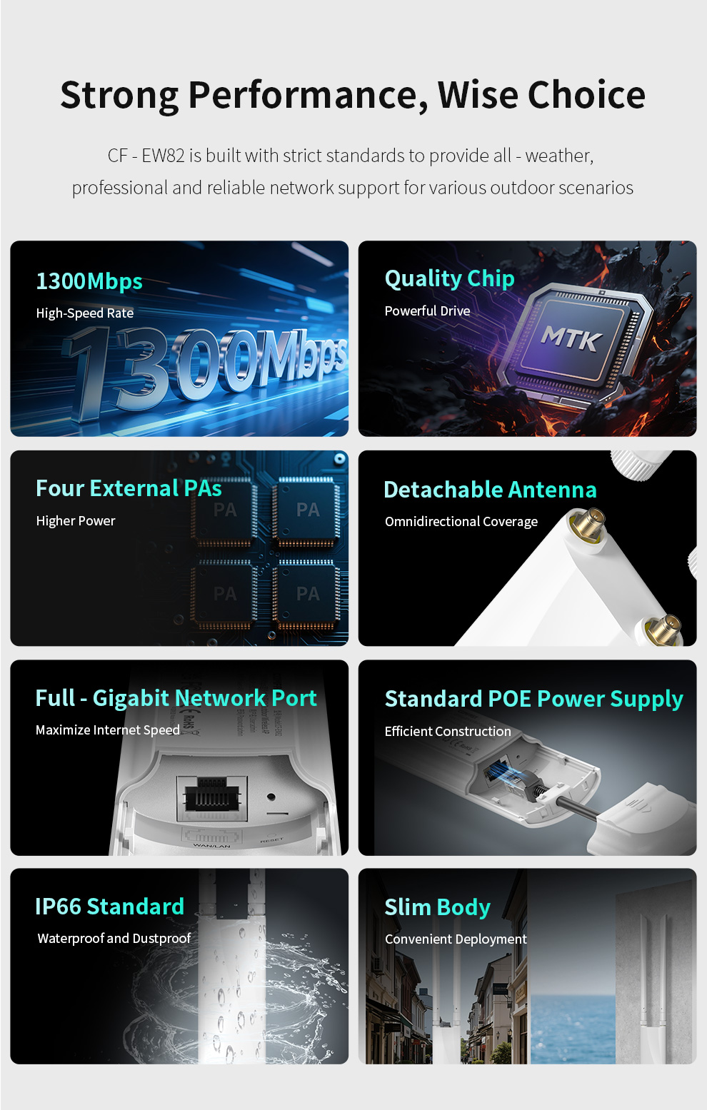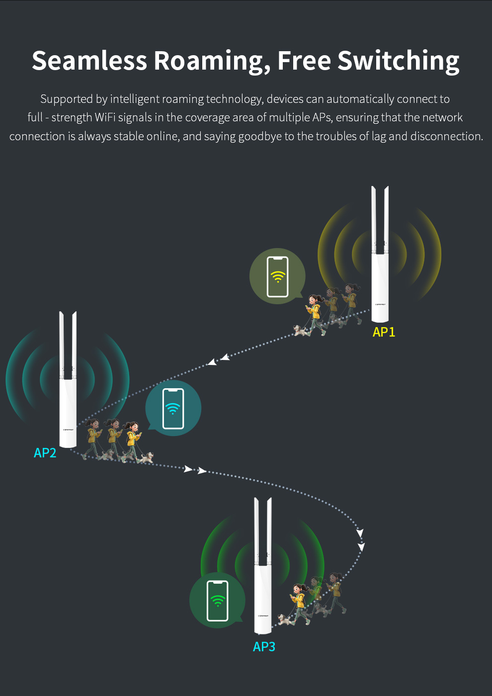 *The product images and demonstration scenarios on this page are for illustrative purposes only and may have slight differences from the actual product. Please refer to the physical product for accuracy. *The data on this page are theoretical values obtained from COMFAST’s internal laboratory under specific testing conditions. Actual usage may vary due to individual product differences, software versions, usage conditions, and environmental factors. Please refer to real-world usage for accurate representation. *To provide as accurate product information, specifications, and features as possible, COMFAST may periodically adjust and revise the text descriptions, image effects, and other content on this page to ensure alignment with actual product performance, specifications, packaging, and accessories. Should such adjustments or revisions become necessary, no prior notice will be provided.