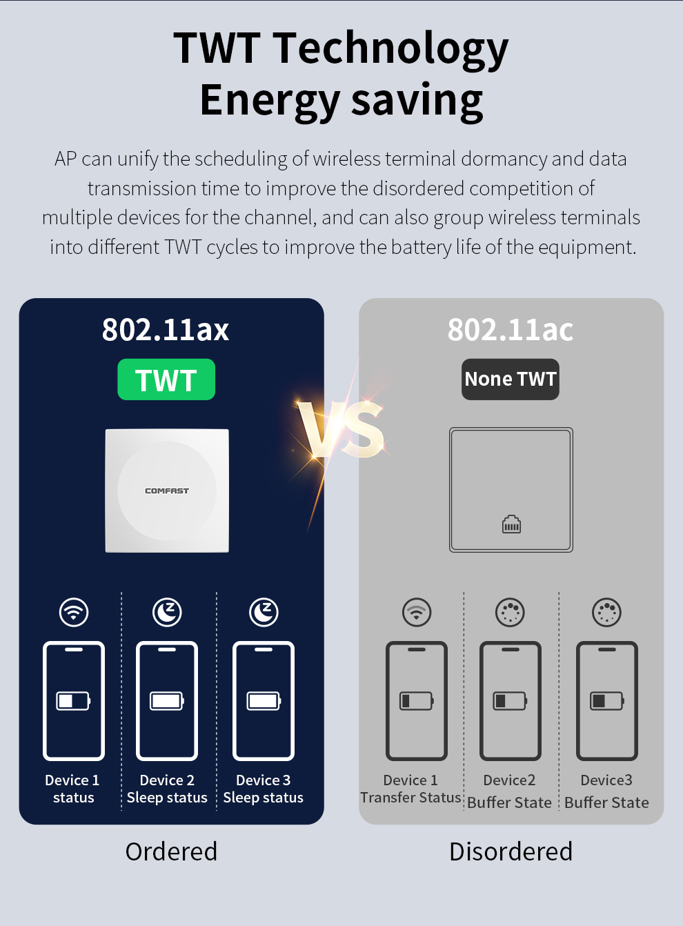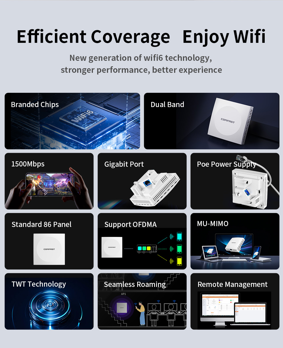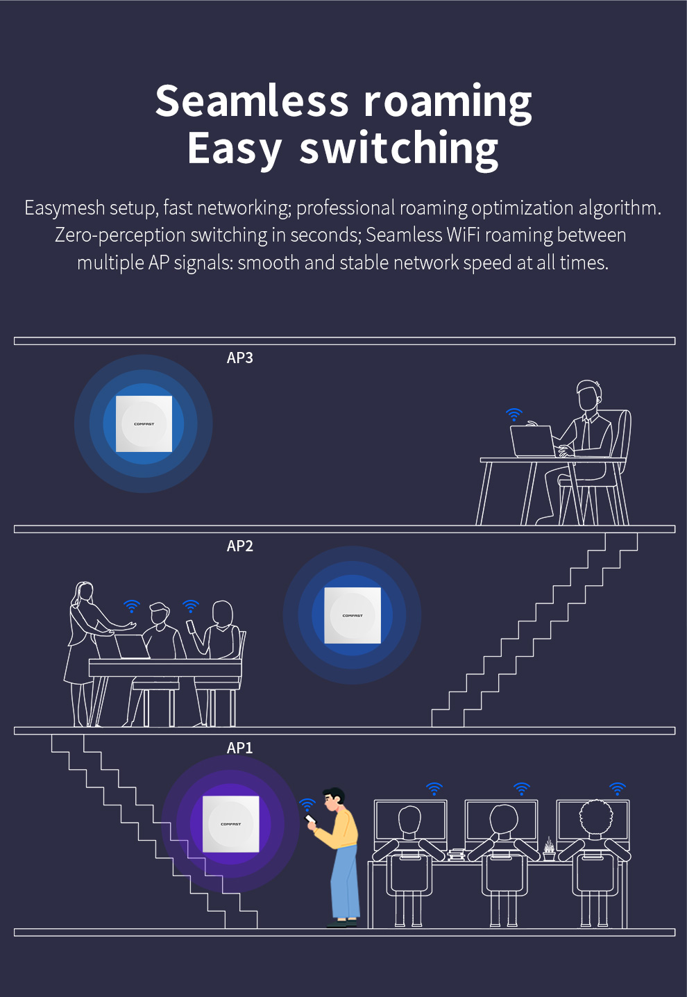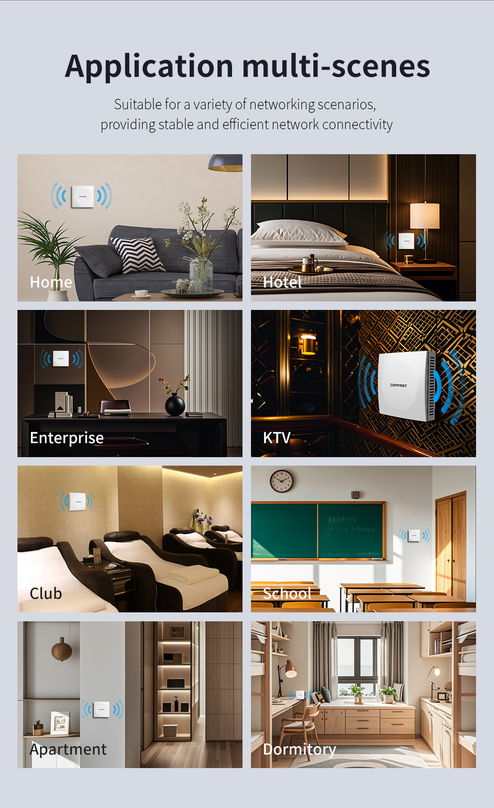 *The product images and demonstration scenarios on this page are for illustrative purposes only and may have slight differences from the actual product. Please refer to the physical product for accuracy. *The data on this page are theoretical values obtained from COMFAST’s internal laboratory under specific testing conditions. Actual usage may vary due to individual product differences, software versions, usage conditions, and environmental factors. Please refer to real-world usage for accurate representation. *To provide as accurate product information, specifications, and features as possible, COMFAST may periodically adjust and revise the text descriptions, image effects, and other content on this page to ensure alignment with actual product performance, specifications, packaging, and accessories. Should such adjustments or revisions become necessary, no prior notice will be provided.