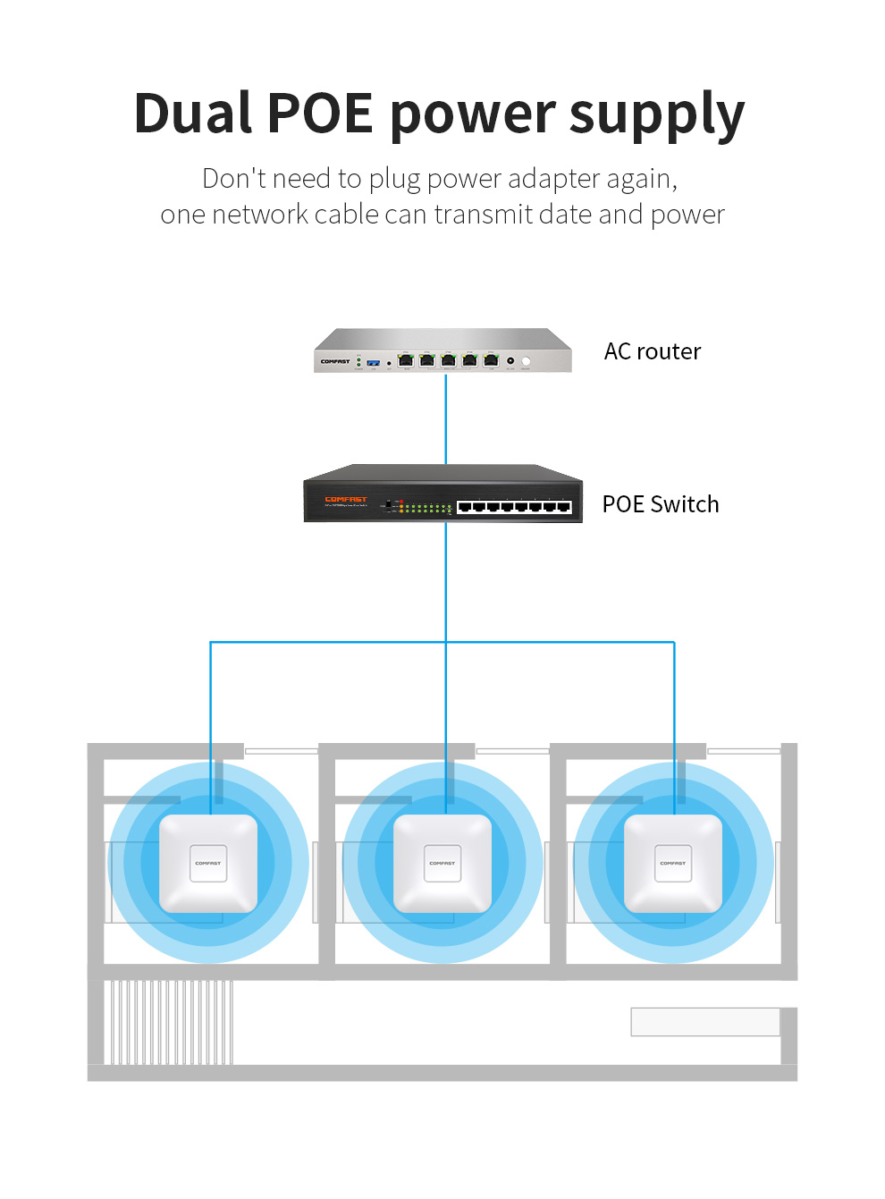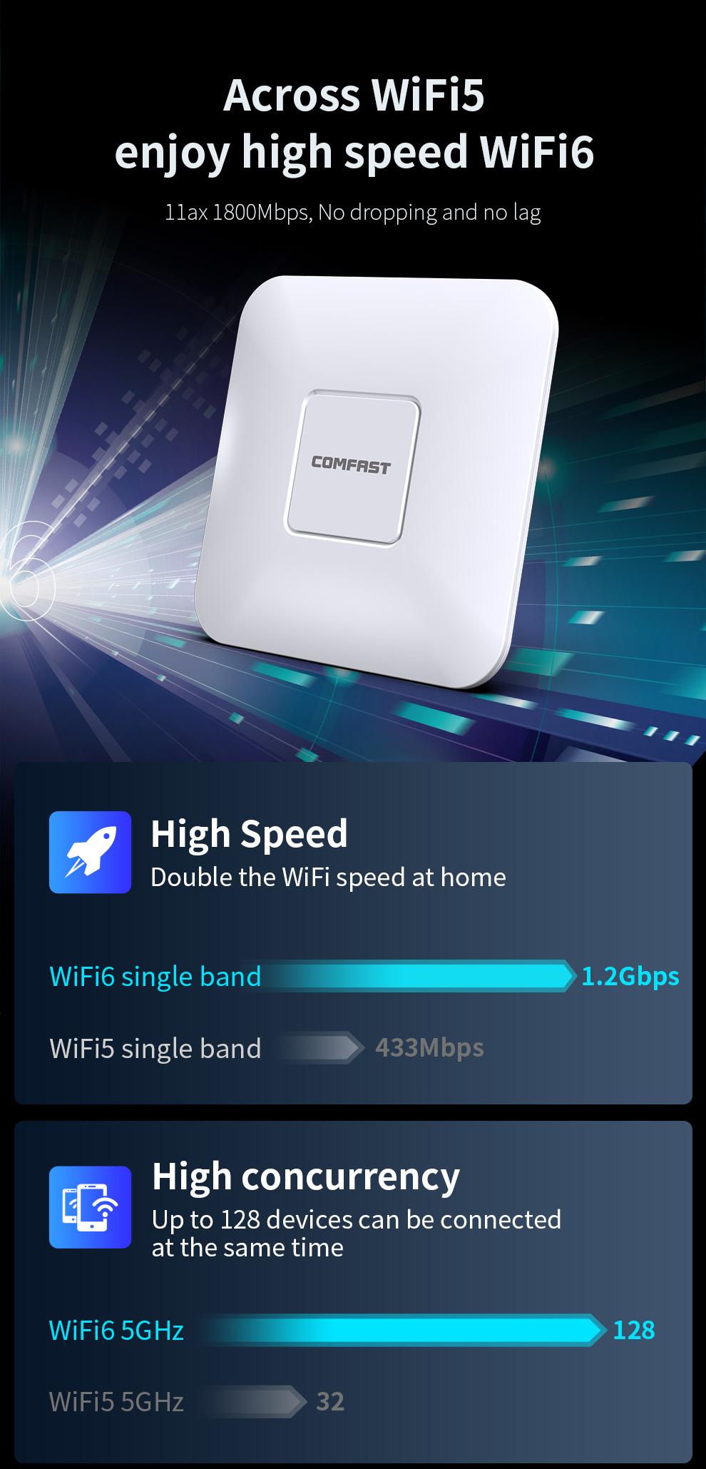 *The product images and demonstration scenarios on this page are for illustrative purposes only and may have slight differences from the actual product. Please refer to the physical product for accuracy. *The data on this page are theoretical values obtained from COMFAST’s internal laboratory under specific testing conditions. Actual usage may vary due to individual product differences, software versions, usage conditions, and environmental factors. Please refer to real-world usage for accurate representation. *To provide as accurate product information, specifications, and features as possible, COMFAST may periodically adjust and revise the text descriptions, image effects, and other content on this page to ensure alignment with actual product performance, specifications, packaging, and accessories. Should such adjustments or revisions become necessary, no prior notice will be provided.