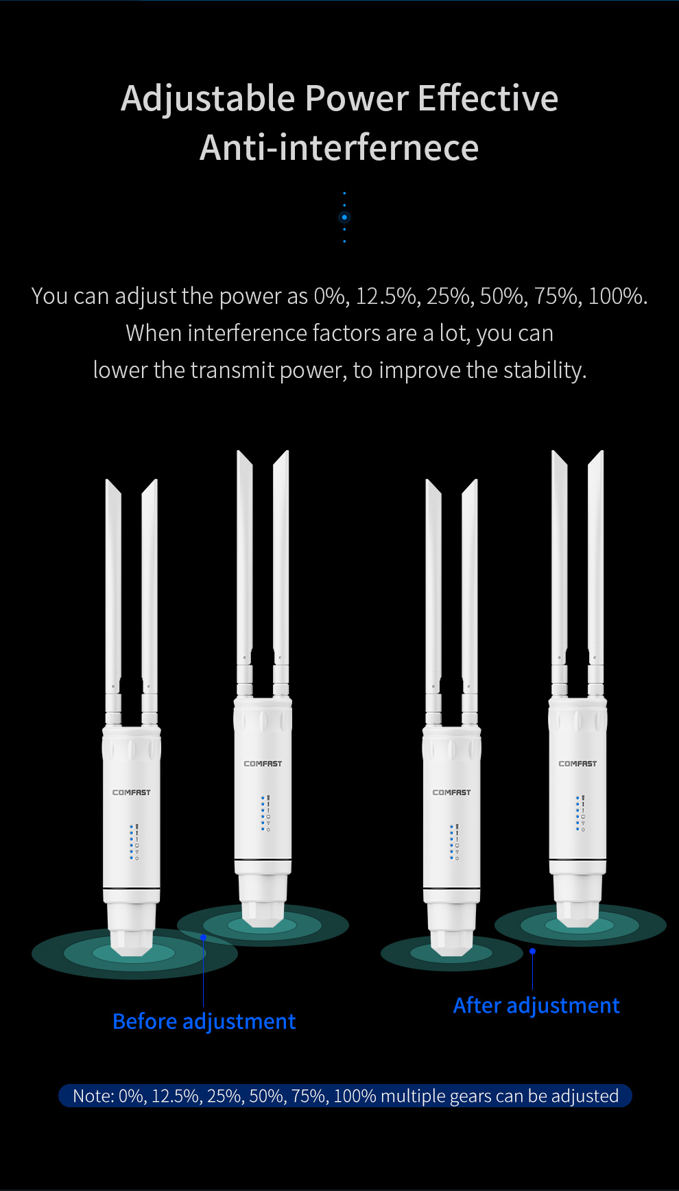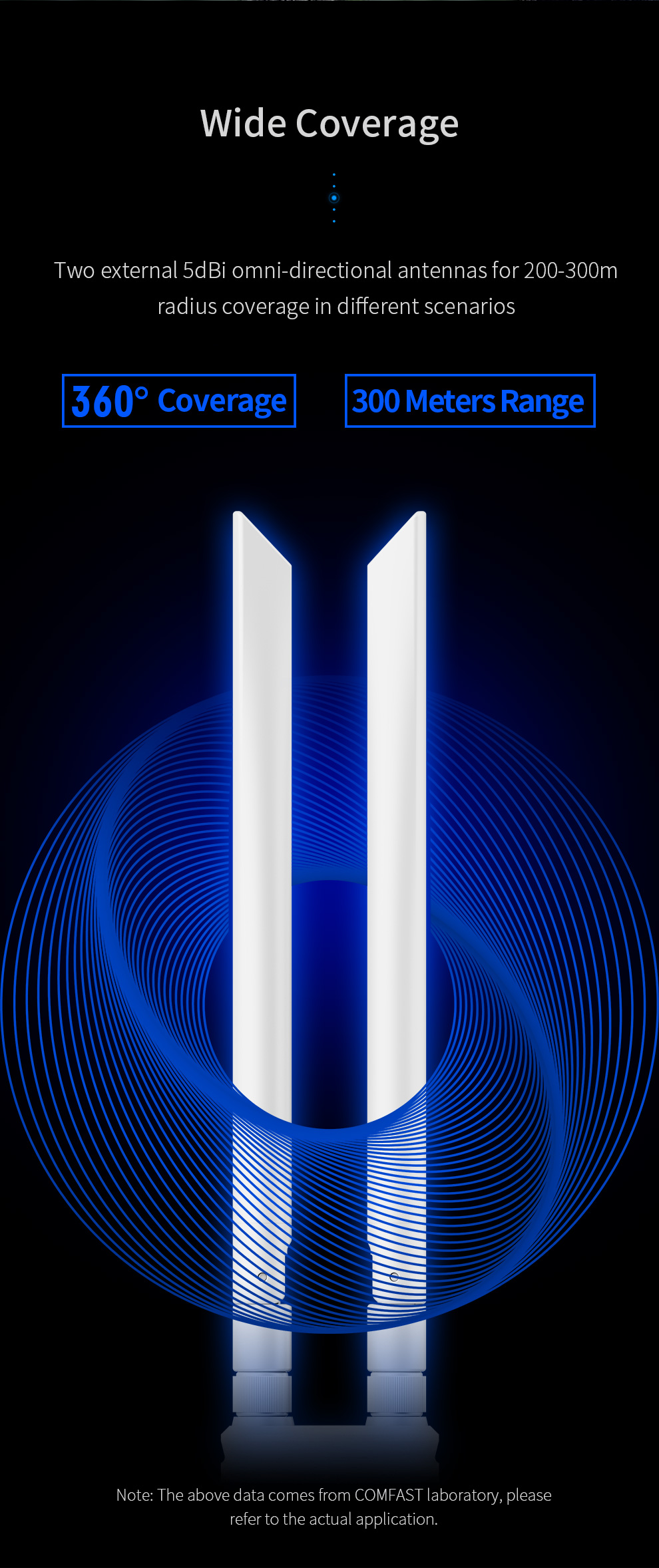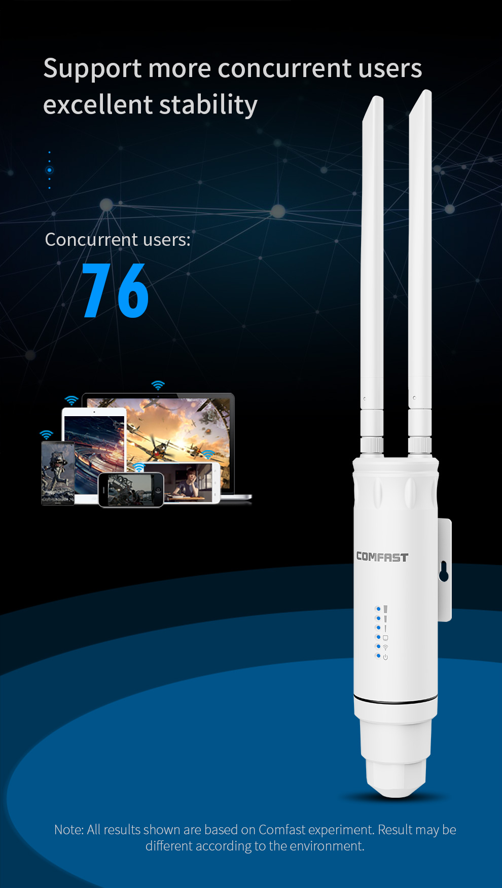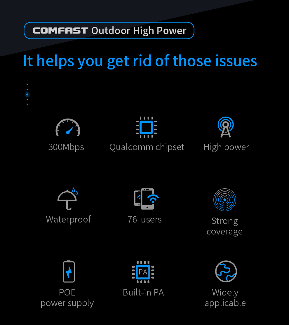 *The product images and demonstration scenarios on this page are for illustrative purposes only and may have slight differences from the actual product. Please refer to the physical product for accuracy. *The data on this page are theoretical values obtained from COMFAST’s internal laboratory under specific testing conditions. Actual usage may vary due to individual product differences, software versions, usage conditions, and environmental factors. Please refer to real-world usage for accurate representation. *To provide as accurate product information, specifications, and features as possible, COMFAST may periodically adjust and revise the text descriptions, image effects, and other content on this page to ensure alignment with actual product performance, specifications, packaging, and accessories. Should such adjustments or revisions become necessary, no prior notice will be provided.
