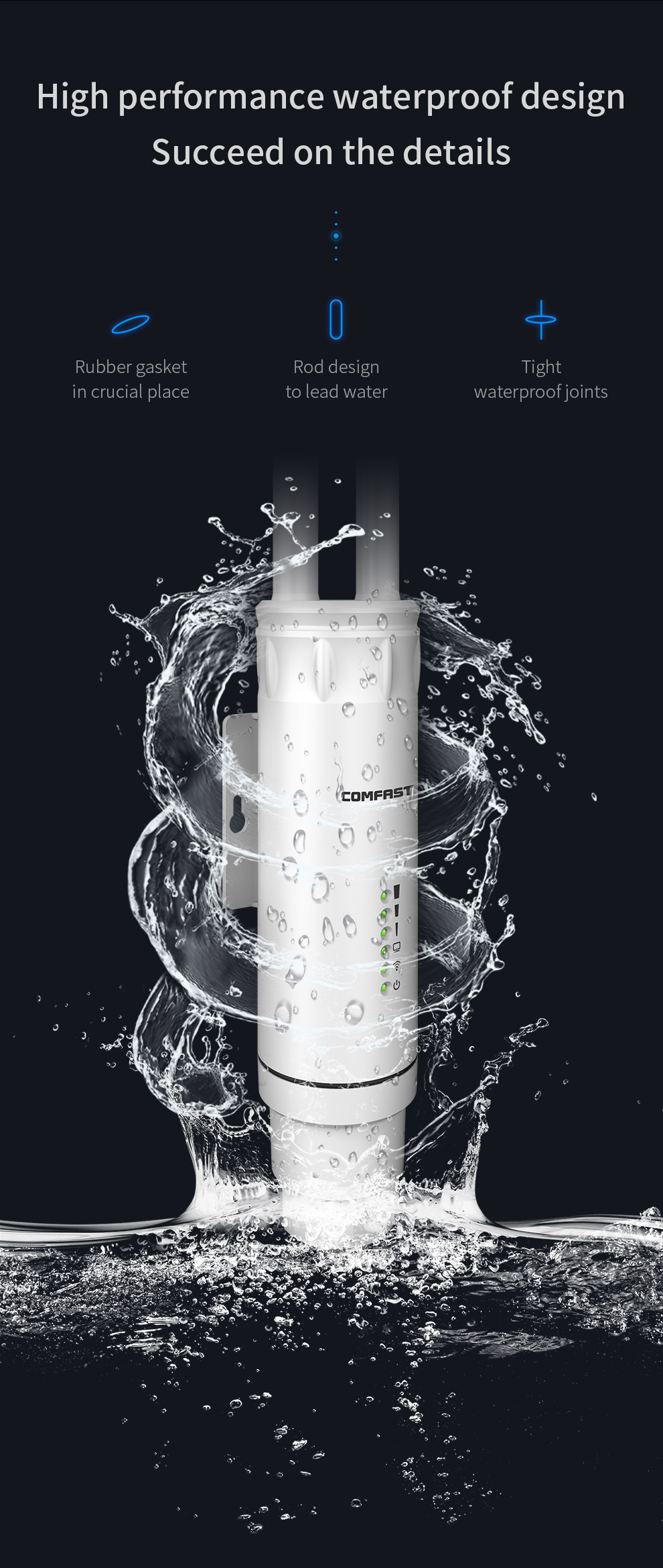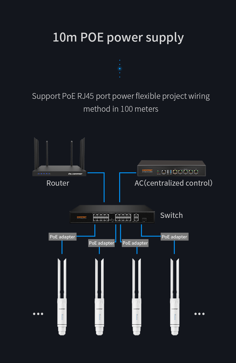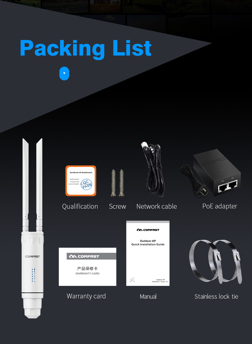 *The product images and demonstration scenarios on this page are for illustrative purposes only and may have slight differences from the actual product. Please refer to the physical product for accuracy. *The data on this page are theoretical values obtained from COMFAST’s internal laboratory under specific testing conditions. Actual usage may vary due to individual product differences, software versions, usage conditions, and environmental factors. Please refer to real-world usage for accurate representation. *To provide as accurate product information, specifications, and features as possible, COMFAST may periodically adjust and revise the text descriptions, image effects, and other content on this page to ensure alignment with actual product performance, specifications, packaging, and accessories. Should such adjustments or revisions become necessary, no prior notice will be provided.