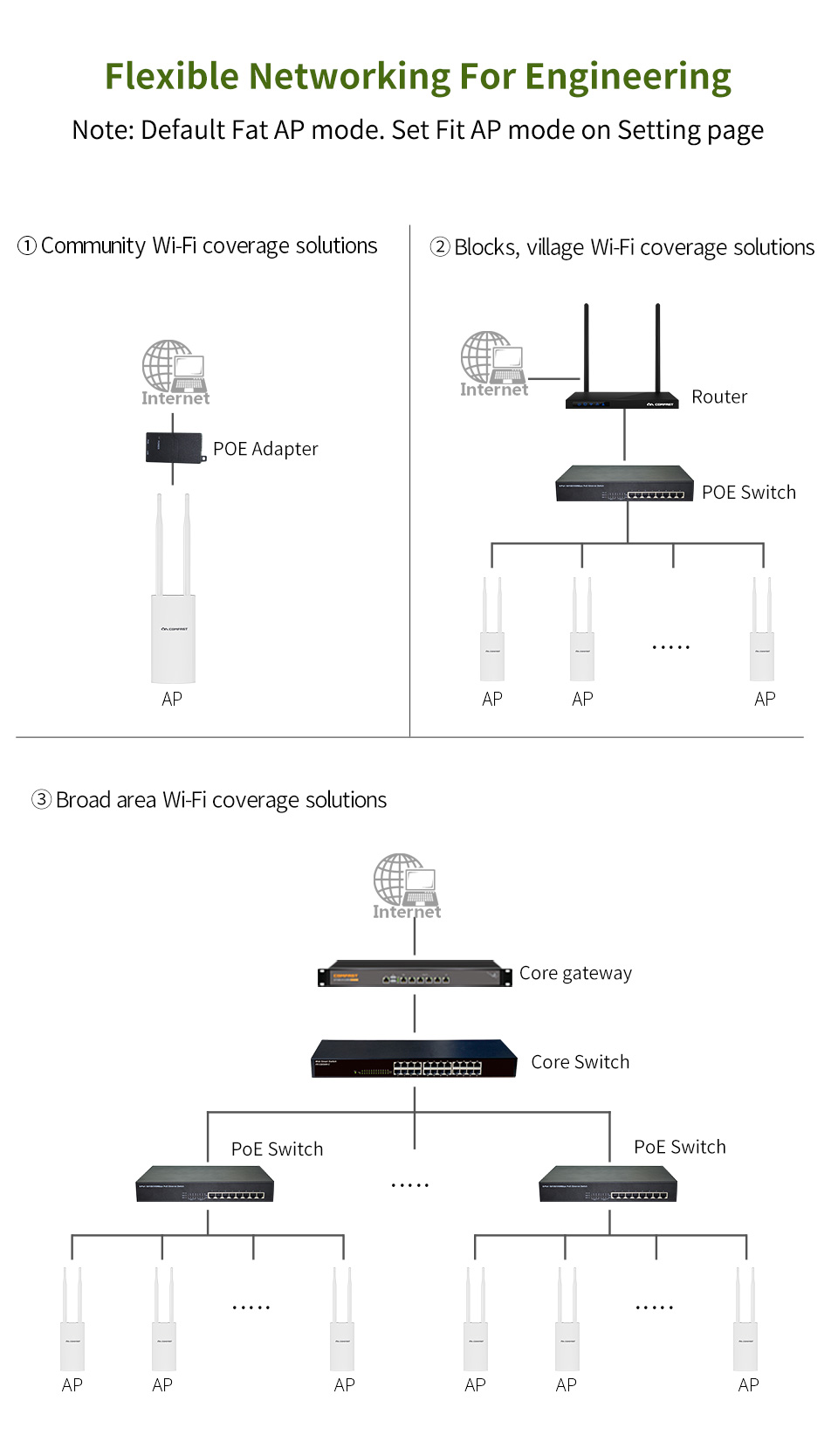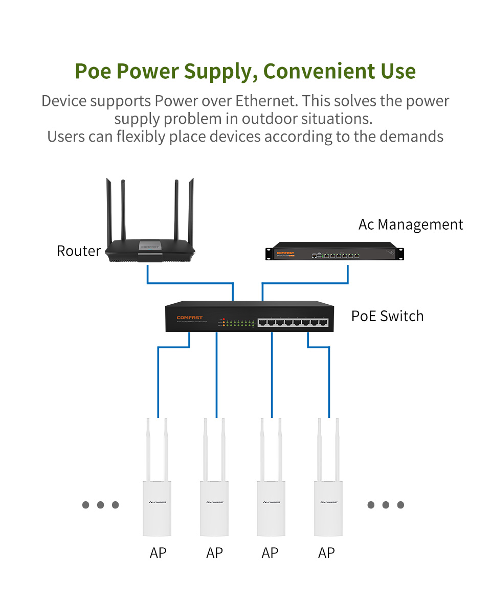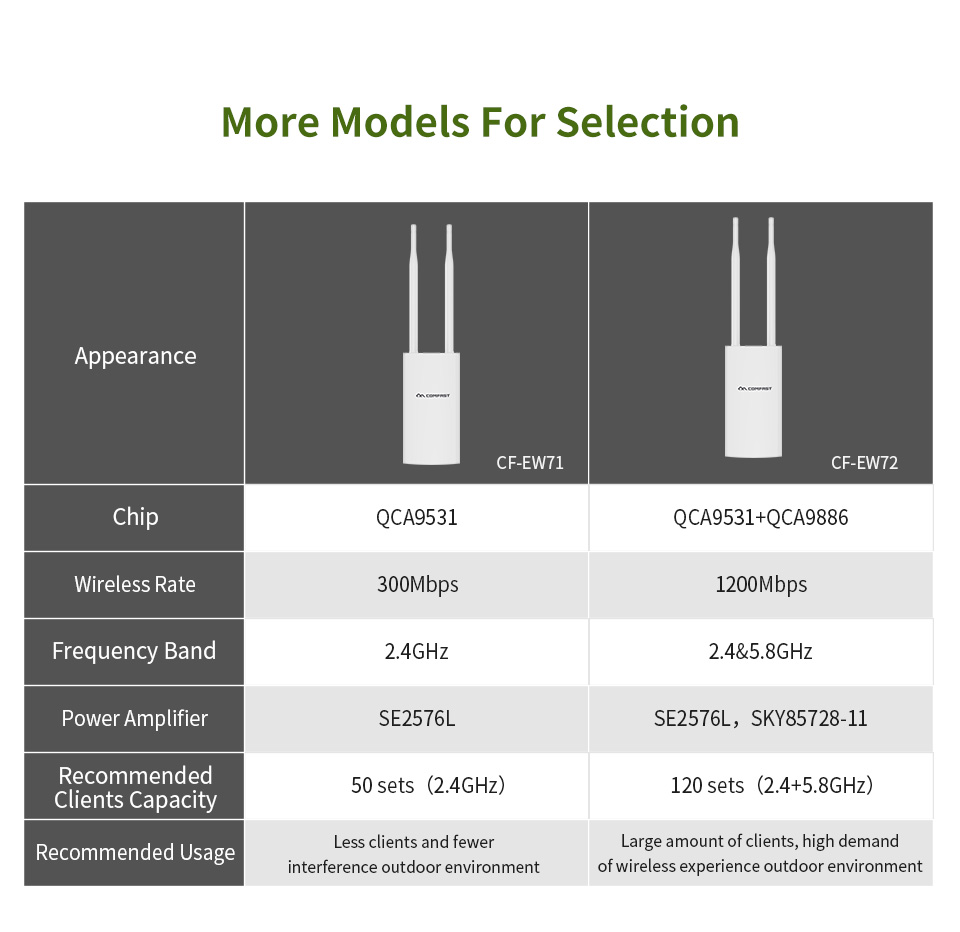 *The product images and demonstration scenarios on this page are for illustrative purposes only and may have slight differences from the actual product. Please refer to the physical product for accuracy. *The data on this page are theoretical values obtained from COMFAST’s internal laboratory under specific testing conditions. Actual usage may vary due to individual product differences, software versions, usage conditions, and environmental factors. Please refer to real-world usage for accurate representation. *To provide as accurate product information, specifications, and features as possible, COMFAST may periodically adjust and revise the text descriptions, image effects, and other content on this page to ensure alignment with actual product performance, specifications, packaging, and accessories. Should such adjustments or revisions become necessary, no prior notice will be provided.