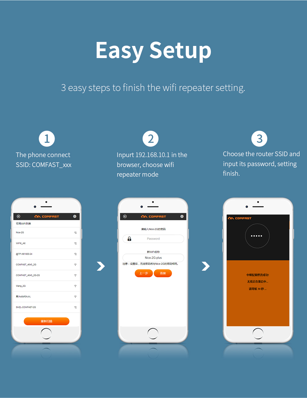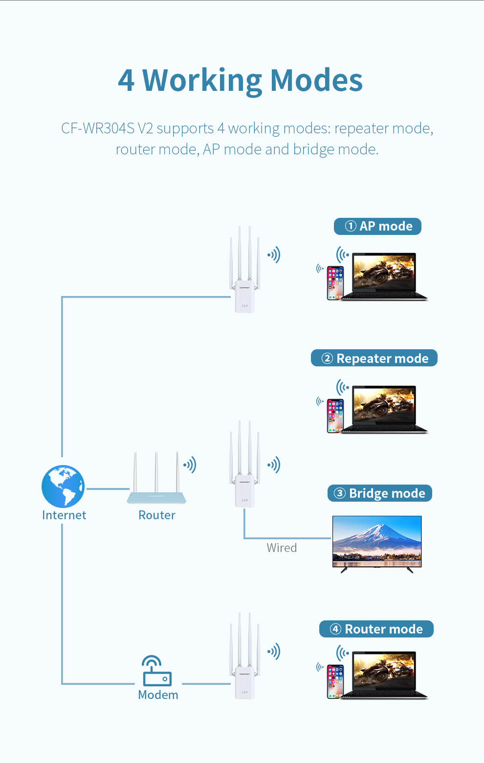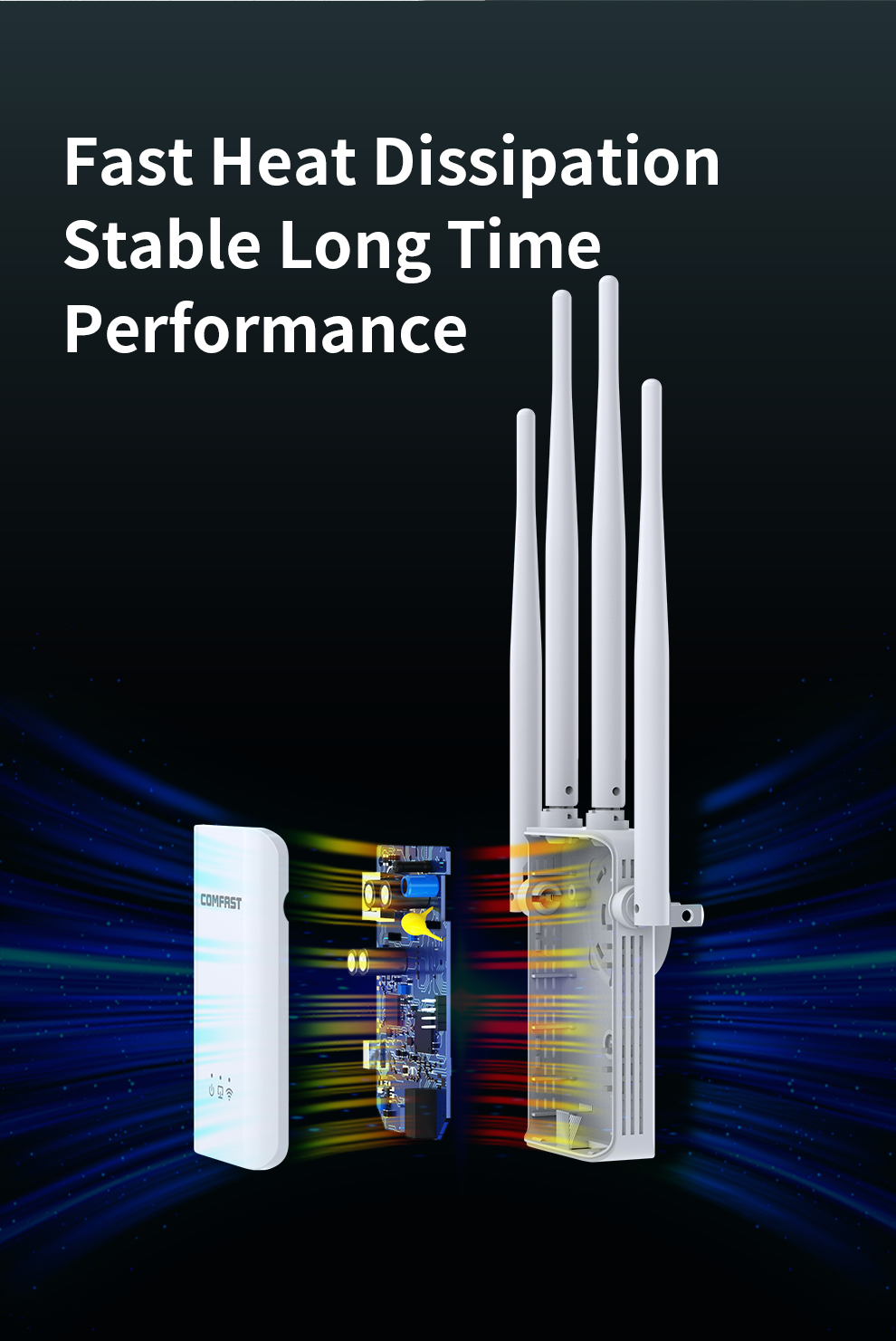 *The product images and demonstration scenarios on this page are for illustrative purposes only and may have slight differences from the actual product. Please refer to the physical product for accuracy. *The data on this page are theoretical values obtained from COMFAST’s internal laboratory under specific testing conditions. Actual usage may vary due to individual product differences, software versions, usage conditions, and environmental factors. Please refer to real-world usage for accurate representation. *To provide as accurate product information, specifications, and features as possible, COMFAST may periodically adjust and revise the text descriptions, image effects, and other content on this page to ensure alignment with actual product performance, specifications, packaging, and accessories. Should such adjustments or revisions become necessary, no prior notice will be provided.