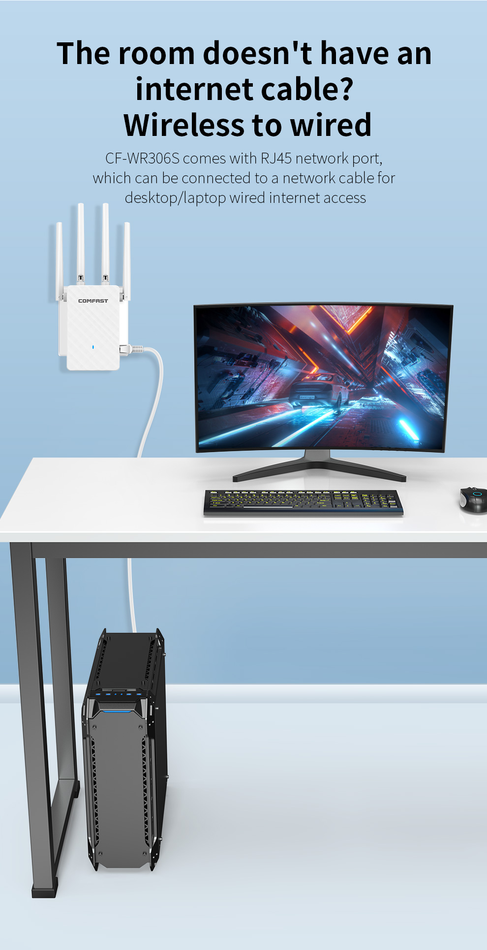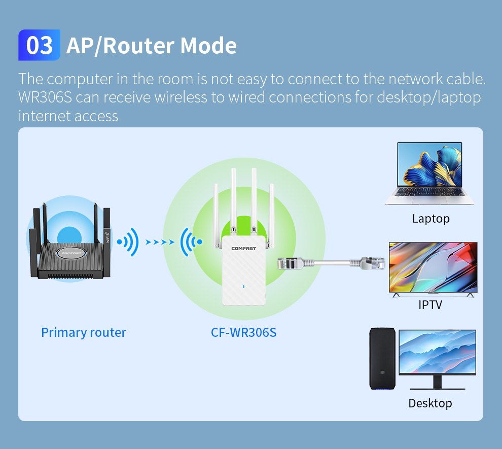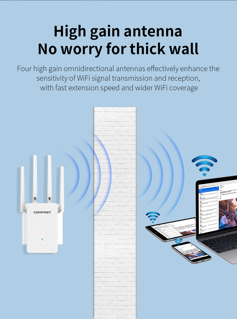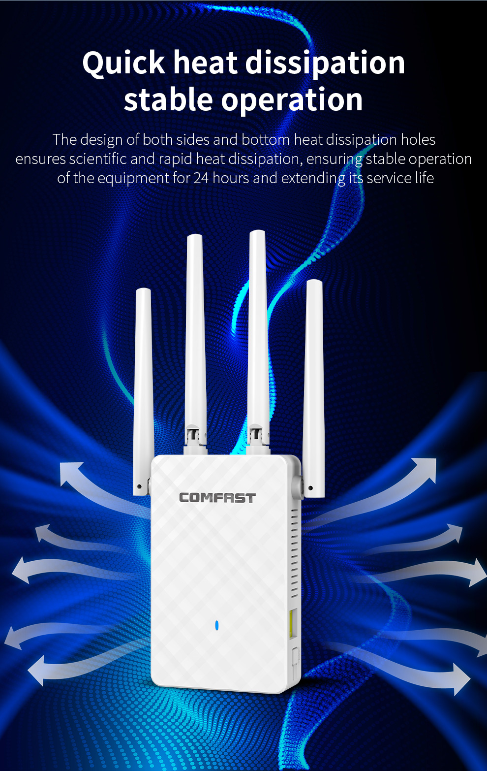 *The product images and demonstration scenarios on this page are for illustrative purposes only and may have slight differences from the actual product. Please refer to the physical product for accuracy. *The data on this page are theoretical values obtained from COMFAST’s internal laboratory under specific testing conditions. Actual usage may vary due to individual product differences, software versions, usage conditions, and environmental factors. Please refer to real-world usage for accurate representation. *To provide as accurate product information, specifications, and features as possible, COMFAST may periodically adjust and revise the text descriptions, image effects, and other content on this page to ensure alignment with actual product performance, specifications, packaging, and accessories. Should such adjustments or revisions become necessary, no prior notice will be provided.