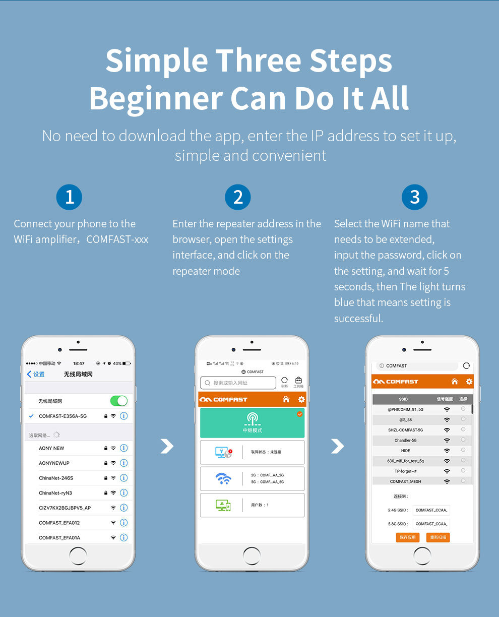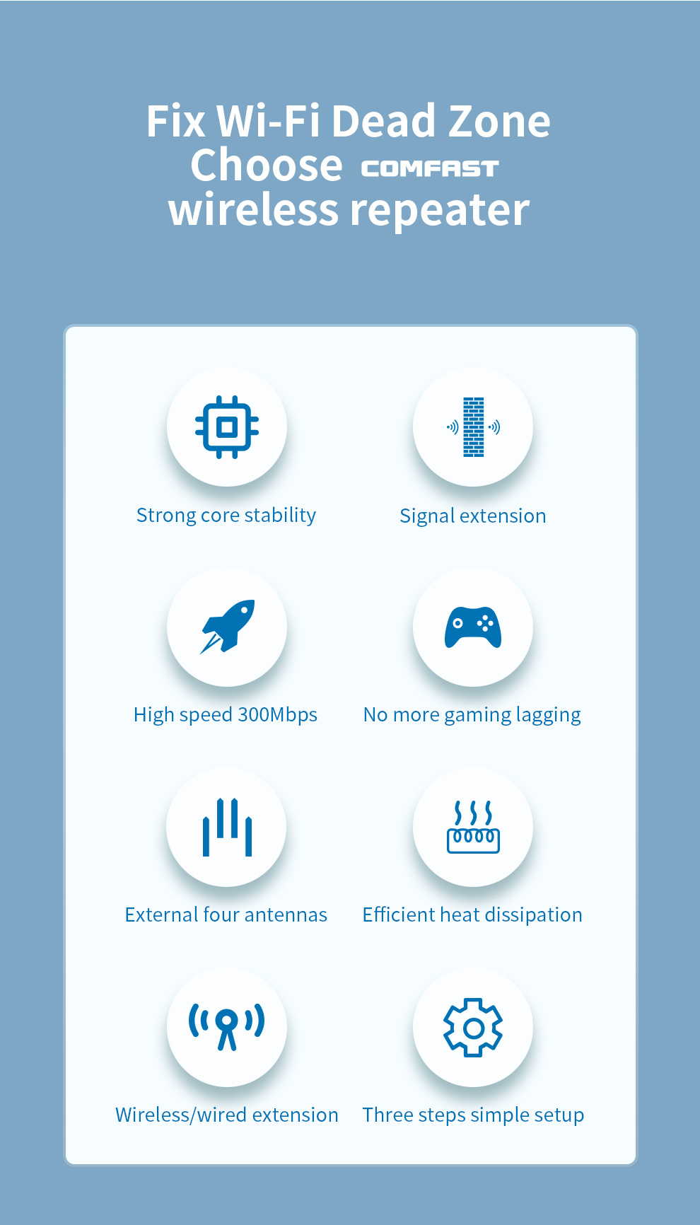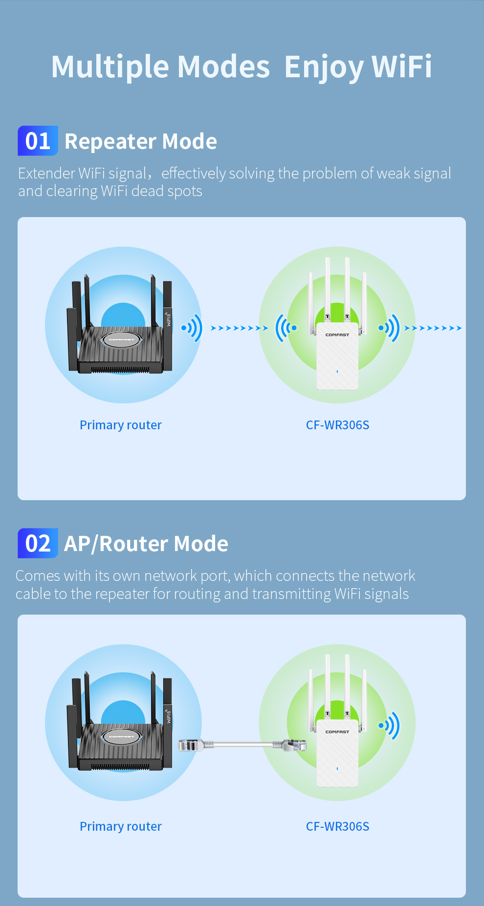 *The product images and demonstration scenarios on this page are for illustrative purposes only and may have slight differences from the actual product. Please refer to the physical product for accuracy. *The data on this page are theoretical values obtained from COMFAST’s internal laboratory under specific testing conditions. Actual usage may vary due to individual product differences, software versions, usage conditions, and environmental factors. Please refer to real-world usage for accurate representation. *To provide as accurate product information, specifications, and features as possible, COMFAST may periodically adjust and revise the text descriptions, image effects, and other content on this page to ensure alignment with actual product performance, specifications, packaging, and accessories. Should such adjustments or revisions become necessary, no prior notice will be provided.