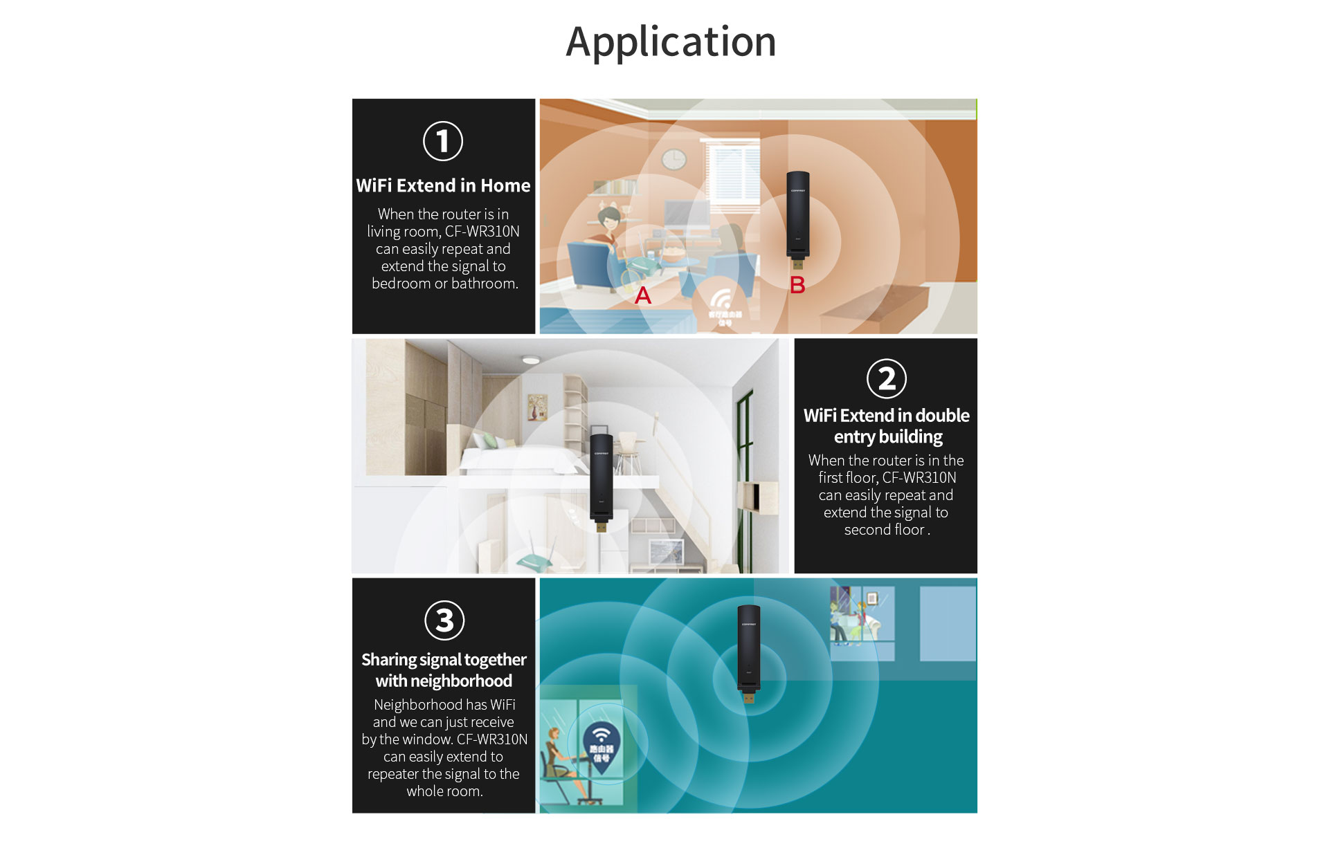 The CF-WR310N is a compact and portable 300Mbps USB-powered wireless range extender. Its unique reversible USB interface allows flexible power from adapters, power banks, or computers. Designed to eliminate WiFi dead zones, it extends coverage effortlessly in homes or offices for smooth streaming and stable connections on all your devices.