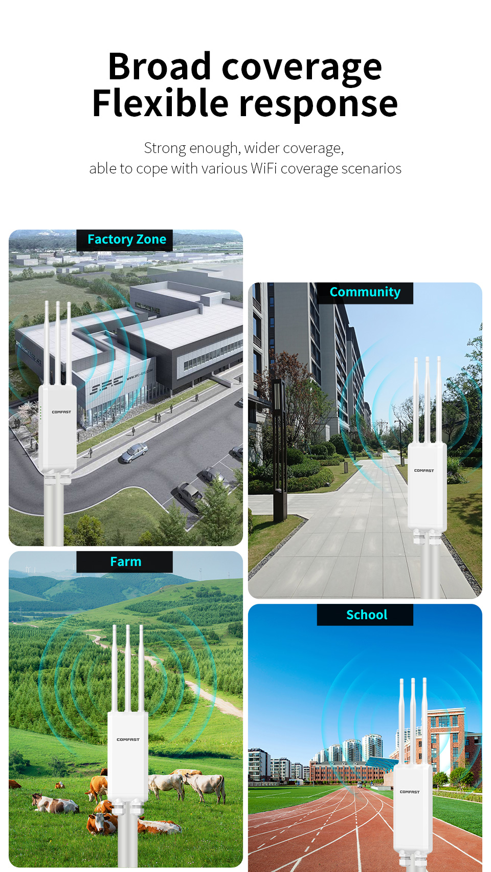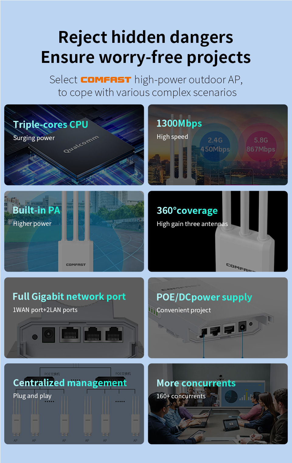 The CF-EW85 is a high-power outdoor AP with 1300Mbps dual-band speed, waterproof antennas, and 360° coverage, perfect for large outdoor areas.