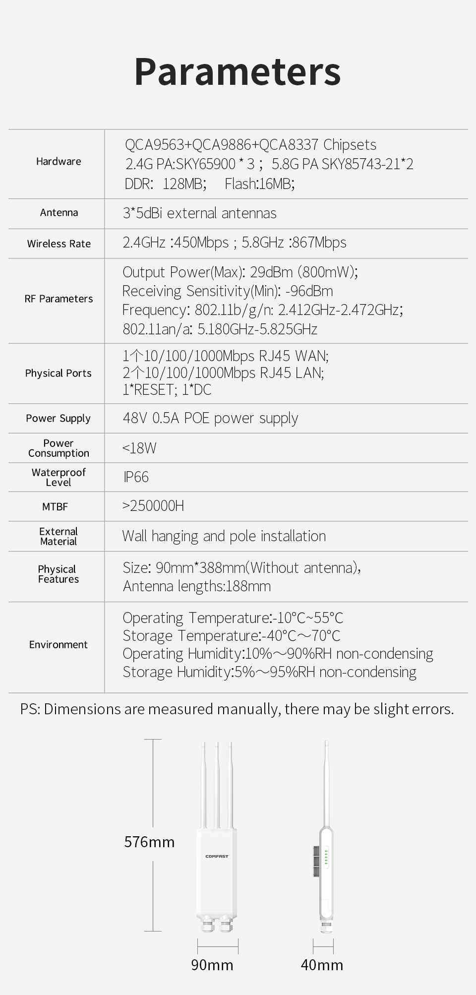 | Dimensions | 90mm x 388.2mm (excluding antennas), antenna length: 188.2mm |
