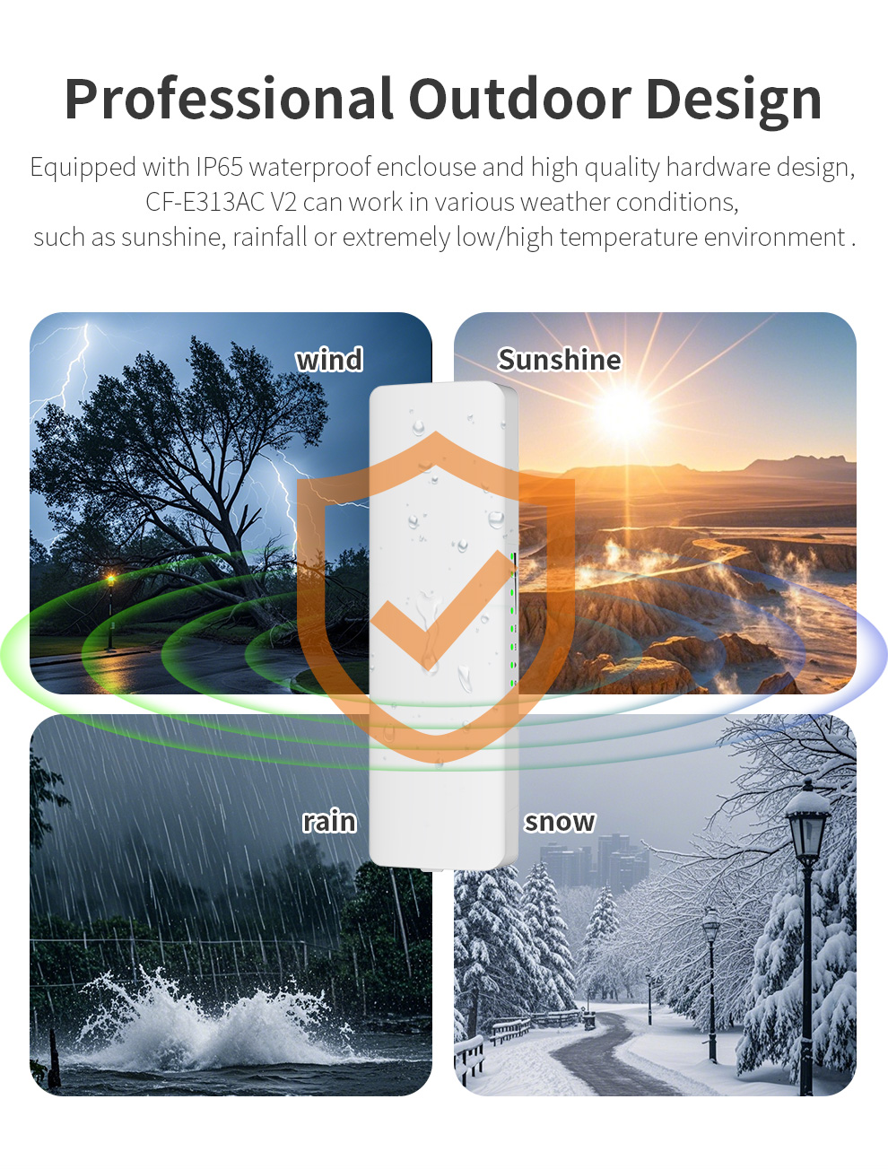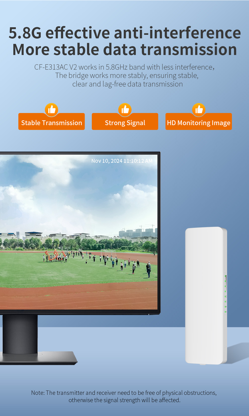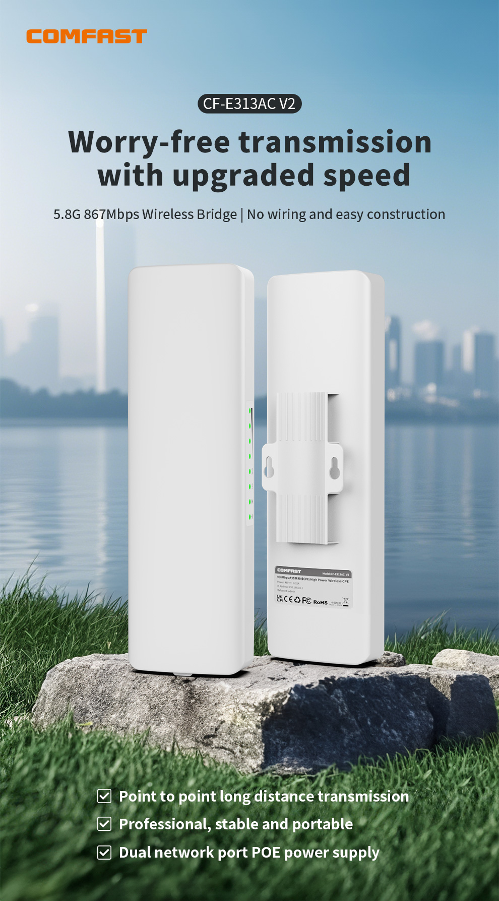 The CF-E313AC V2 is an 867Mbps HD outdoor surveillance bridge operating in the interference-resistant 5.8GHz band with a 5km transmission range. Featuring Qualcomm triple-core chipset and integrated power amplifier, it ensures stable HD video transmission. With dual-port PoE support for powering multiple cameras, it’s an ideal solution for outdoor monitoring projects in scenic areas, ports, and oil fields.