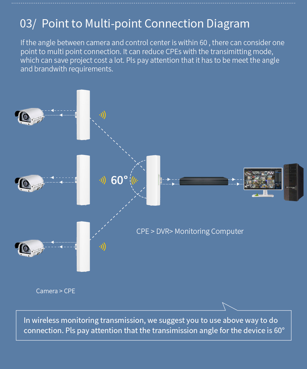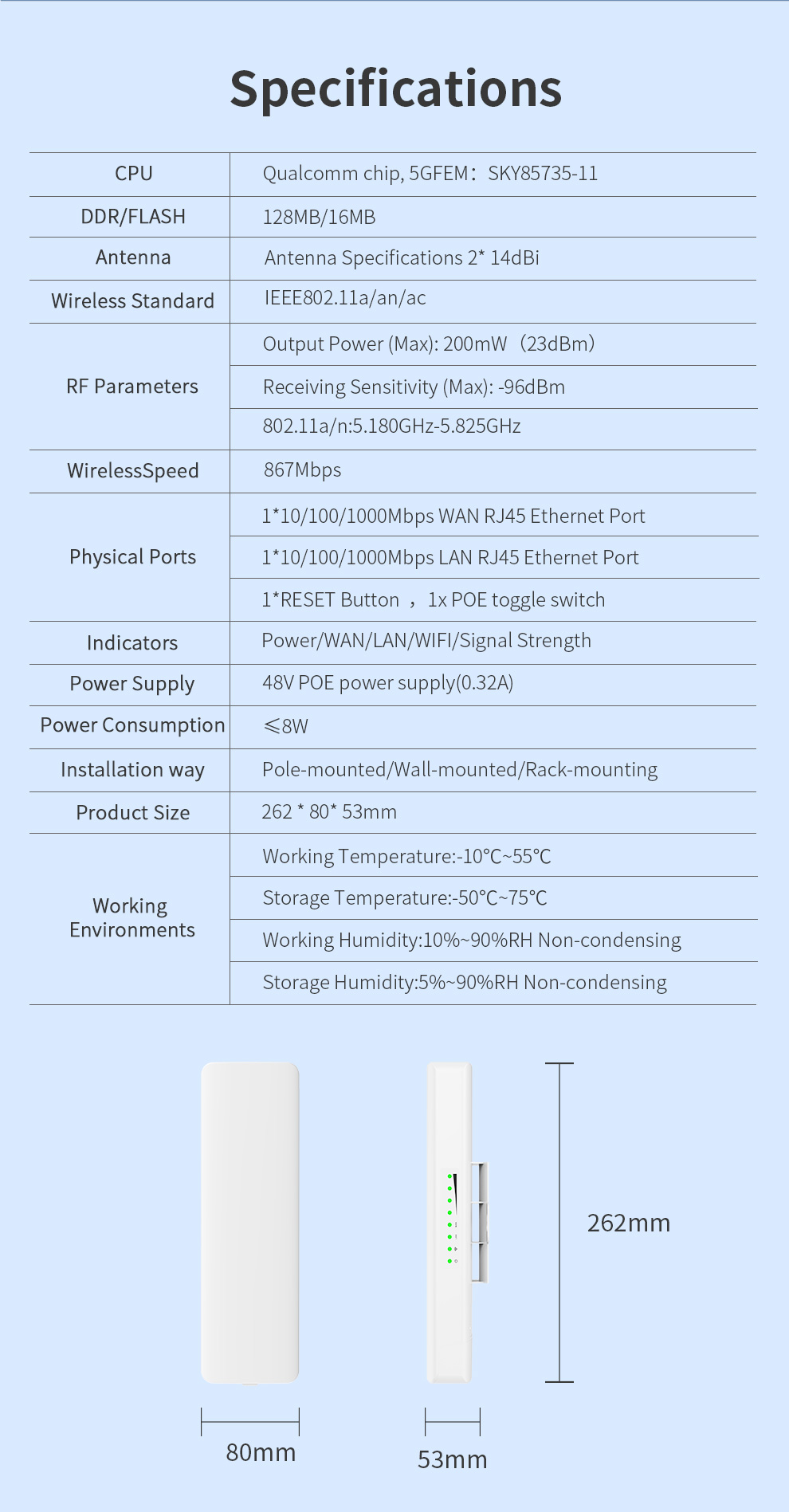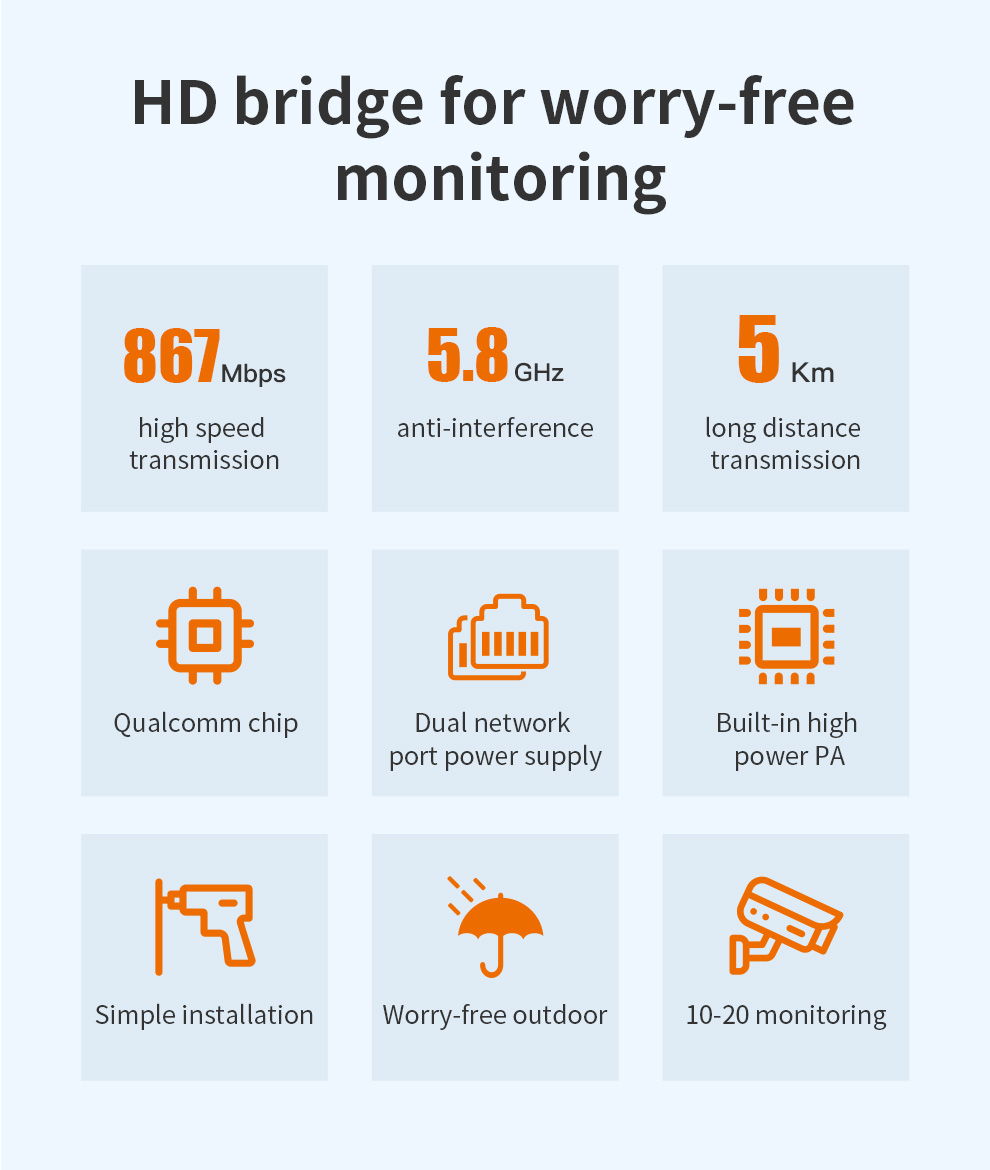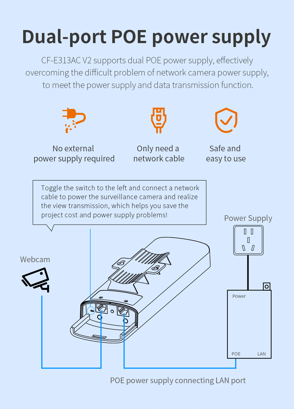 The CF-E313AC V2 is an 867Mbps HD outdoor surveillance bridge operating in the interference-resistant 5.8GHz band with a 5km transmission range. Featuring Qualcomm triple-core chipset and integrated power amplifier, it ensures stable HD video transmission. With dual-port PoE support for powering multiple cameras, it’s an ideal solution for outdoor monitoring projects in scenic areas, ports, and oil fields.