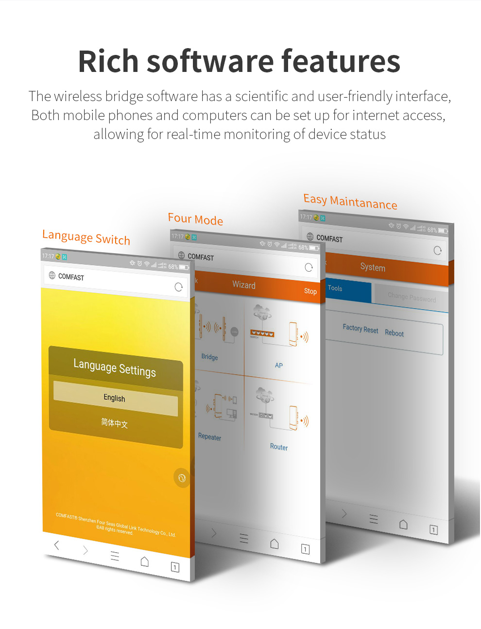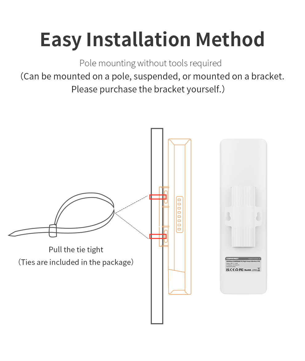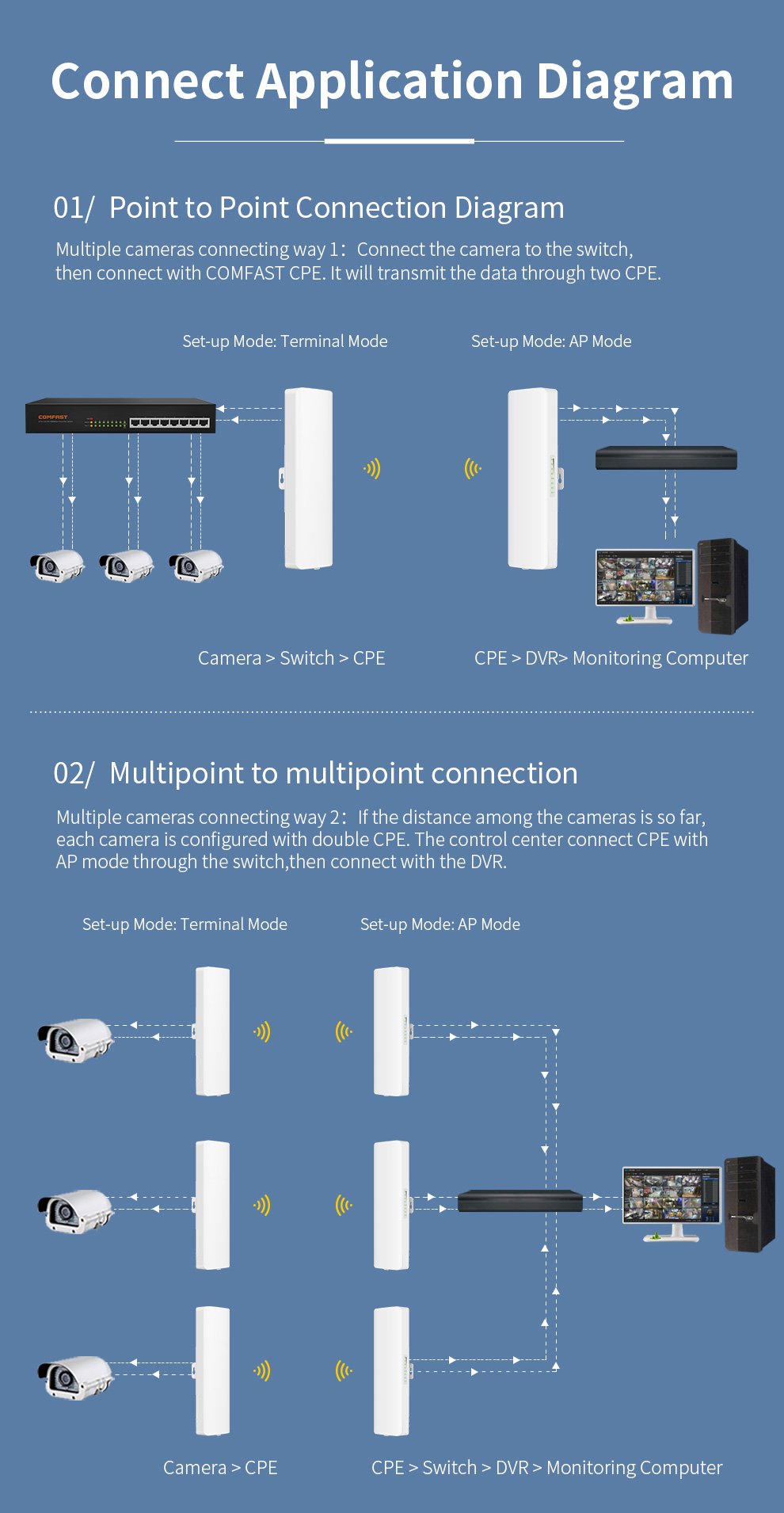 *The product images and demonstration scenarios on this page are for illustrative purposes only and may have slight differences from the actual product. Please refer to the physical product for accuracy. *The data on this page are theoretical values obtained from COMFAST’s internal laboratory under specific testing conditions. Actual usage may vary due to individual product differences, software versions, usage conditions, and environmental factors. Please refer to real-world usage for accurate representation. *To provide as accurate product information, specifications, and features as possible, COMFAST may periodically adjust and revise the text descriptions, image effects, and other content on this page to ensure alignment with actual product performance, specifications, packaging, and accessories. Should such adjustments or revisions become necessary, no prior notice will be provided.