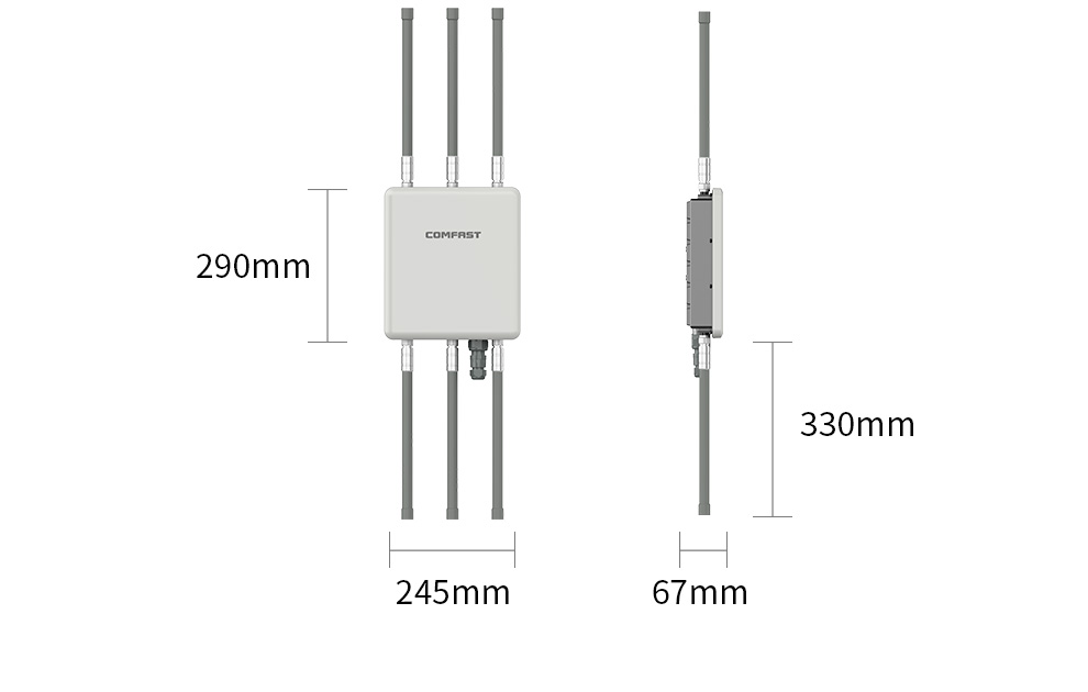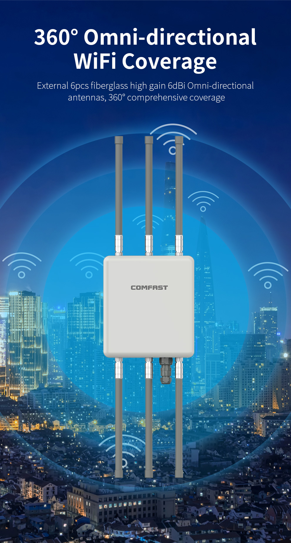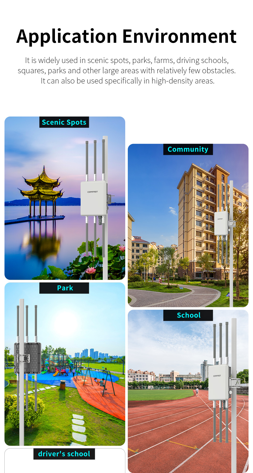 *The product images and demonstration scenarios on this page are for illustrative purposes only and may have slight differences from the actual product. Please refer to the physical product for accuracy. *The data on this page are theoretical values obtained from COMFAST’s internal laboratory under specific testing conditions. Actual usage may vary due to individual product differences, software versions, usage conditions, and environmental factors. Please refer to real-world usage for accurate representation. *To provide as accurate product information, specifications, and features as possible, COMFAST may periodically adjust and revise the text descriptions, image effects, and other content on this page to ensure alignment with actual product performance, specifications, packaging, and accessories. Should such adjustments or revisions become necessary, no prior notice will be provided.