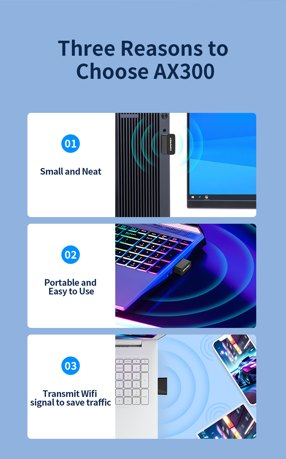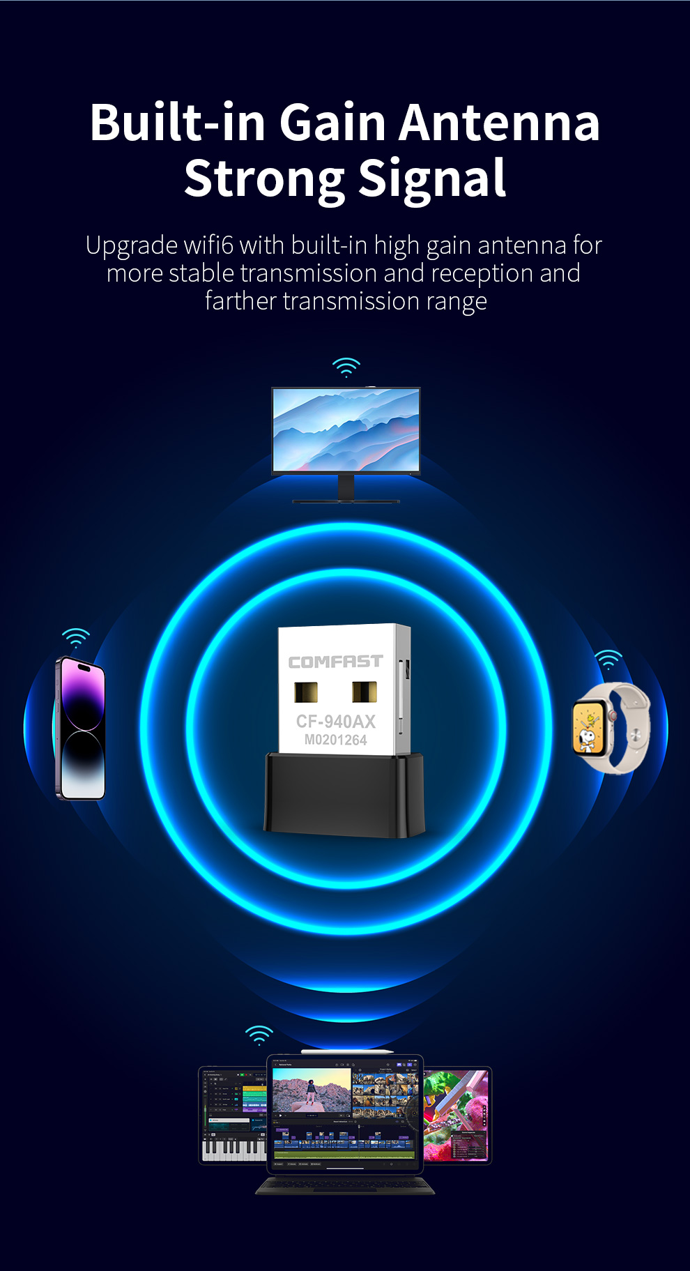 The CF-940AX is an ultra-compact USB WiFi 6 adapter, delivering wireless speeds up to 286Mbps. Featuring driver-free installation for true plug-and-play convenience and a Soft AP mode, it effortlessly provides stable, high-speed network connectivity for your desktop or laptop.