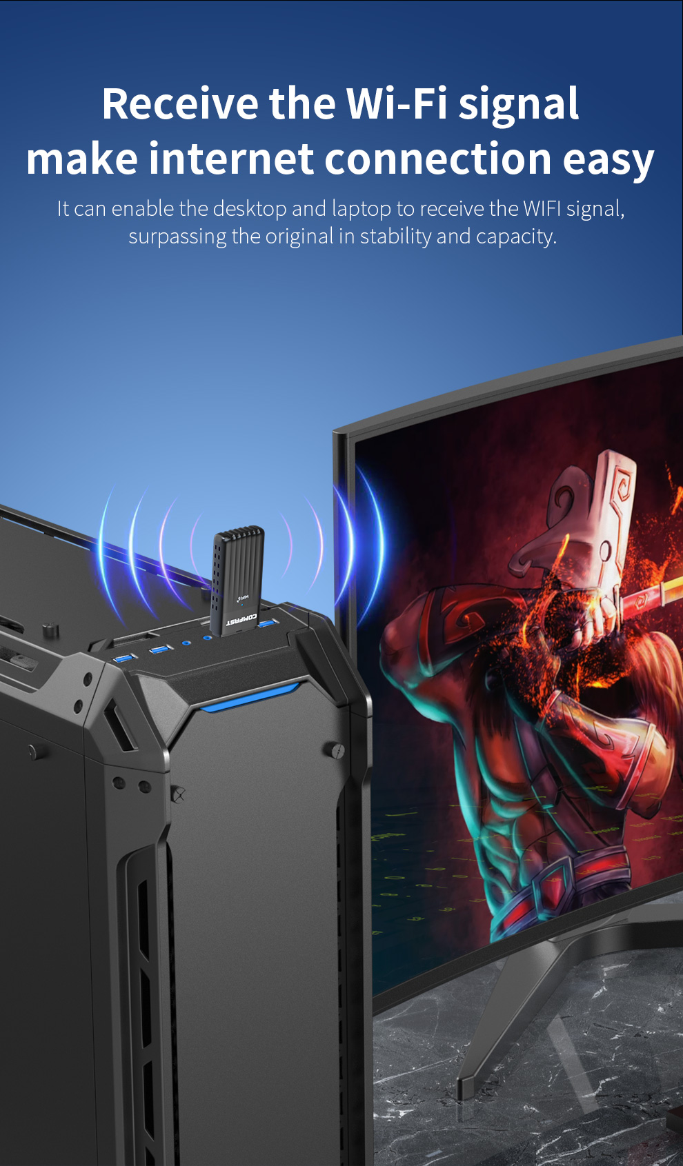 It can enable the desktop and laptop to receive the WIFI signal, surpassing the original in stability and capacity.