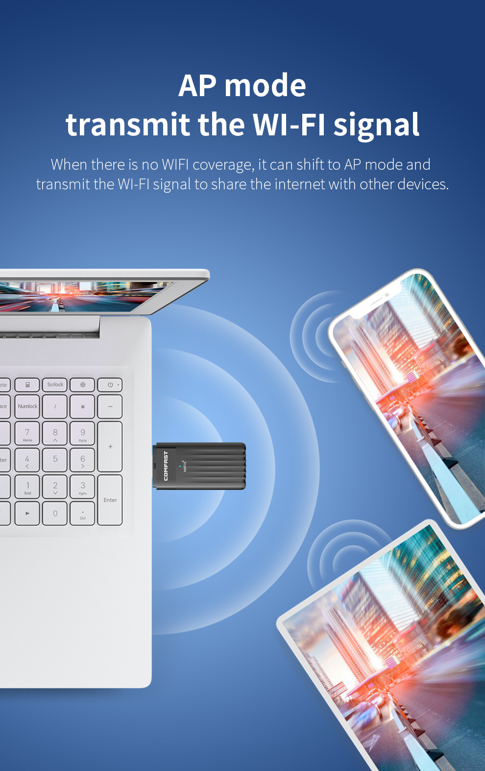 When there is no WIFI coverage, it can shift to AP mode and transmit the WI-FI signal to share the internet with other devices.