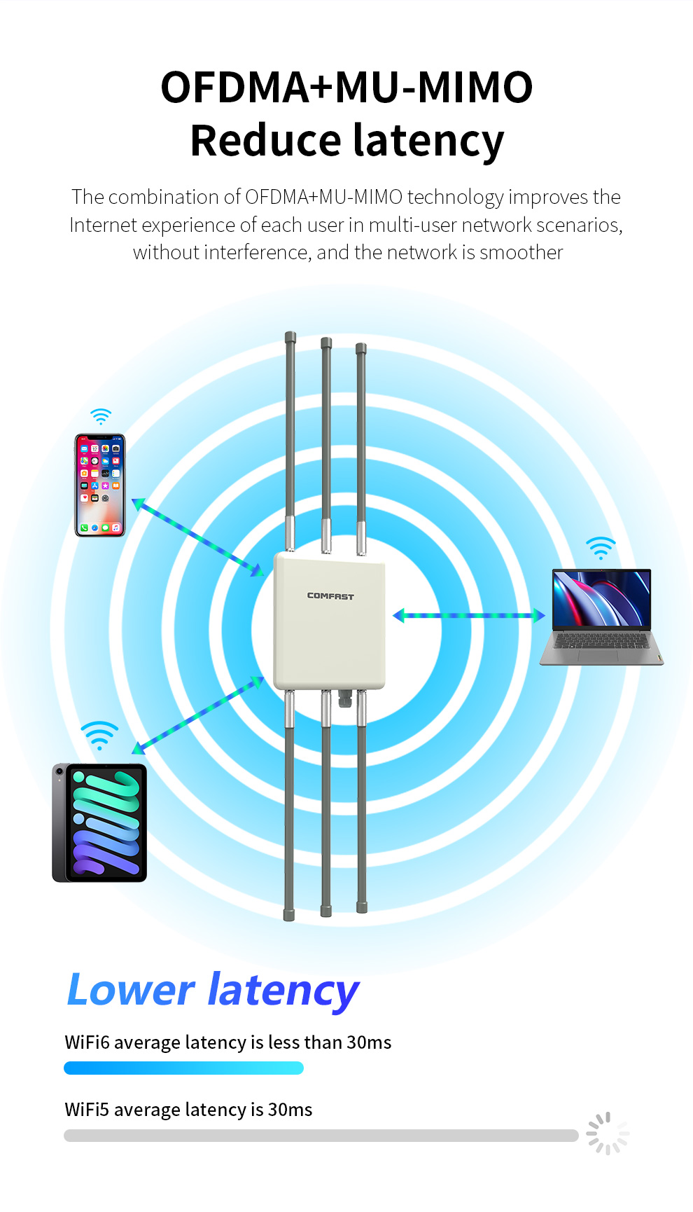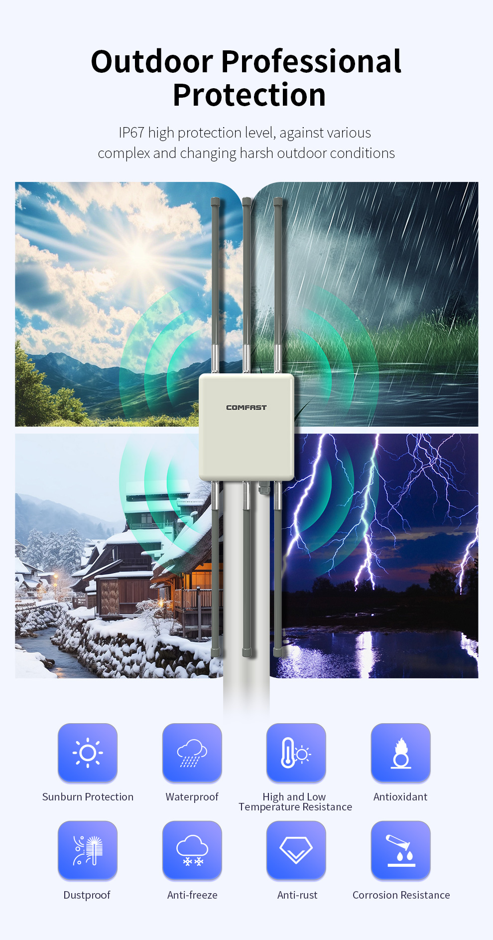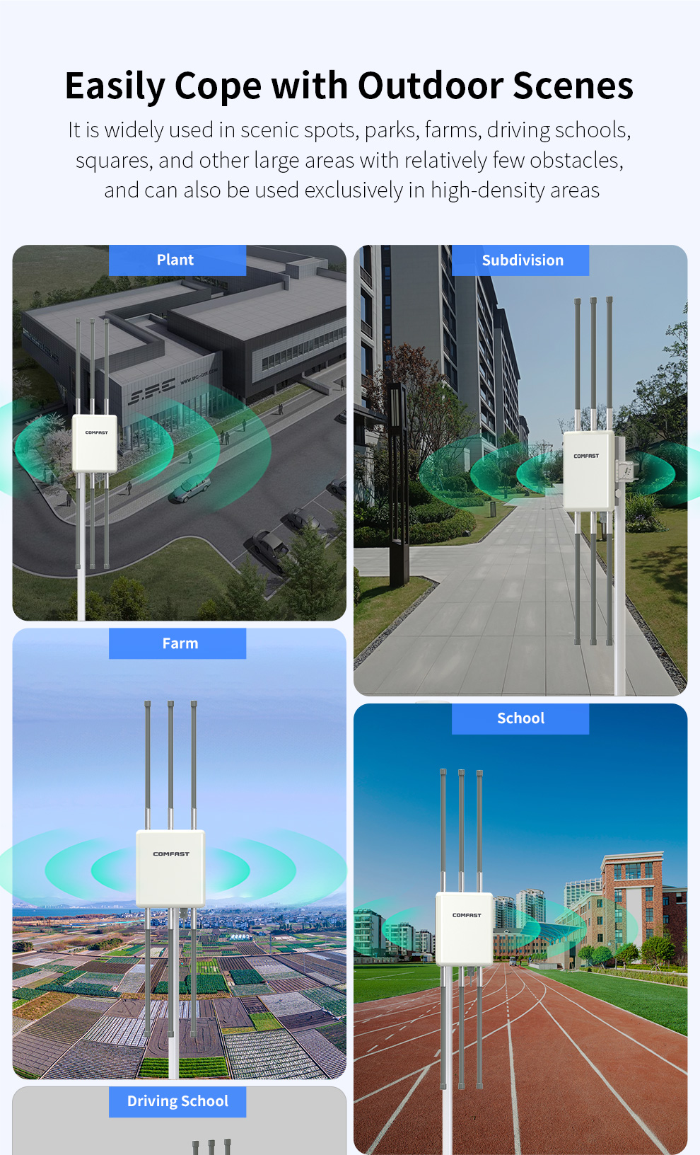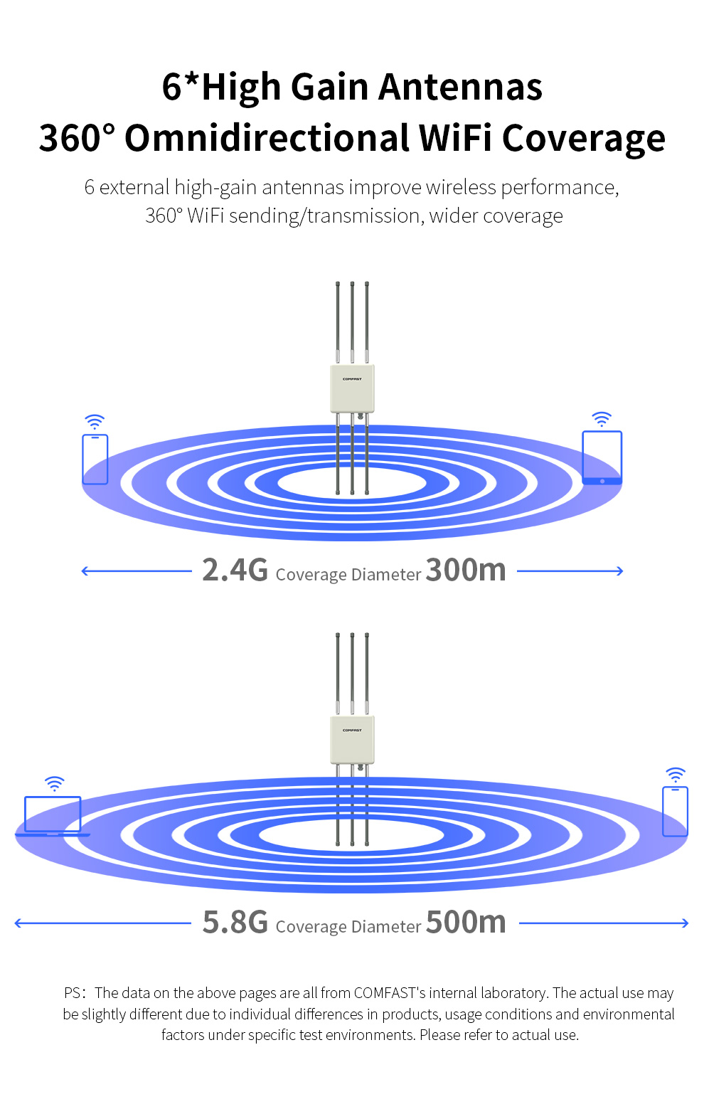 *The product images and demonstration scenarios on this page are for illustrative purposes only and may have slight differences from the actual product. Please refer to the physical product for accuracy. *The data on this page are theoretical values obtained from COMFAST’s internal laboratory under specific testing conditions. Actual usage may vary due to individual product differences, software versions, usage conditions, and environmental factors. Please refer to real-world usage for accurate representation. *To provide as accurate product information, specifications, and features as possible, COMFAST may periodically adjust and revise the text descriptions, image effects, and other content on this page to ensure alignment with actual product performance, specifications, packaging, and accessories. Should such adjustments or revisions become necessary, no prior notice will be provided.