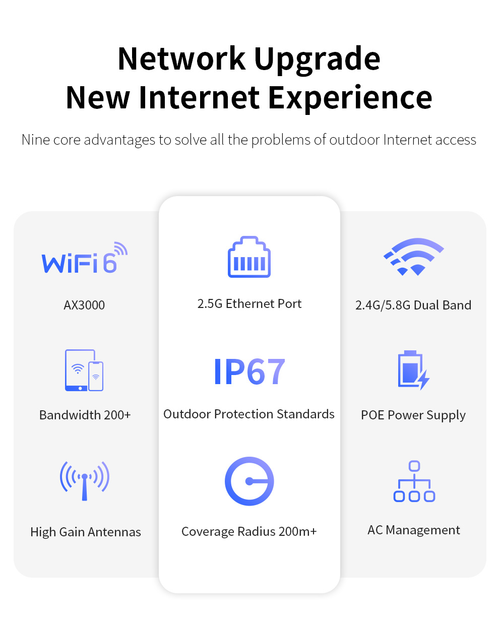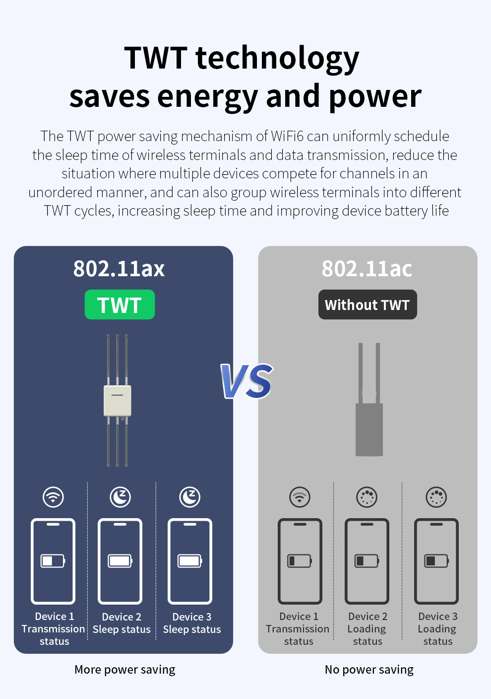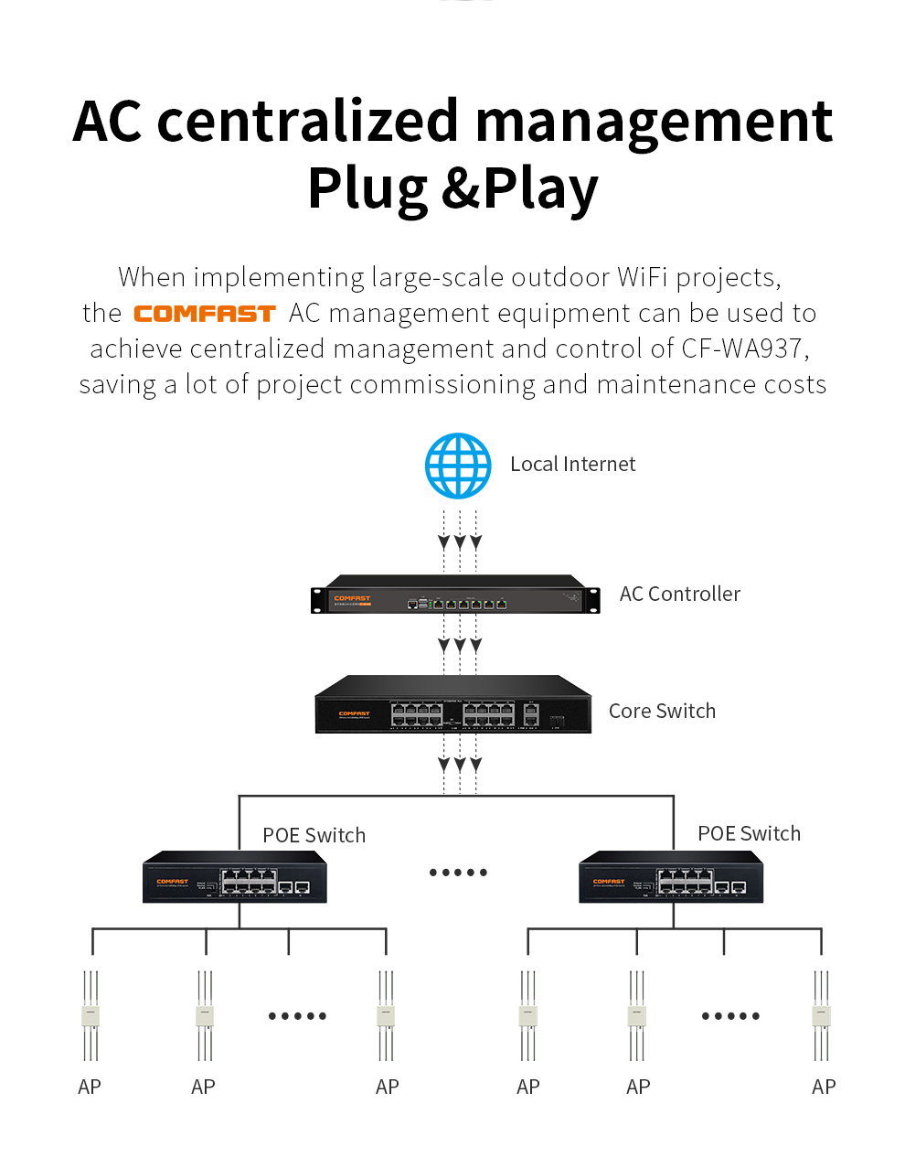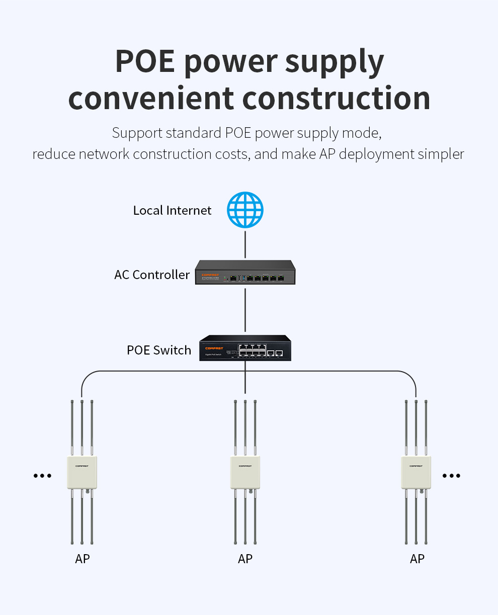*The product images and demonstration scenarios on this page are for illustrative purposes only and may have slight differences from the actual product. Please refer to the physical product for accuracy. *The data on this page are theoretical values obtained from COMFAST’s internal laboratory under specific testing conditions. Actual usage may vary due to individual product differences, software versions, usage conditions, and environmental factors. Please refer to real-world usage for accurate representation. *To provide as accurate product information, specifications, and features as possible, COMFAST may periodically adjust and revise the text descriptions, image effects, and other content on this page to ensure alignment with actual product performance, specifications, packaging, and accessories. Should such adjustments or revisions become necessary, no prior notice will be provided.